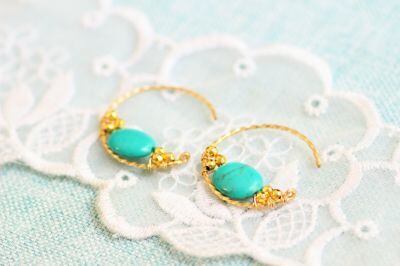ツルッとしたオーバルの天然ターコイズがメインのピアスです。