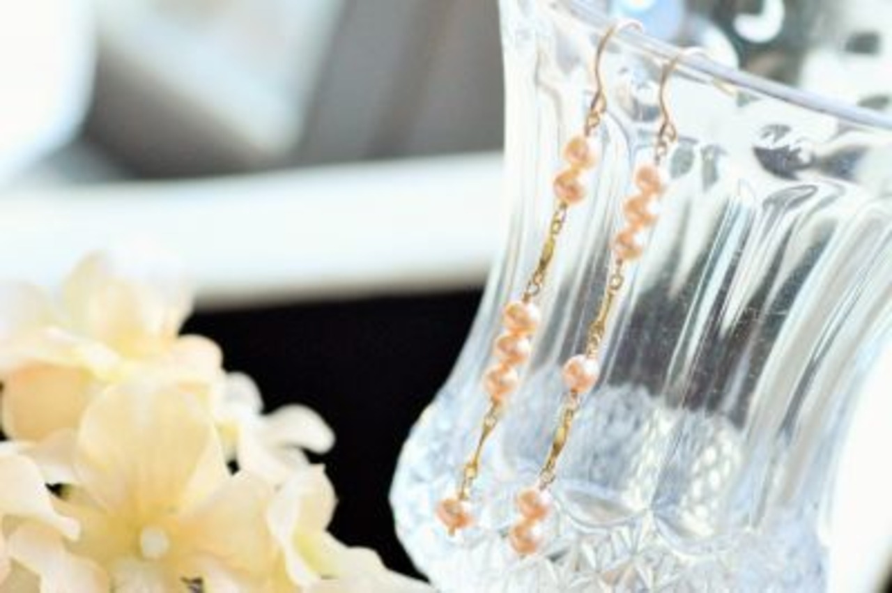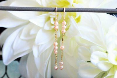 艶のある上質、ほんのりピンク色の淡水パールのロングピアスです。