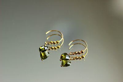 オリーブグリーンの、キュービックジルコニアのハート型にゴールドビーズをあしらったピアスです。