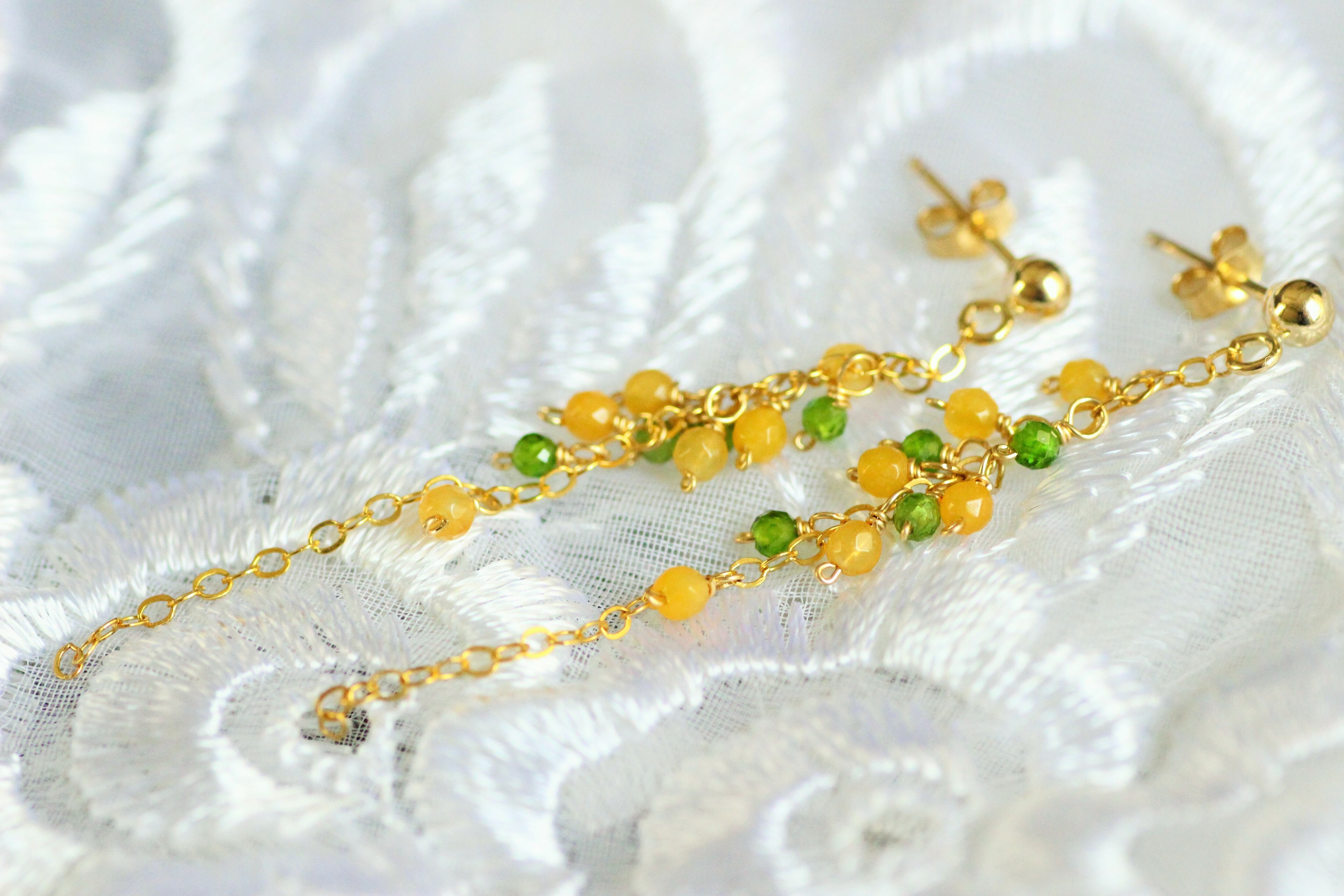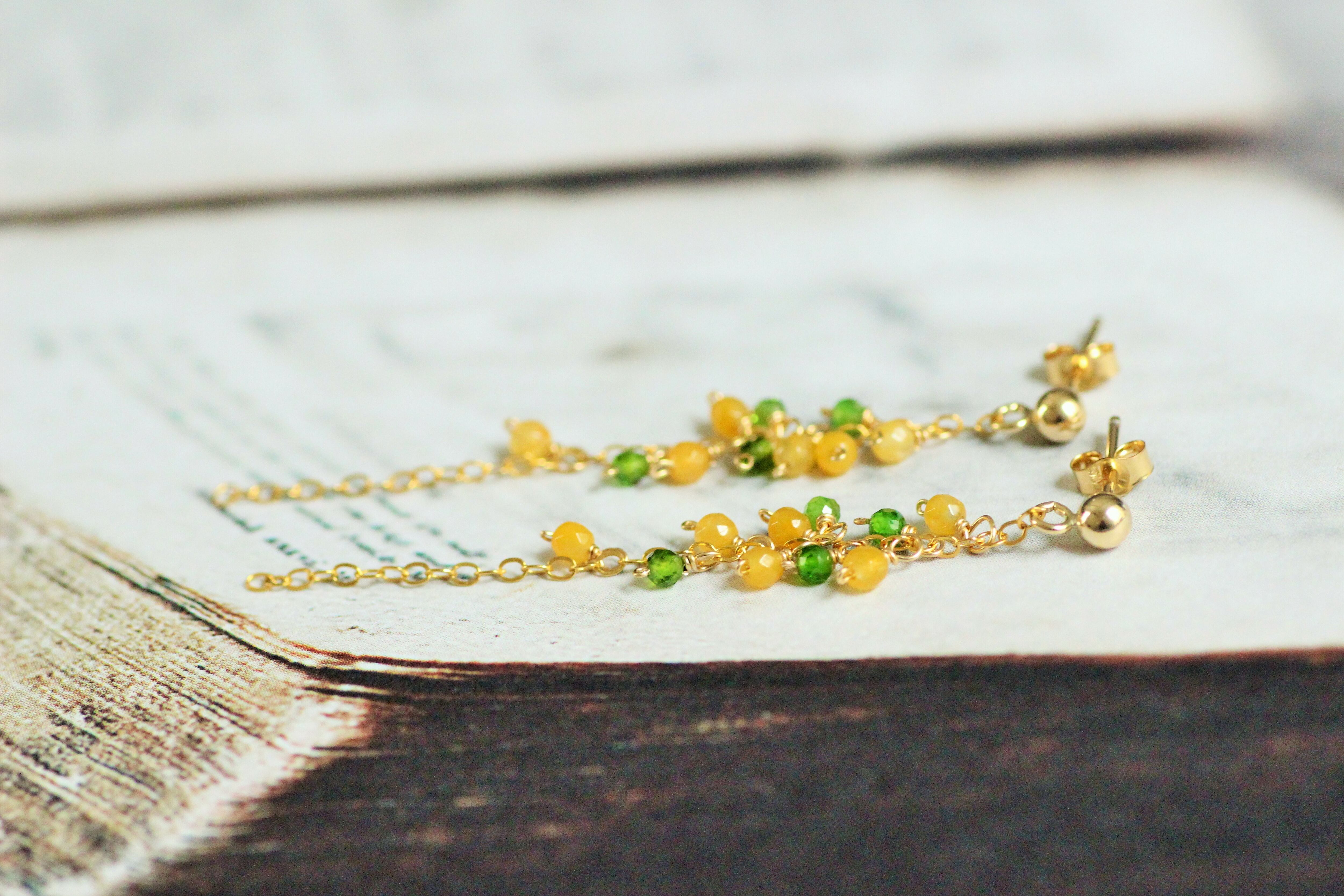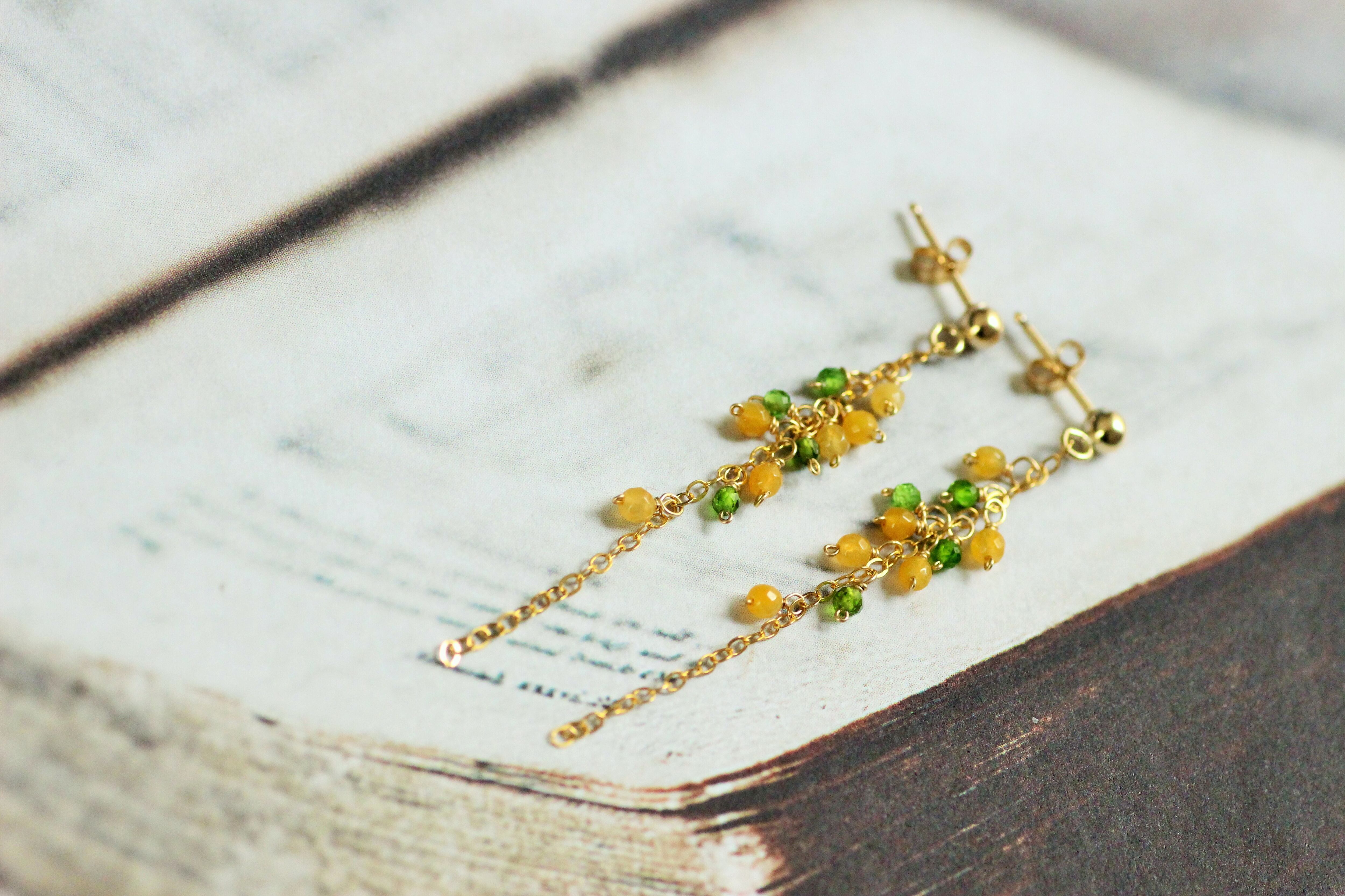 小さなイエロー&グリーンの天然石が耳元で輝き、