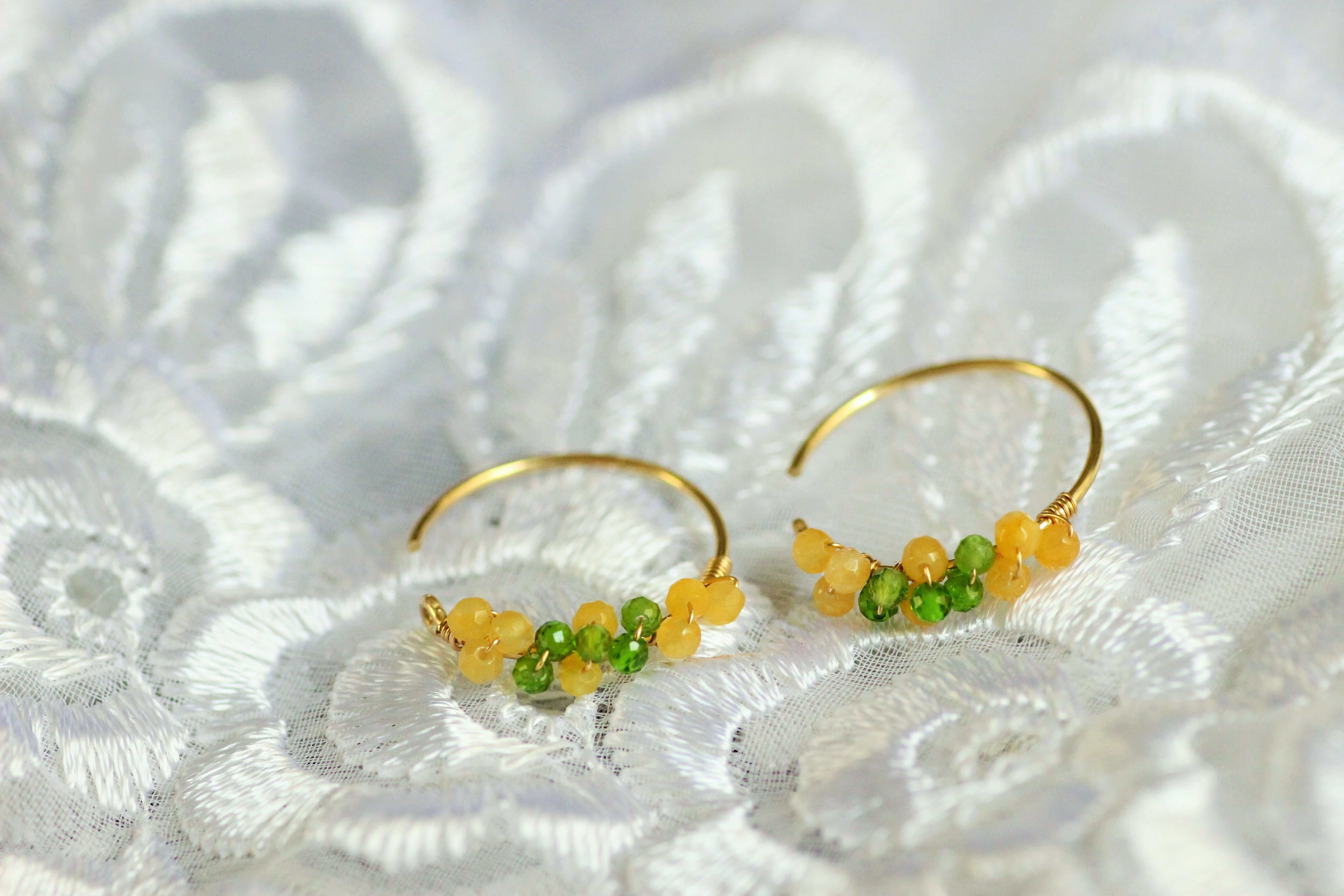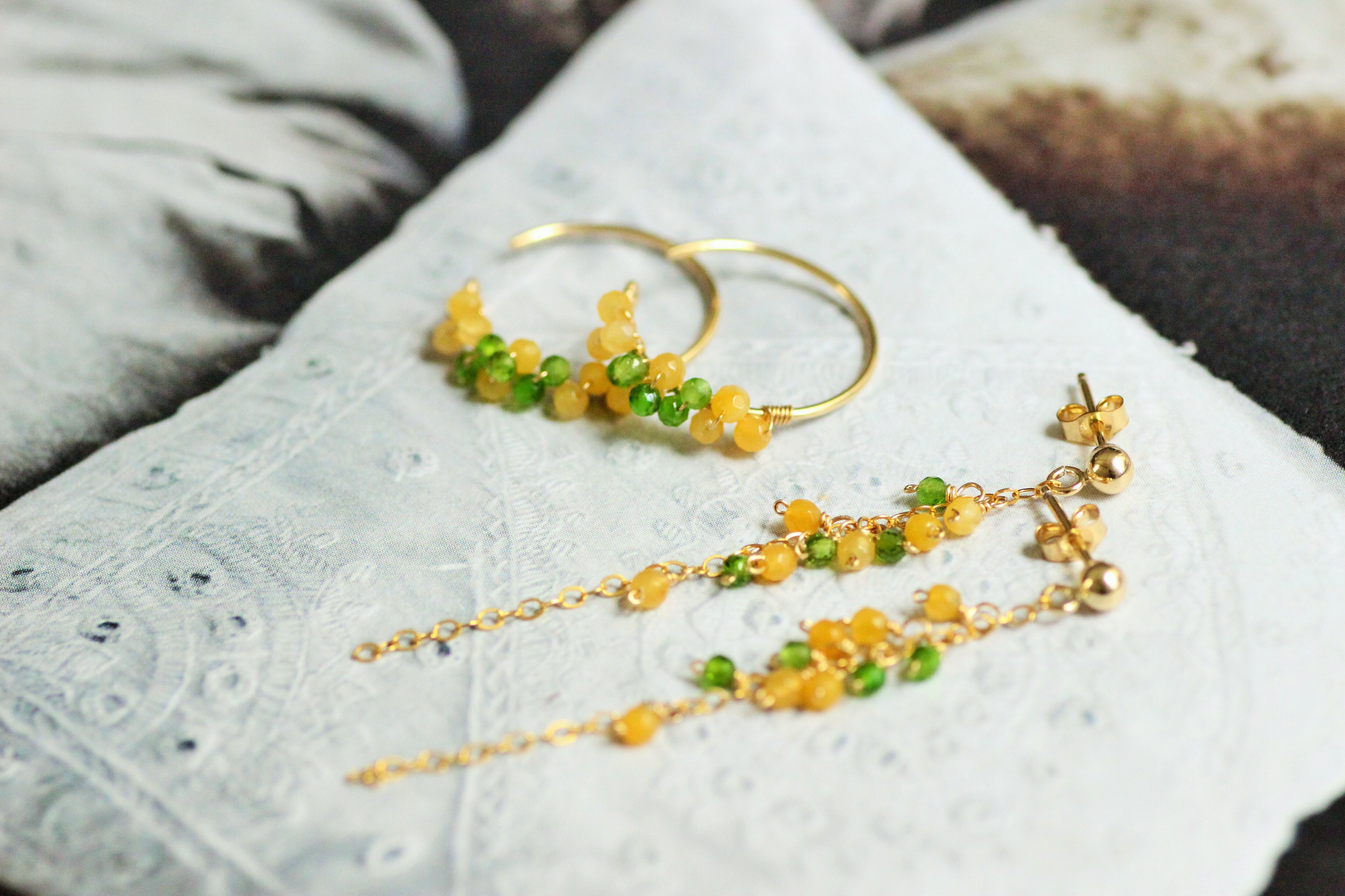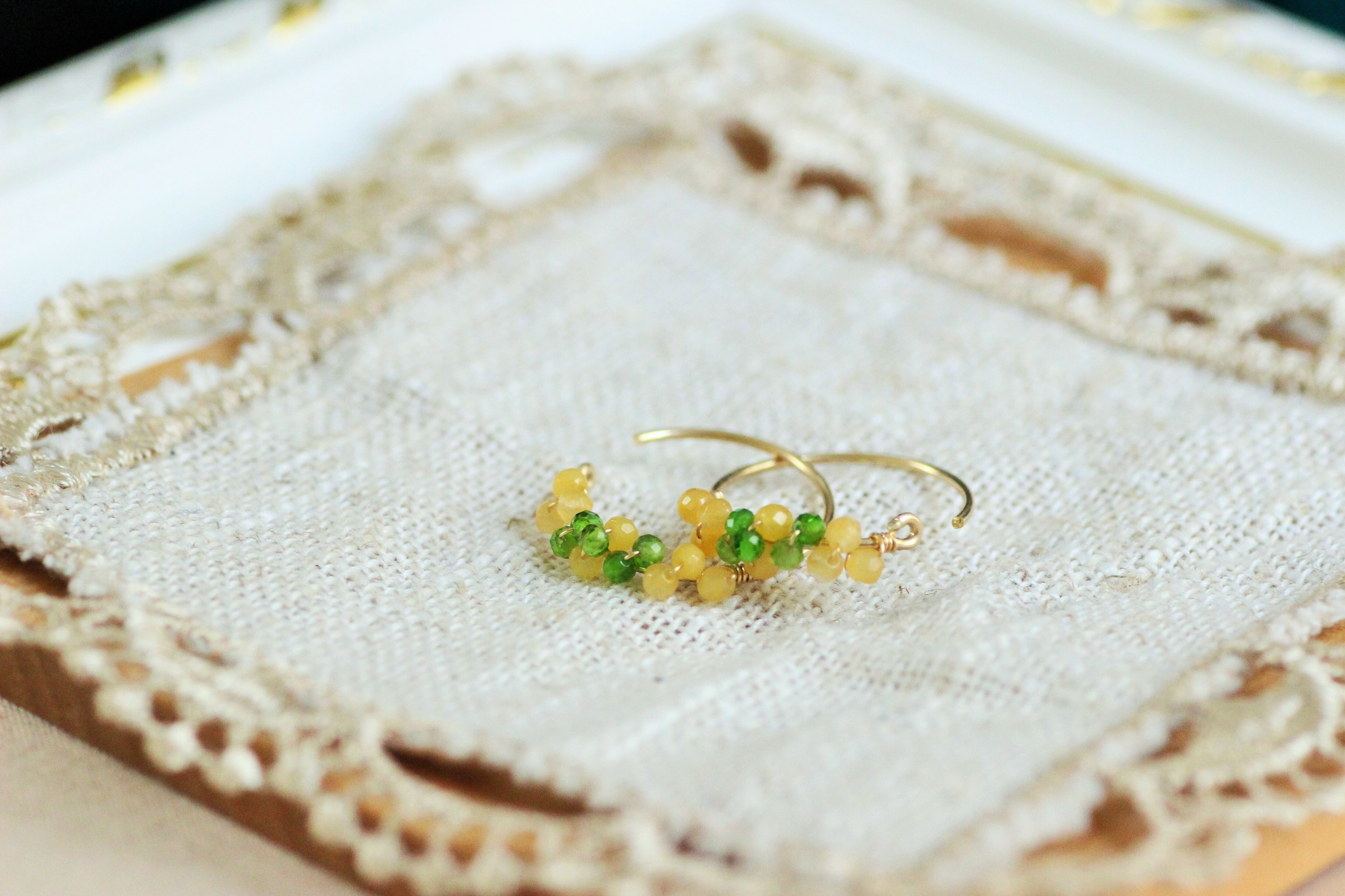小さなイエロー&グリーンの天然石が耳元で輝き、