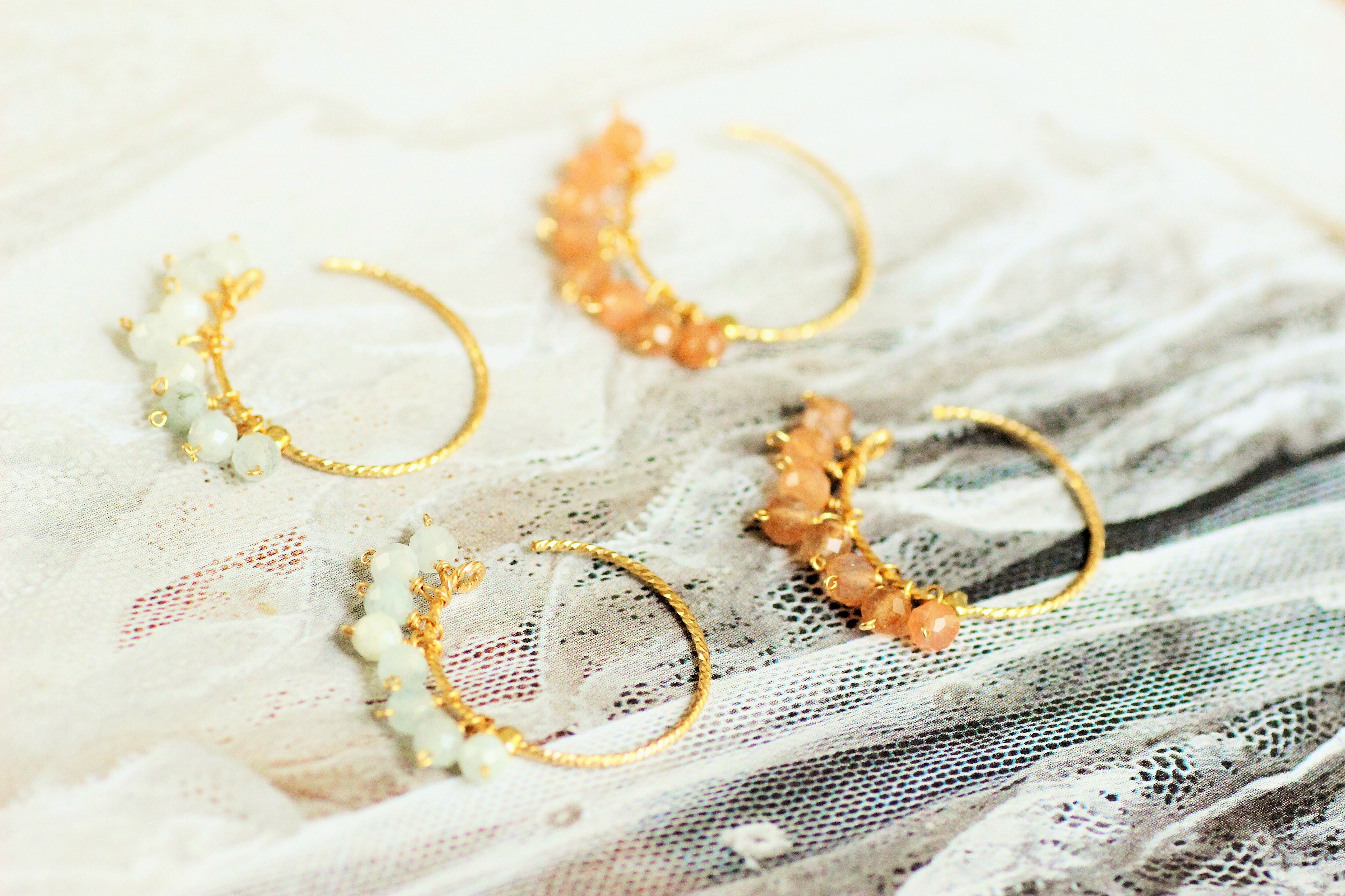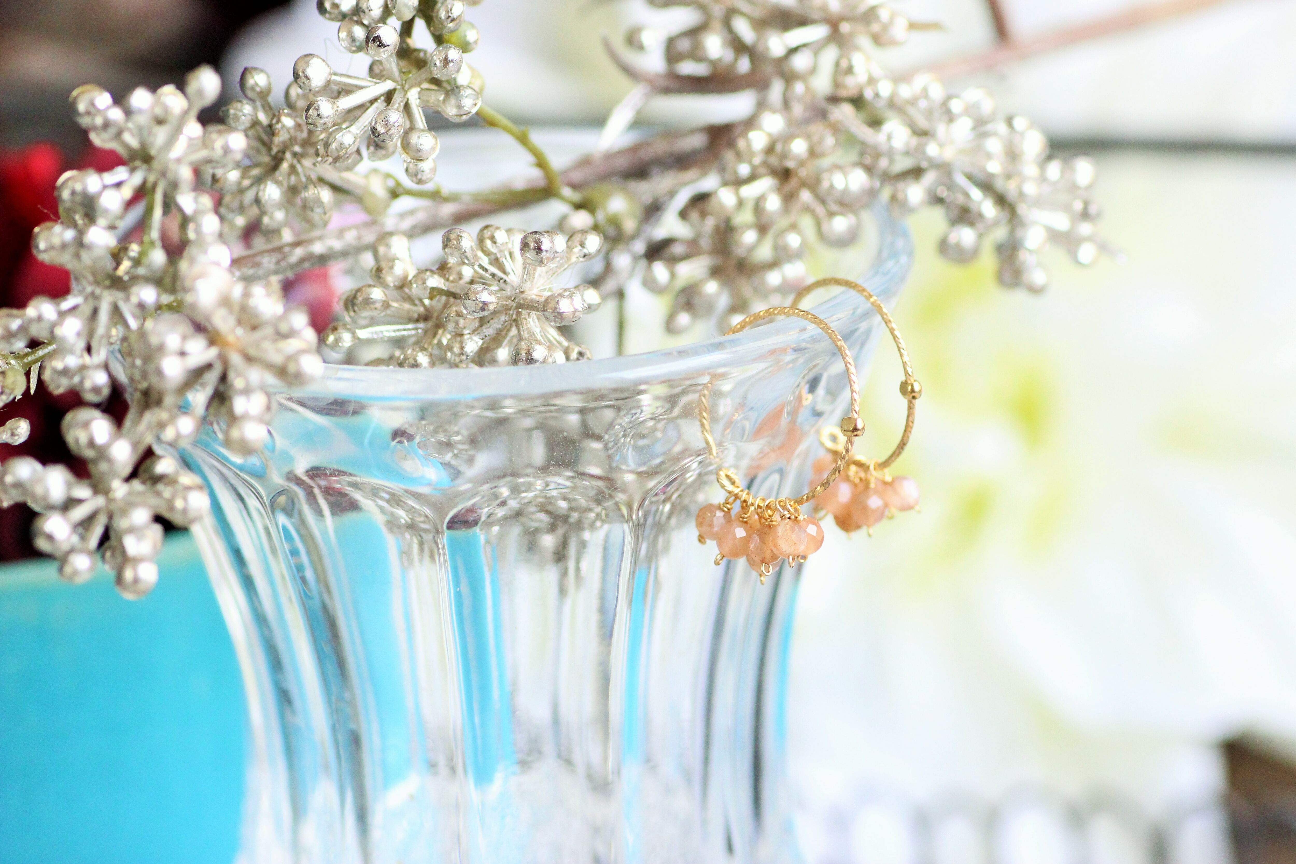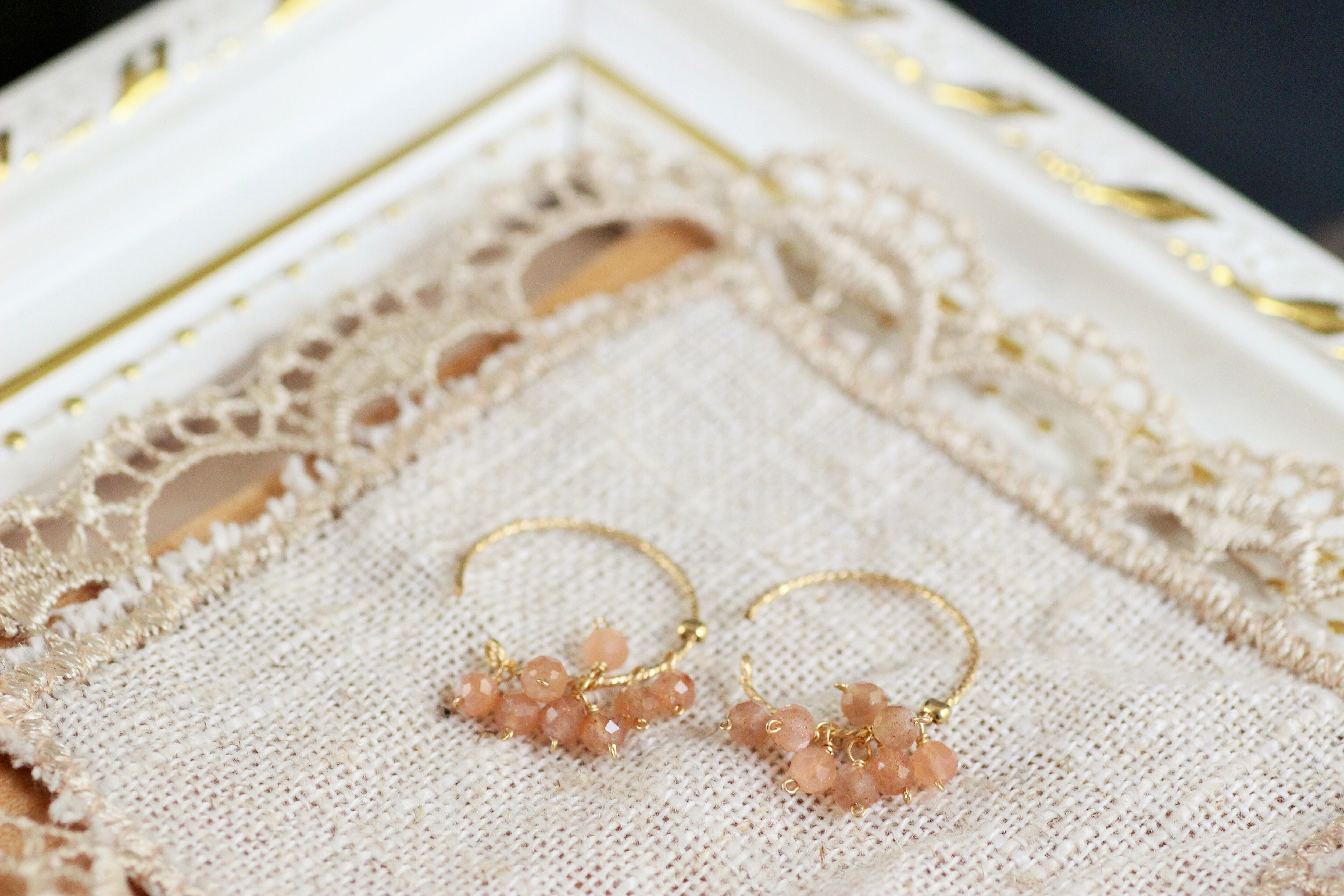 キラキラ加工のミニフープと共に耳元で輝きます。