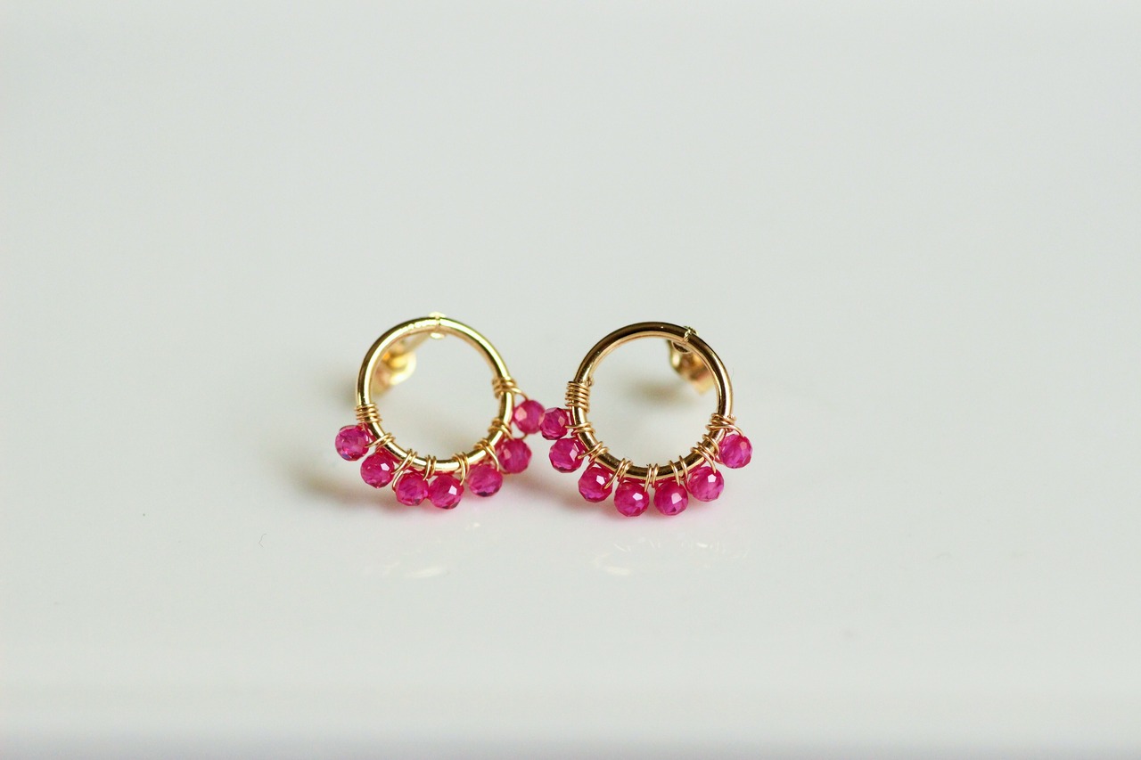 小さくても高級感のある赤い小粒・ルビーで約1cmのサークルを飾ったシンプルなピアスです。