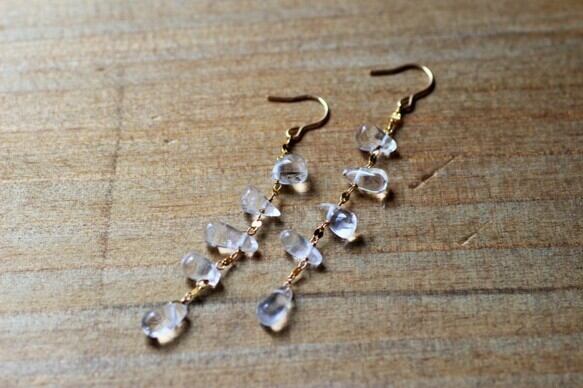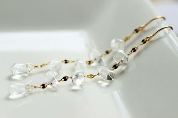 つるんとしたラフドロップのクリスタル(水晶)を繋げたロングピアスです。