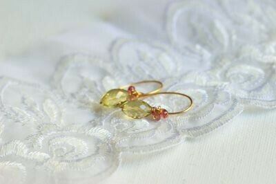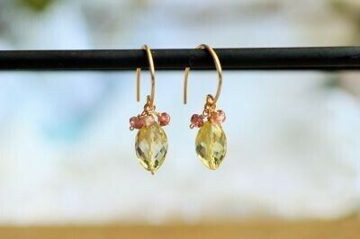 上質な宝石質のレモンクォーツを小さなピンクトルマリンで飾ったピアスです。