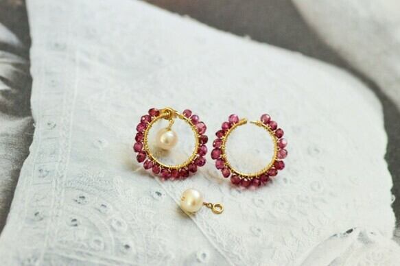 落ち着いたボルドー色の小さなロードライトガーネットをぐるっと一周させたシンプルなサークルピアスです。