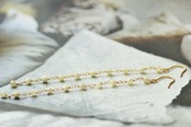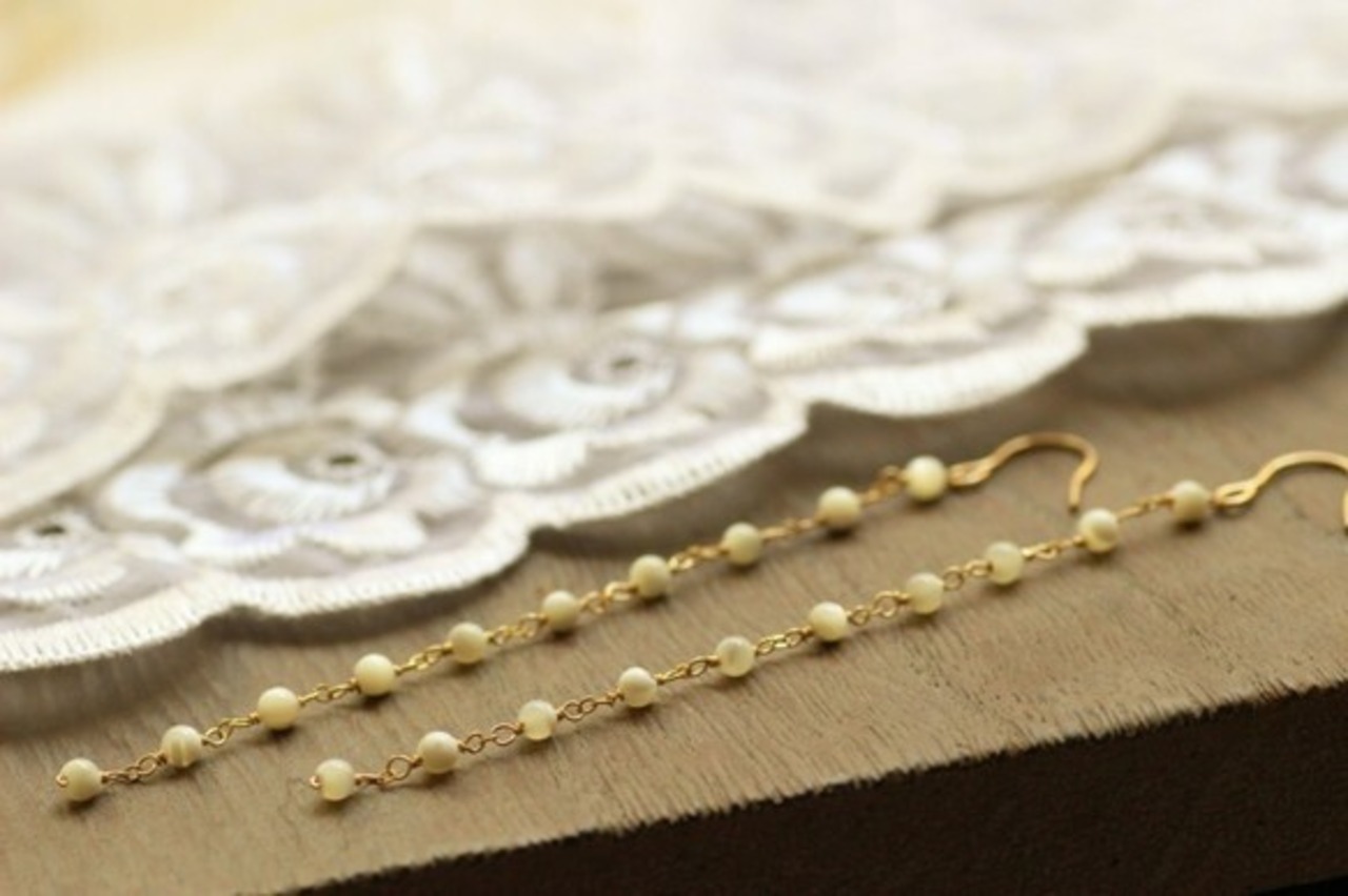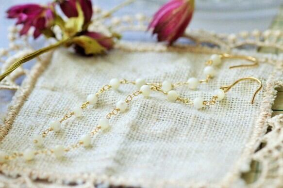 柔らかな女性らしいオフホワイトのMOPを丁寧に繋げた繊細なロングピアスです。