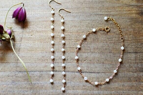 柔らかな女性らしいオフホワイトのMOPを丁寧に繋げた繊細なステーションブレスレットです。