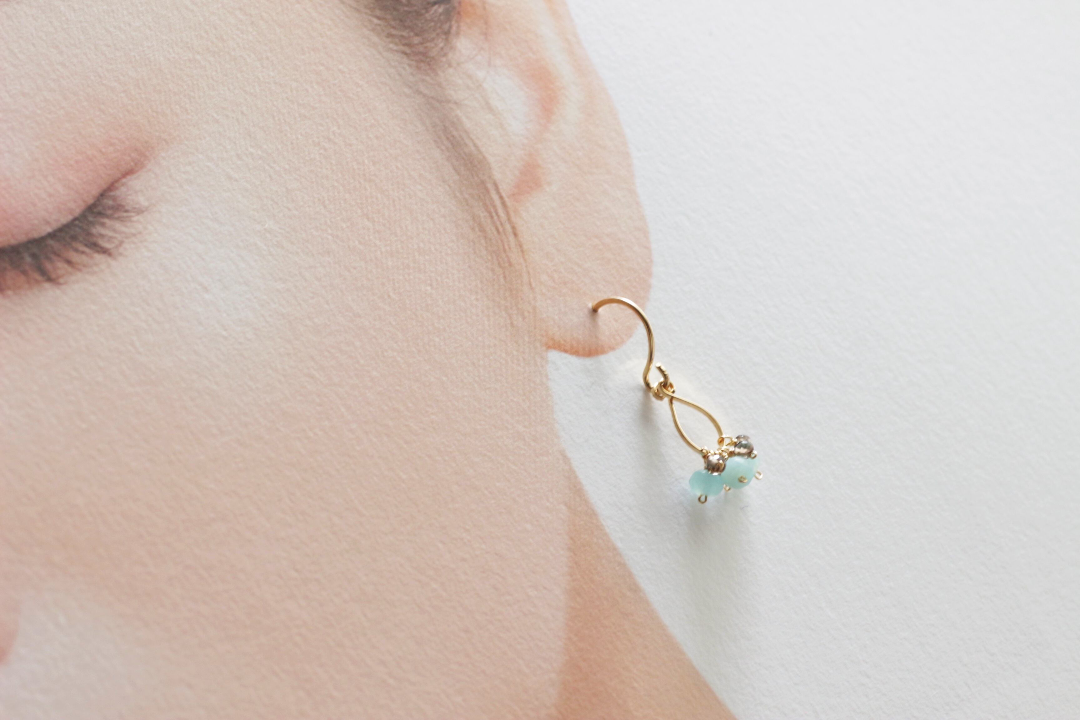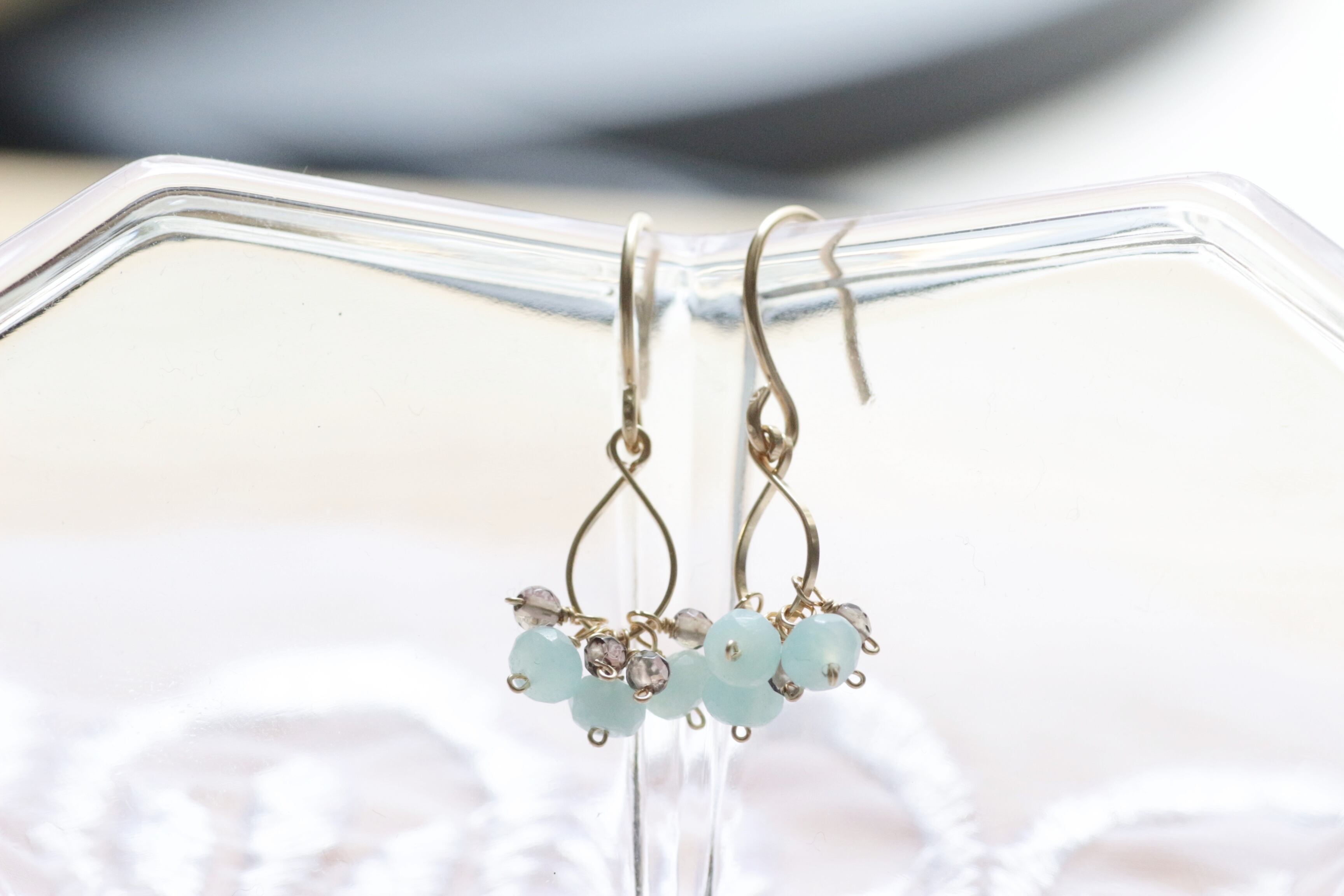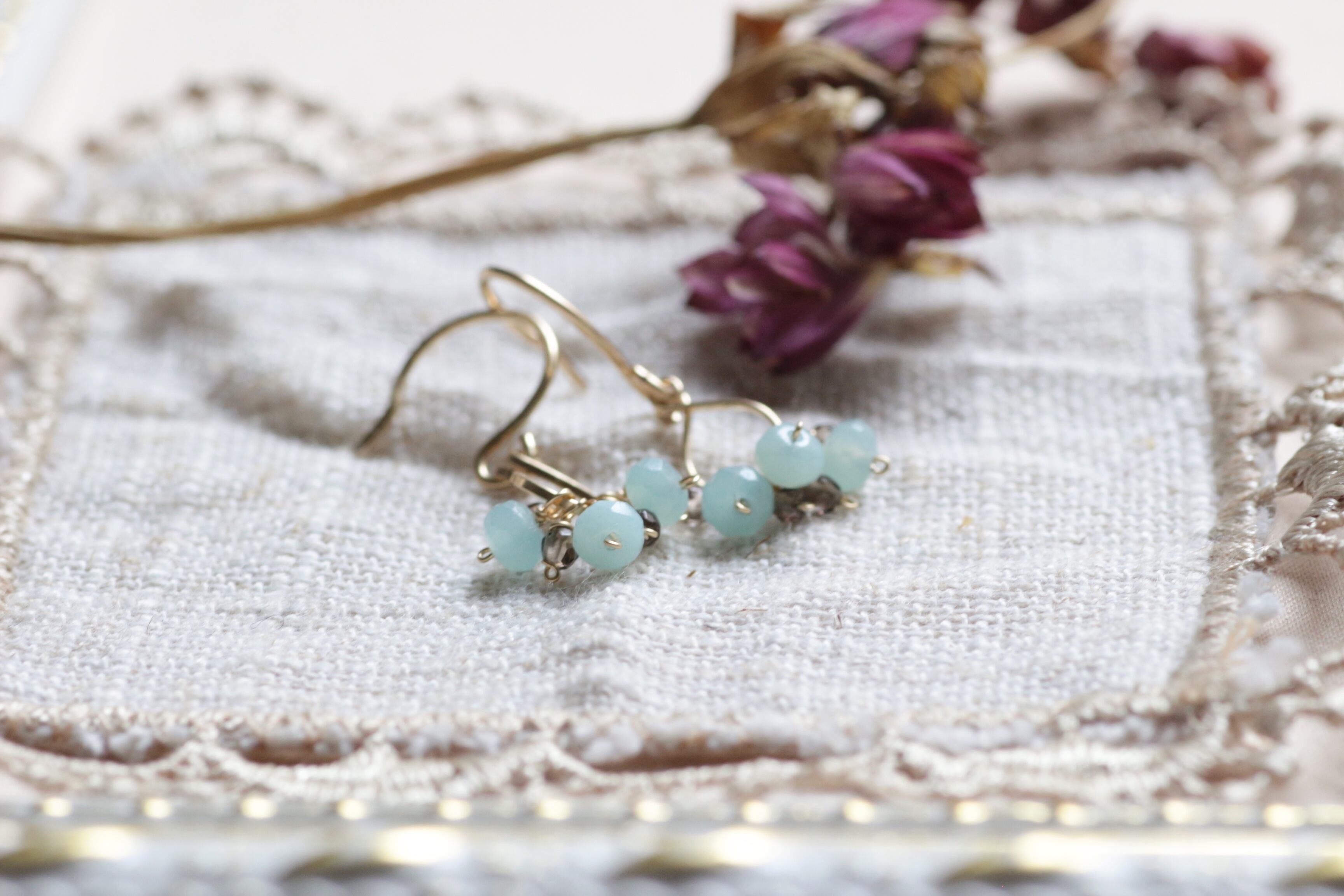 ミントブルーのアマゾナイトと、極小サイズのチョコチップの様なスモーキークォーツの小さなモチーフのピアスです。