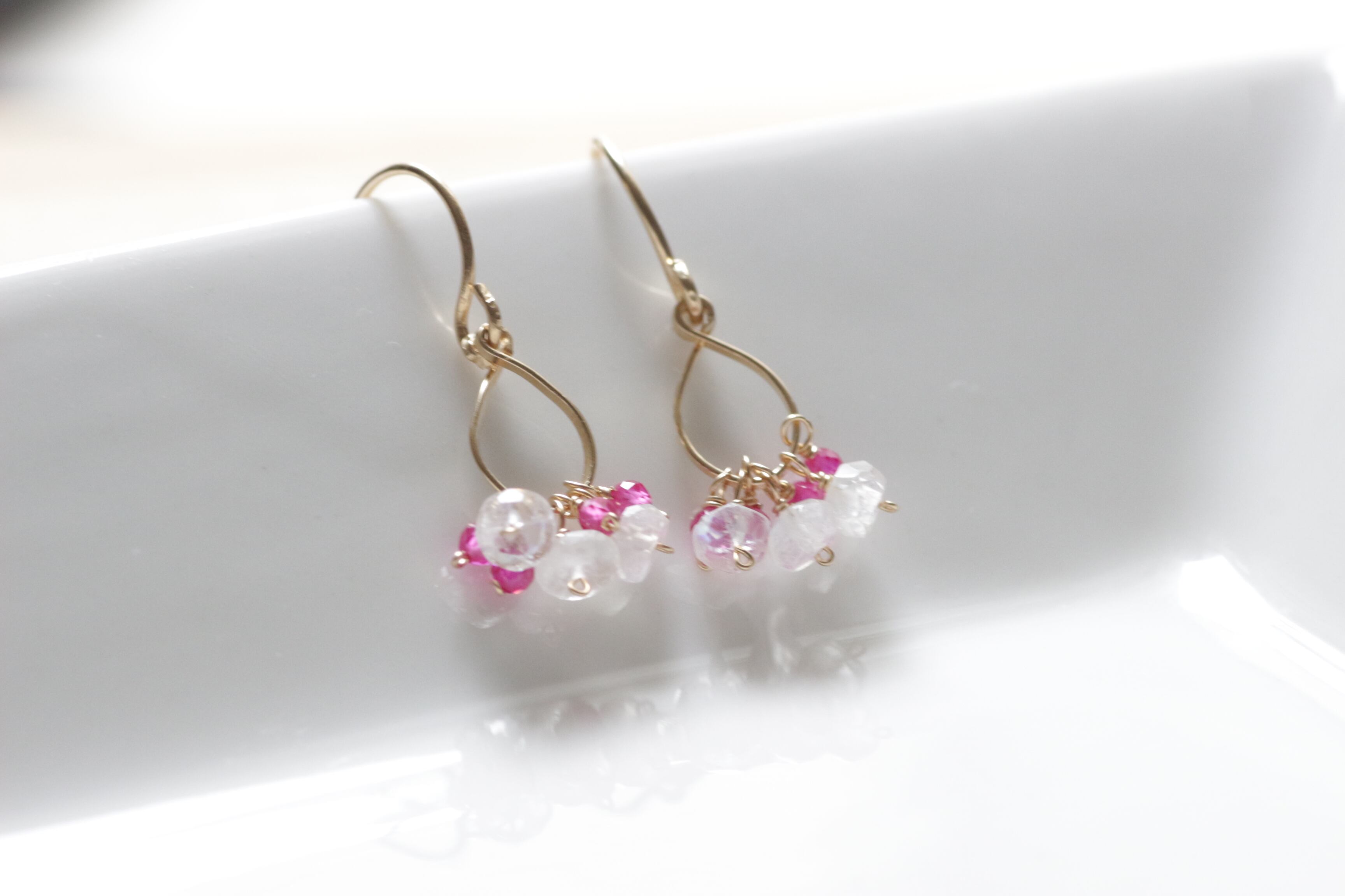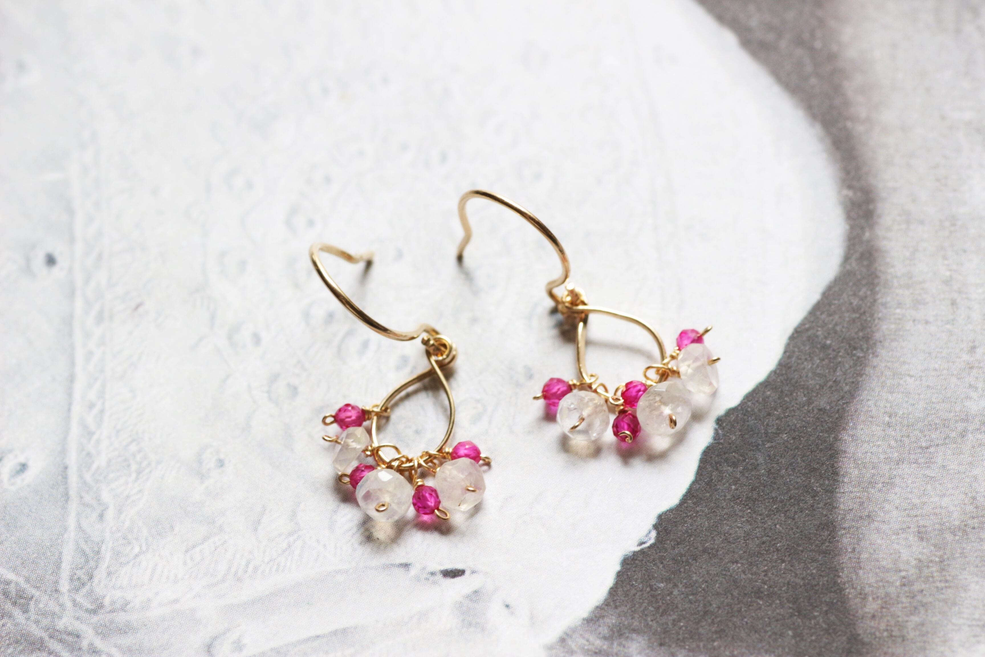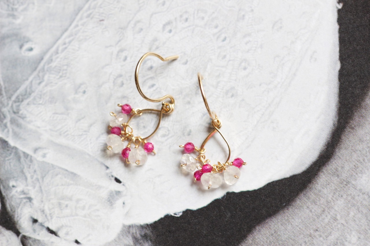 神秘的に角度によって輝くシラーをお楽しみいただけるブルームーンストーンと、極小サイズのビビットカラーのルビーの小さなモチーフのピアスです。