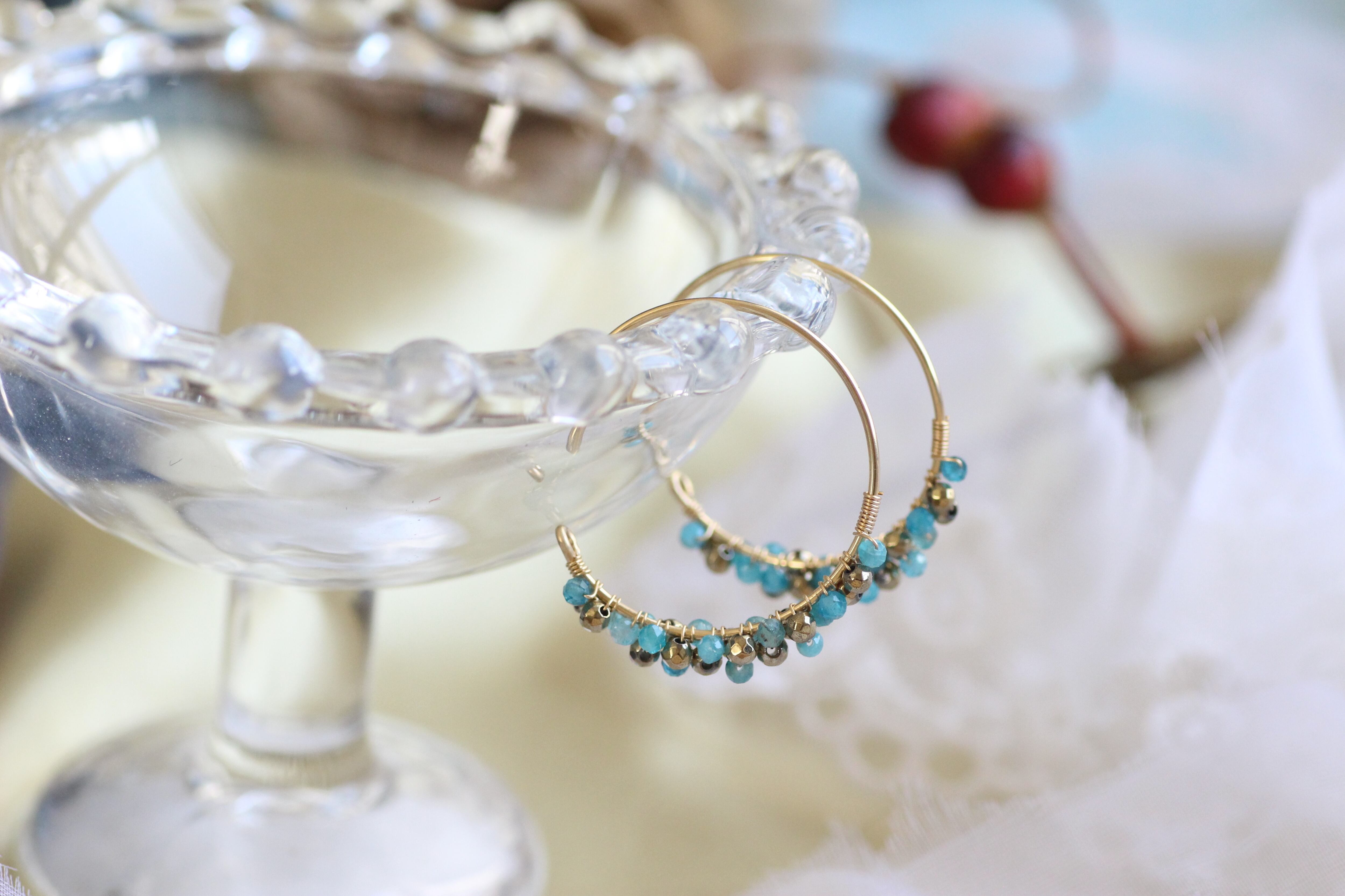 極小のブルーアパタイトと、落ち着いたアンティークゴールドのヘマタイトがぎゅっと集まり、耳元を飾ります。