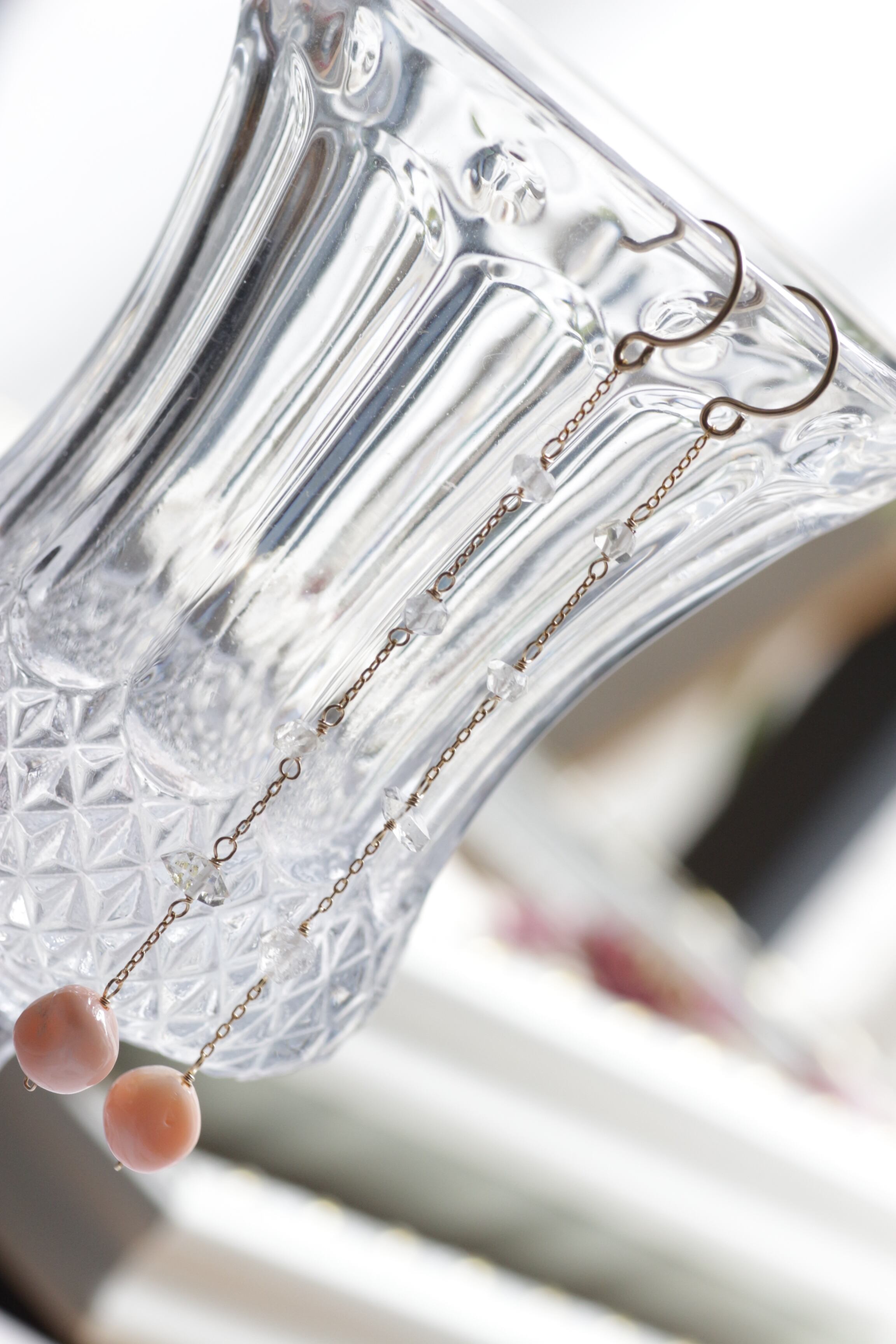 氷の様に涼やかなハーキーマーダイヤモンドを繋げた、ロングピアスです。
