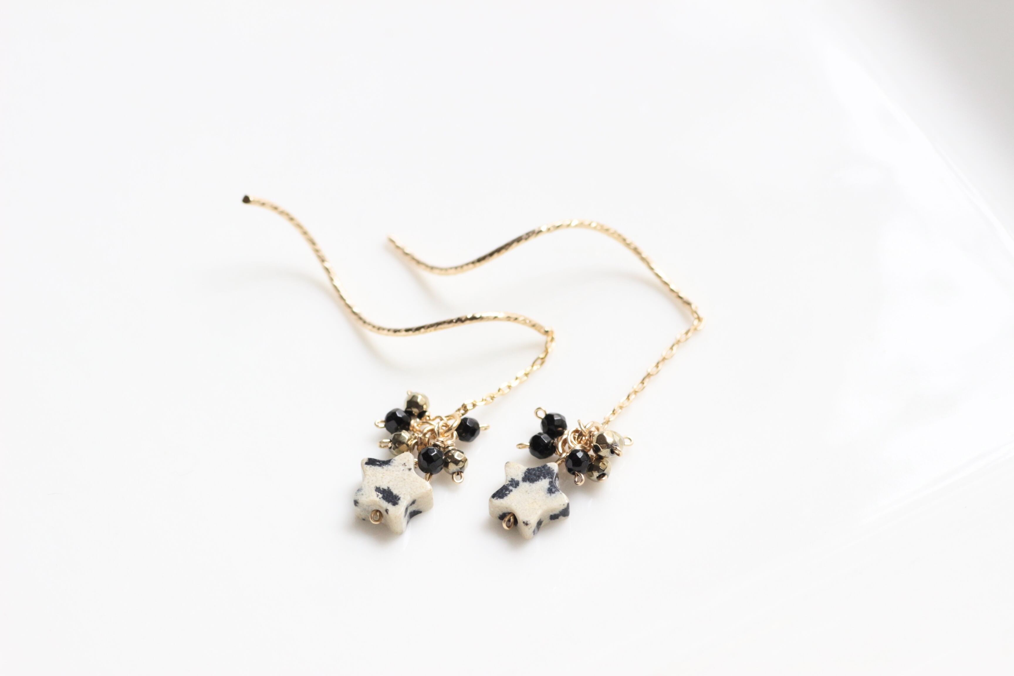 小さな星型のダルメシアンジャスパーを流星をイメージしたウェーブポストのデザインアメリカンピアスピアスです。