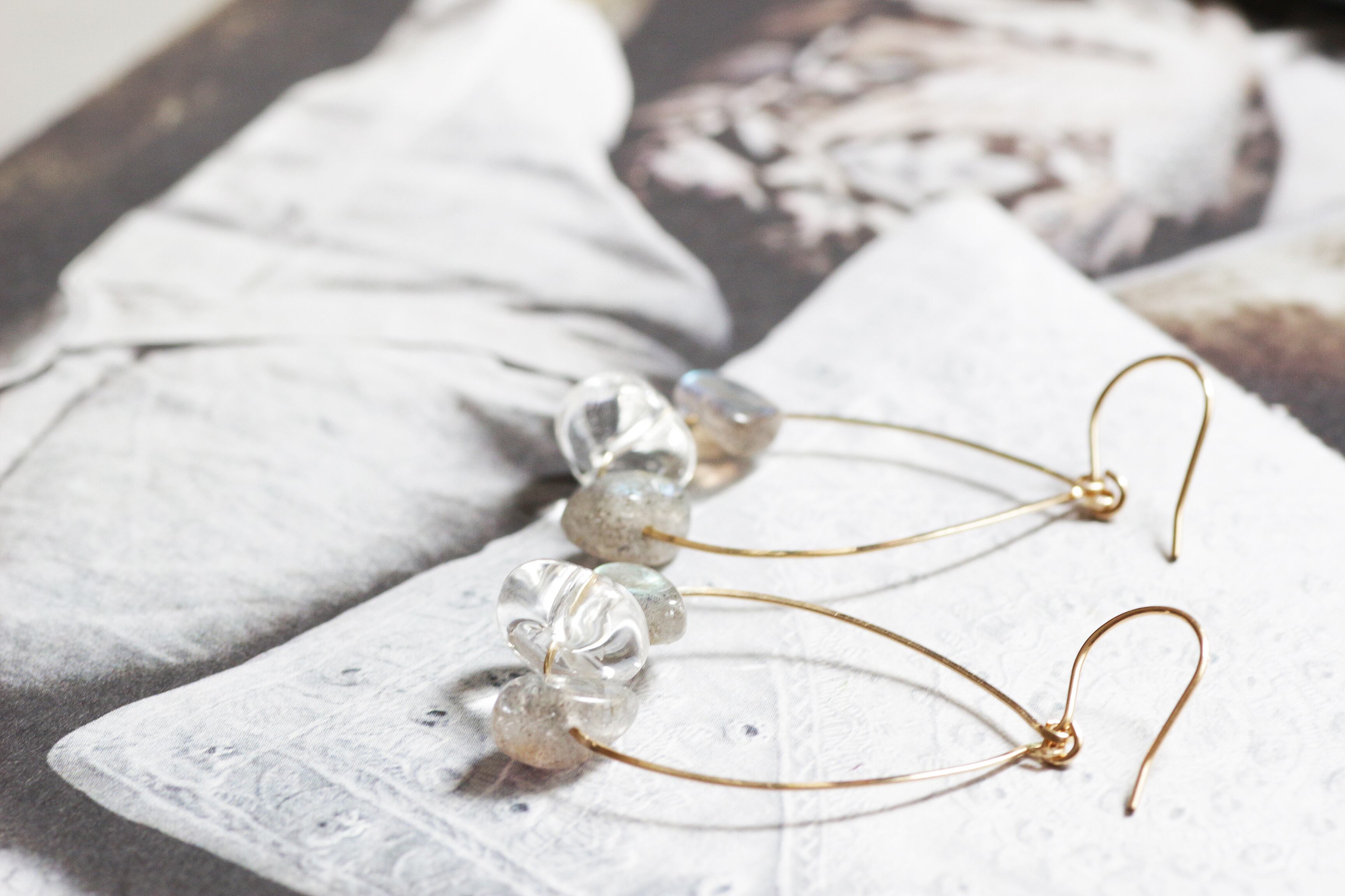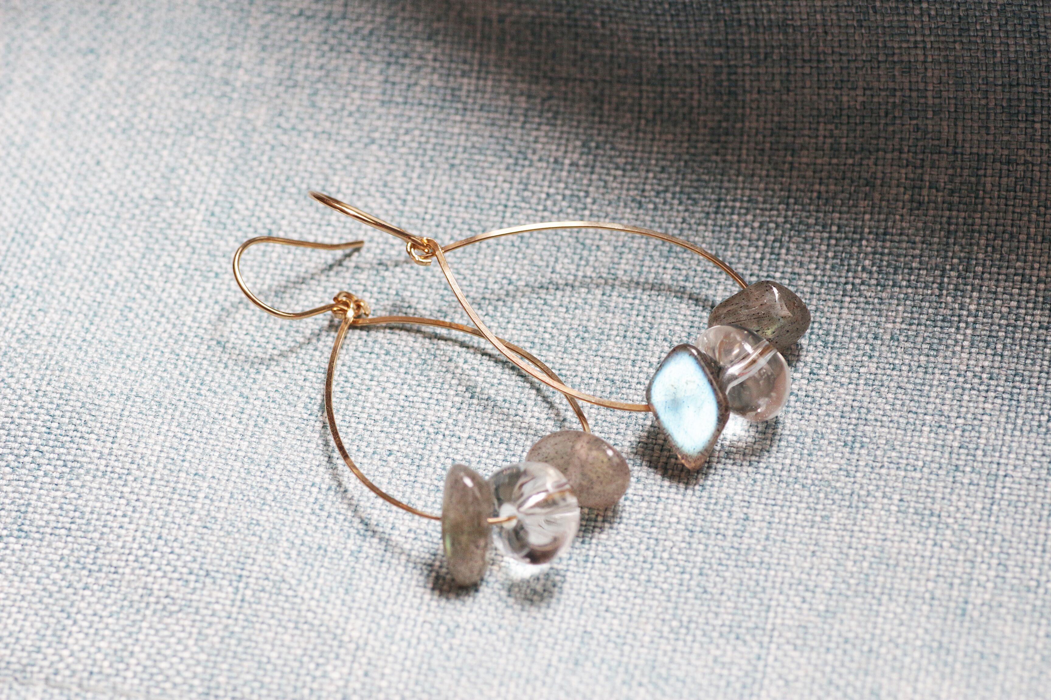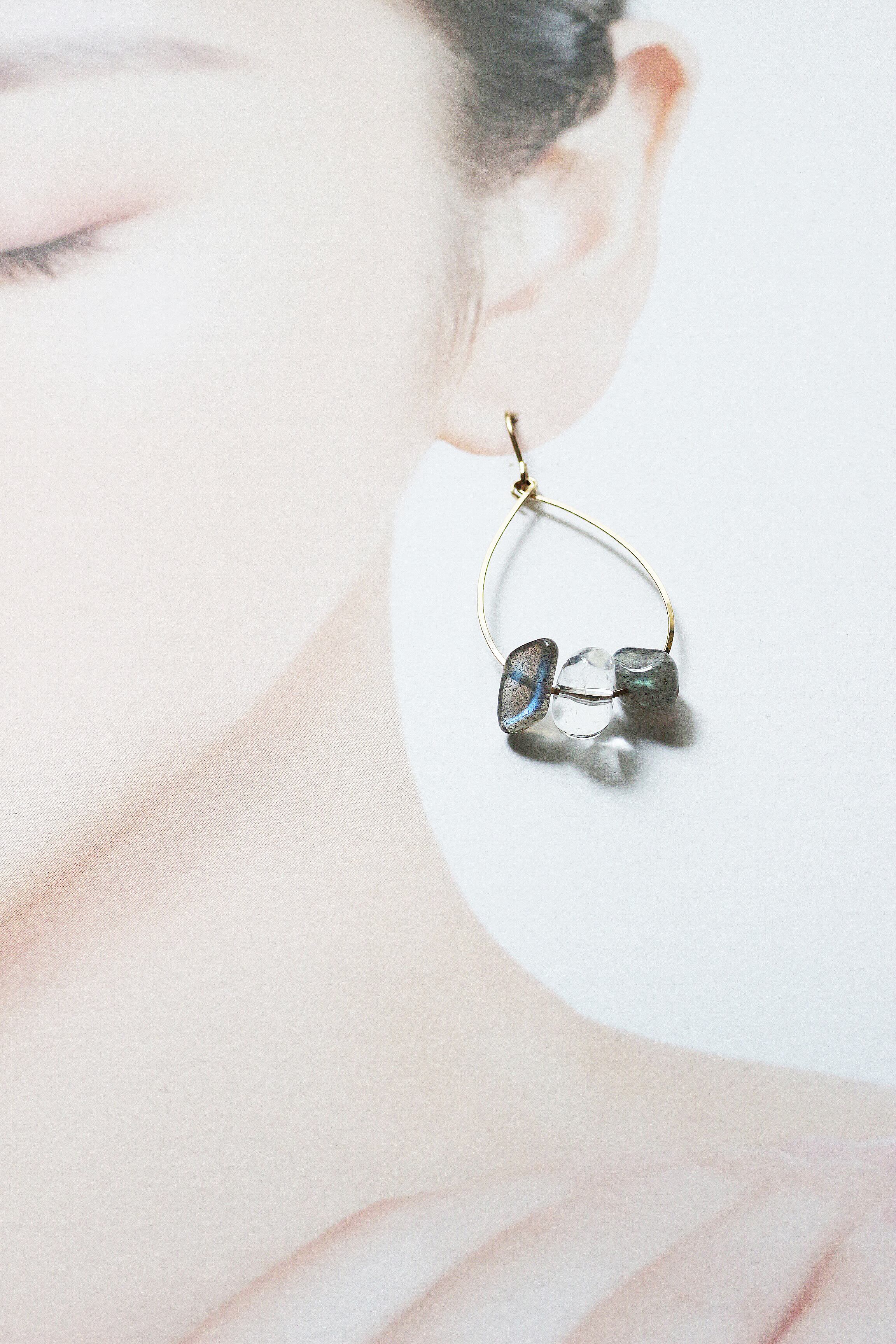 角度によって見られるラブラドレッセンスが美しいラブラドライト、それぞれの輝きを耳元でお楽しみください。