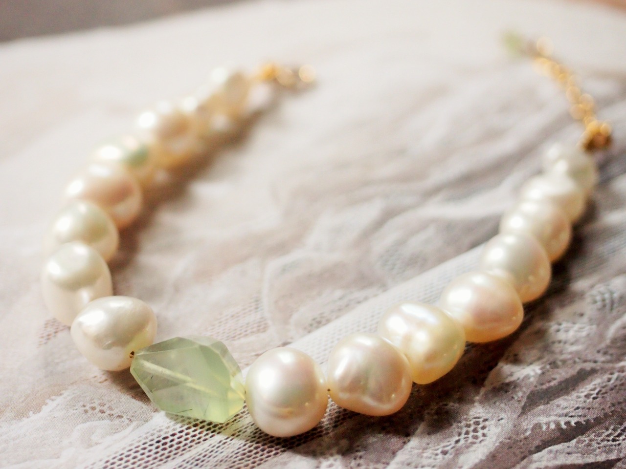 ボリュームのある不揃いなパールたちの一連ブレスレット。キャンディーのようなマスカットグリーンのプレナイトをメインにしたブレスレットです。