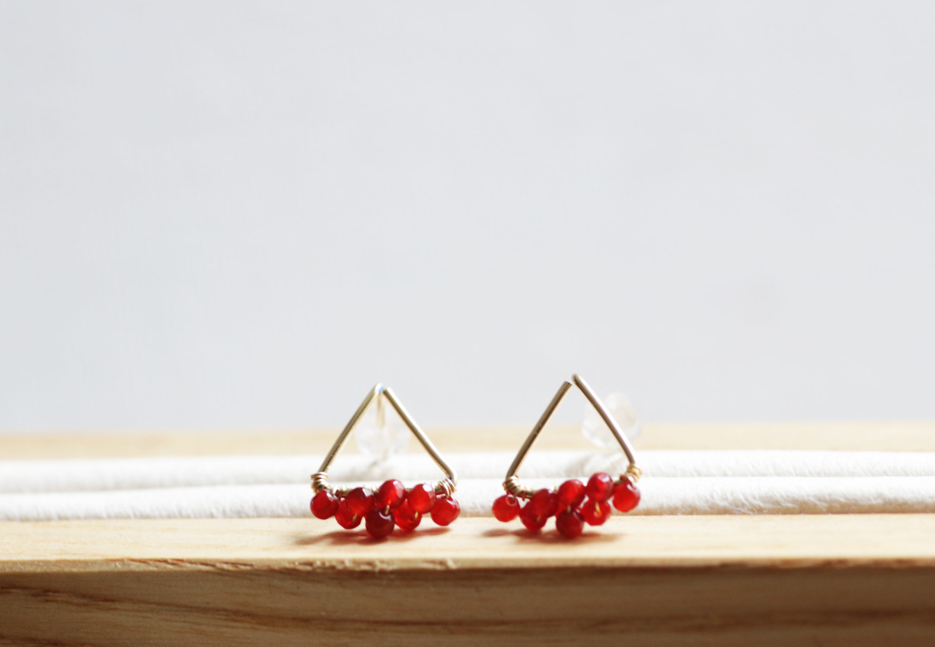 約2mmの小さなラウンドカットのレッドアゲートを小さなトライアングルにぎゅっと集めたデザインピアスです。