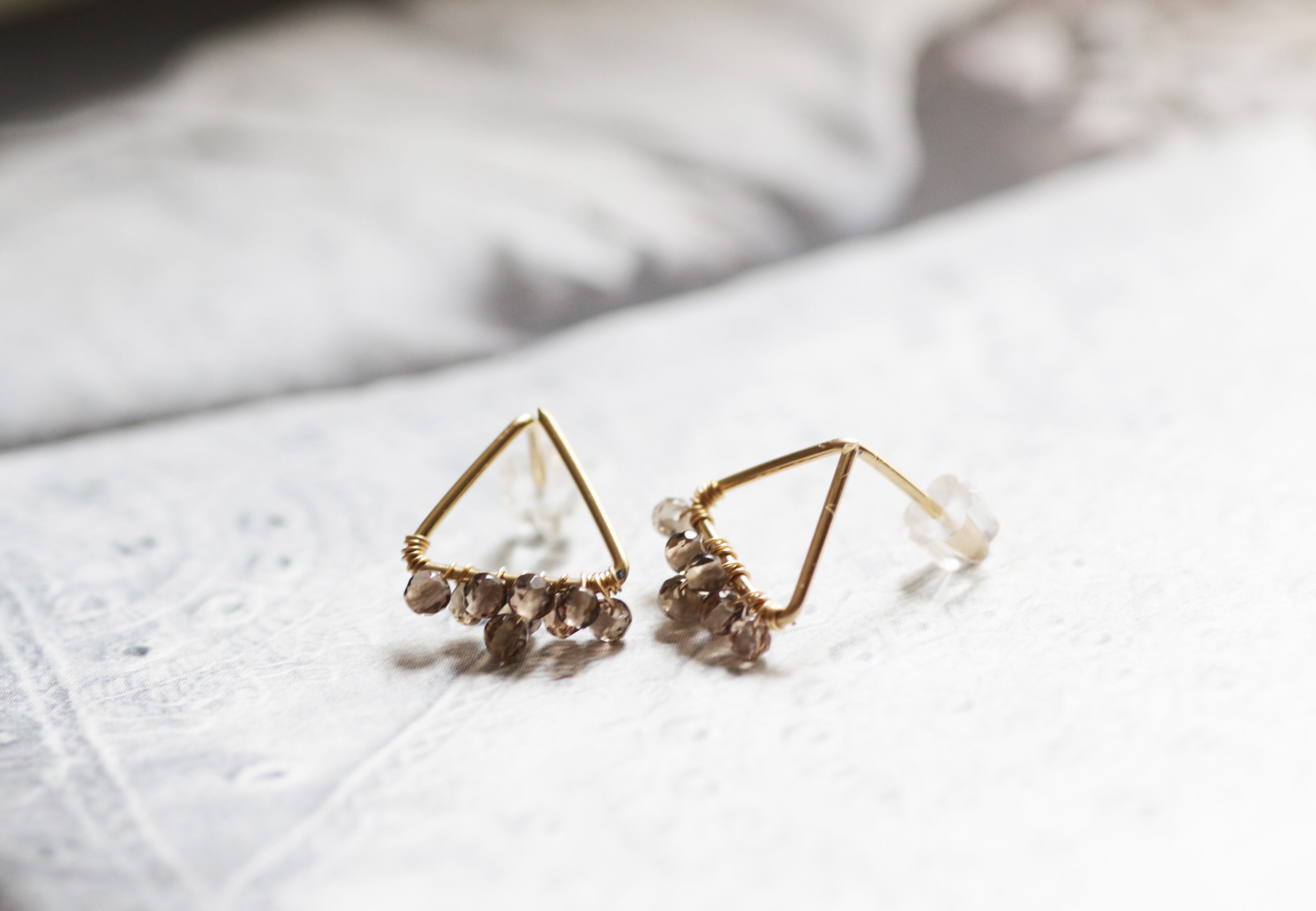 約2mmの小さなラウンドカットのスモーキークォーツを小さなトライアングルにぎゅっと集めたデザインピアスです。
