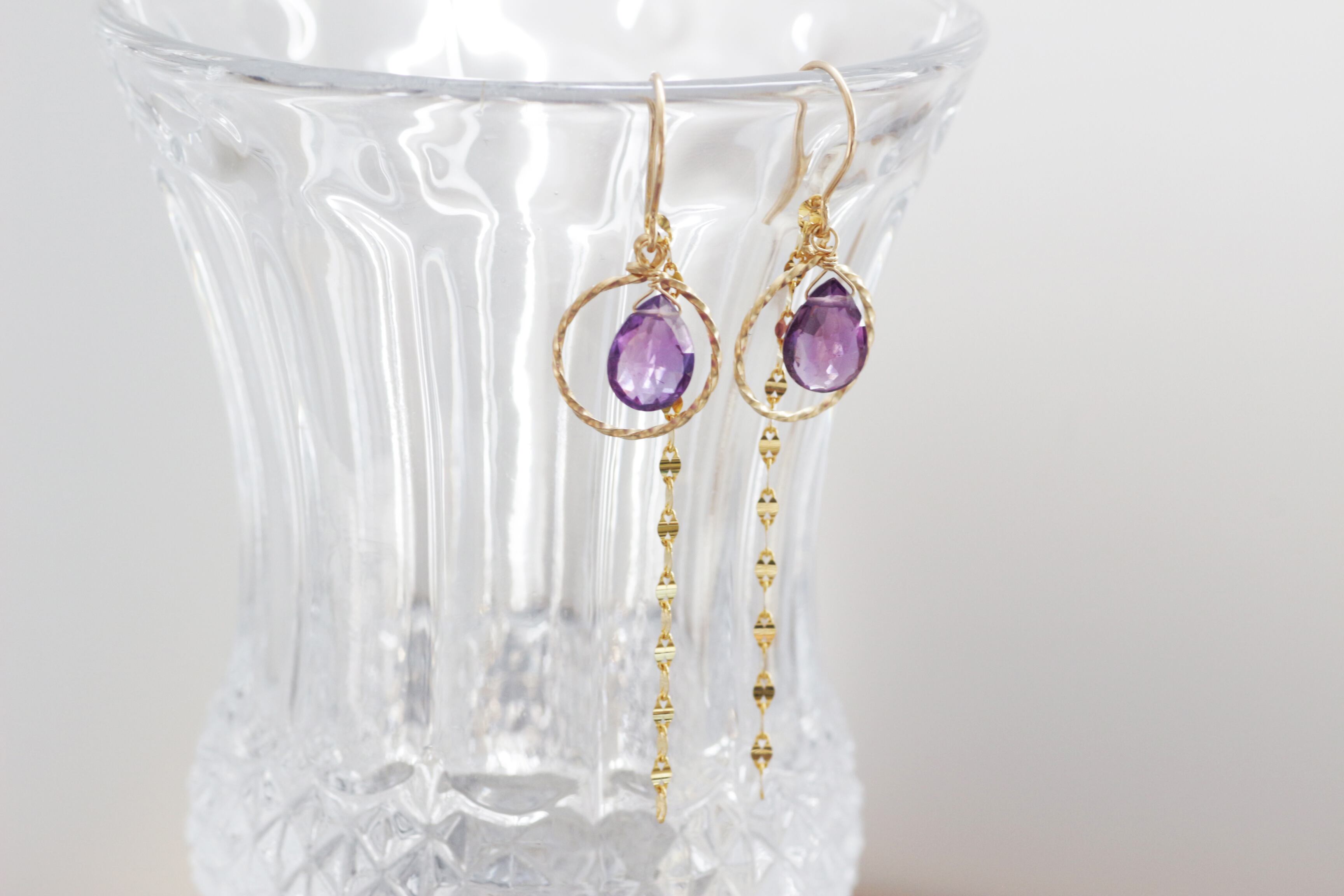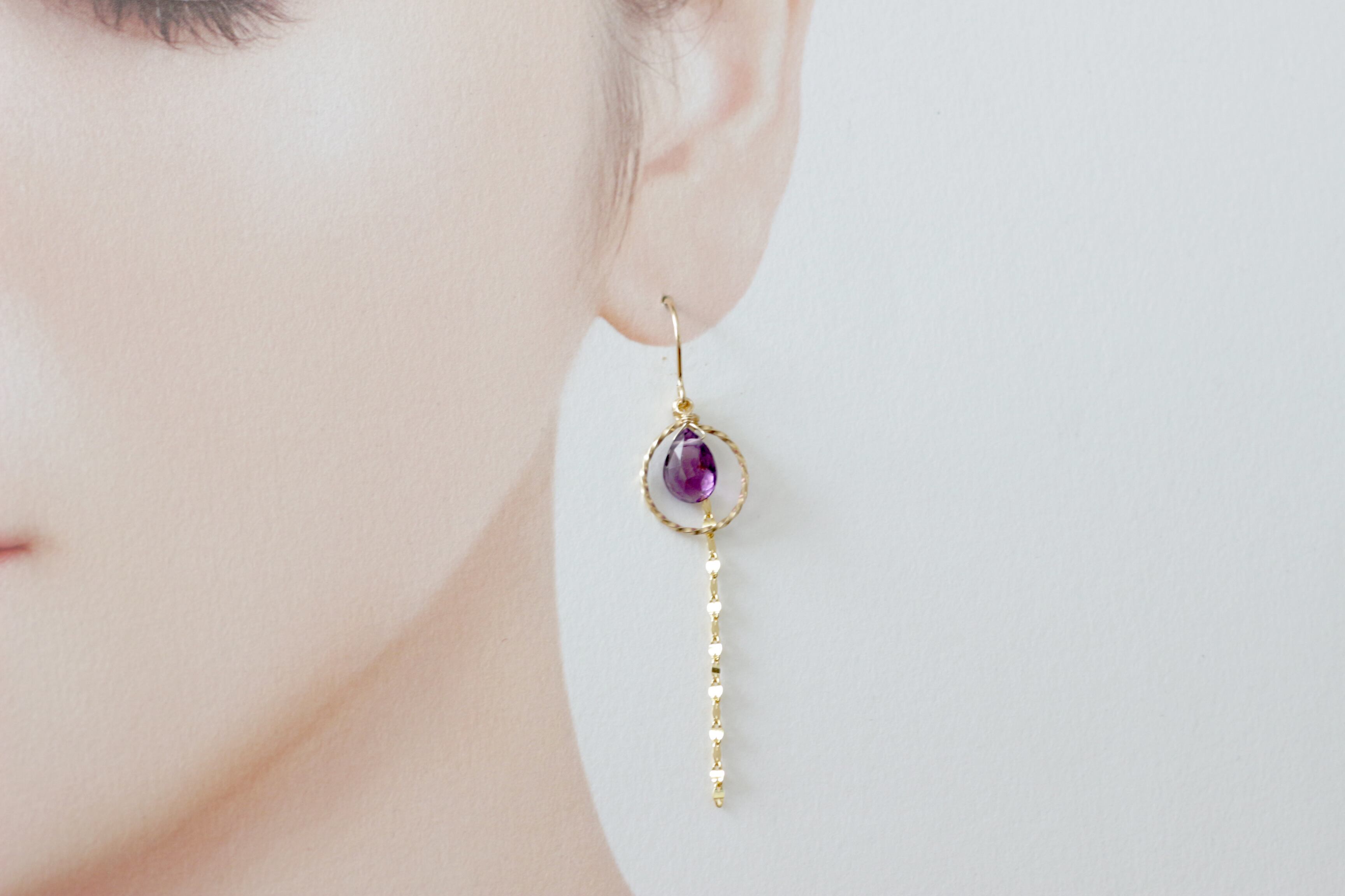 パープルのアメシストとツイストの丸いモチーフにキラキラチェーンをスーっと落とした上品なセミロングピアスです。