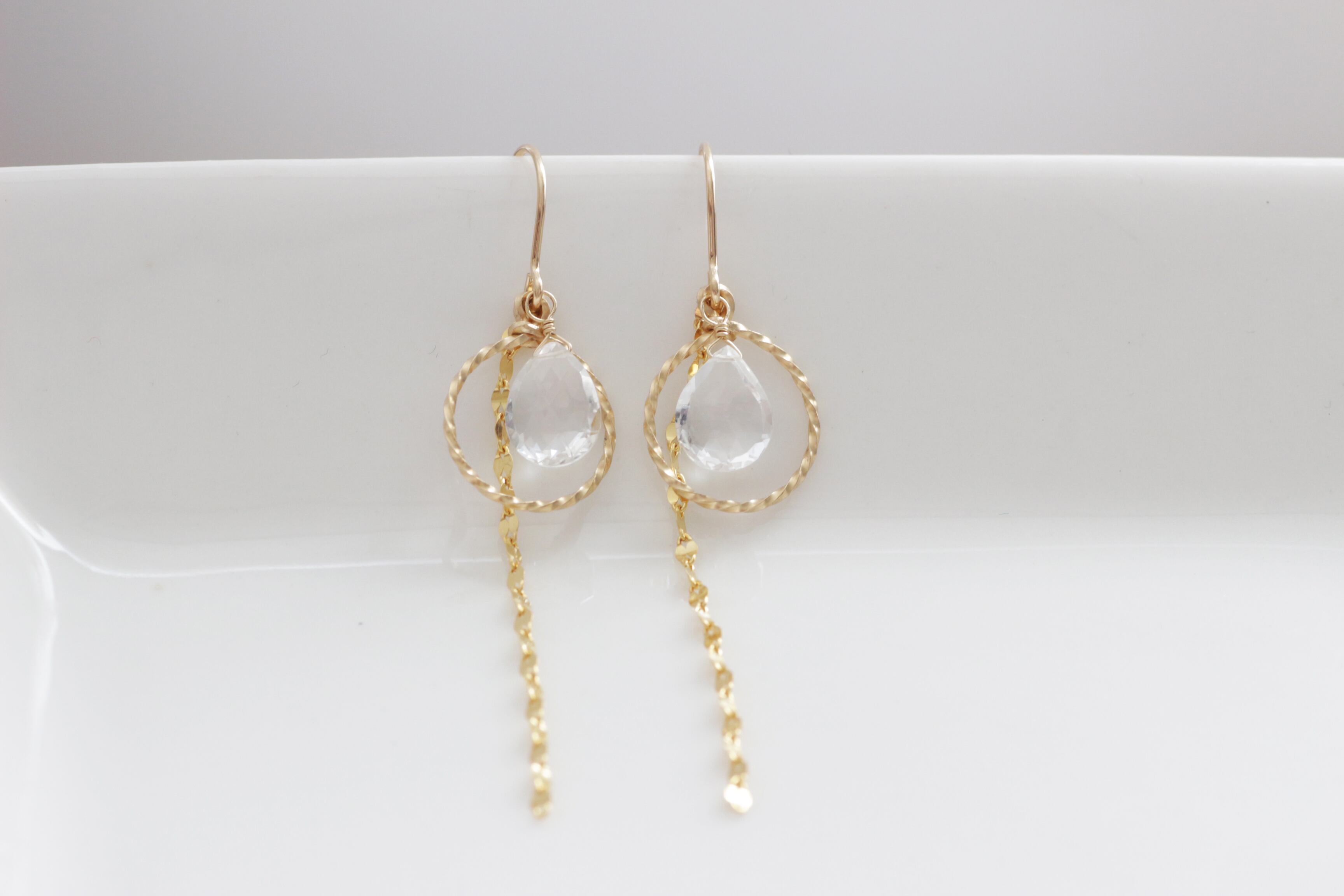 クリアに輝くホワイトトパーズとツイストの丸いモチーフにキラキラチェーンをスーっと落とした上品なセミロングピアスです。