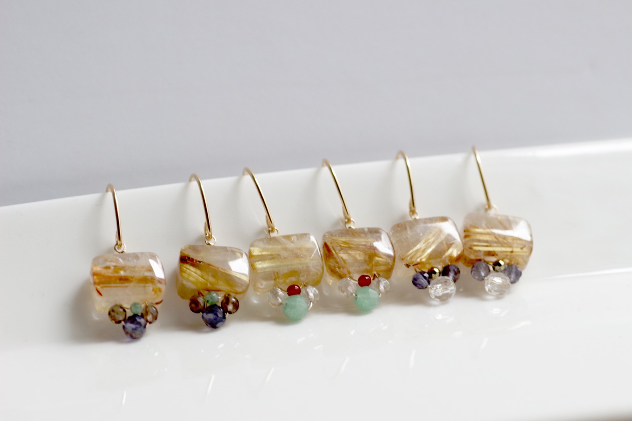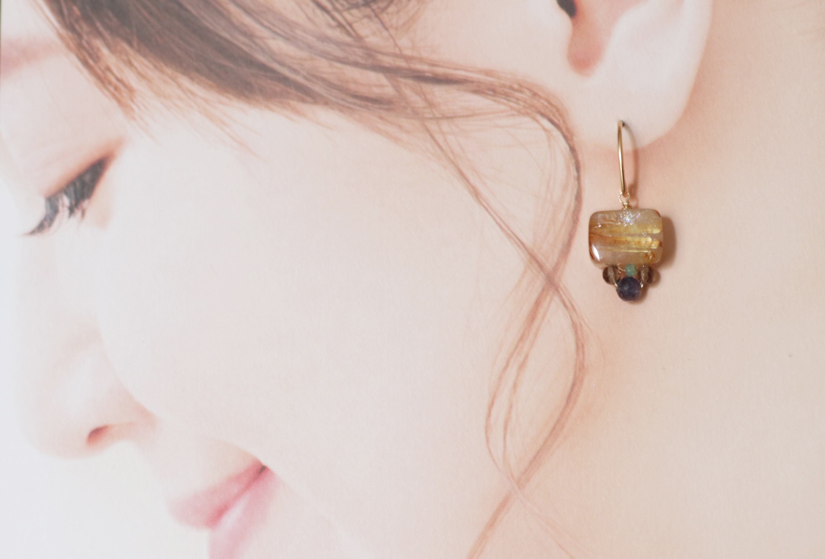 ネイビーブルーアイオライトや小さな天然石を添えた、デザインピアスです。