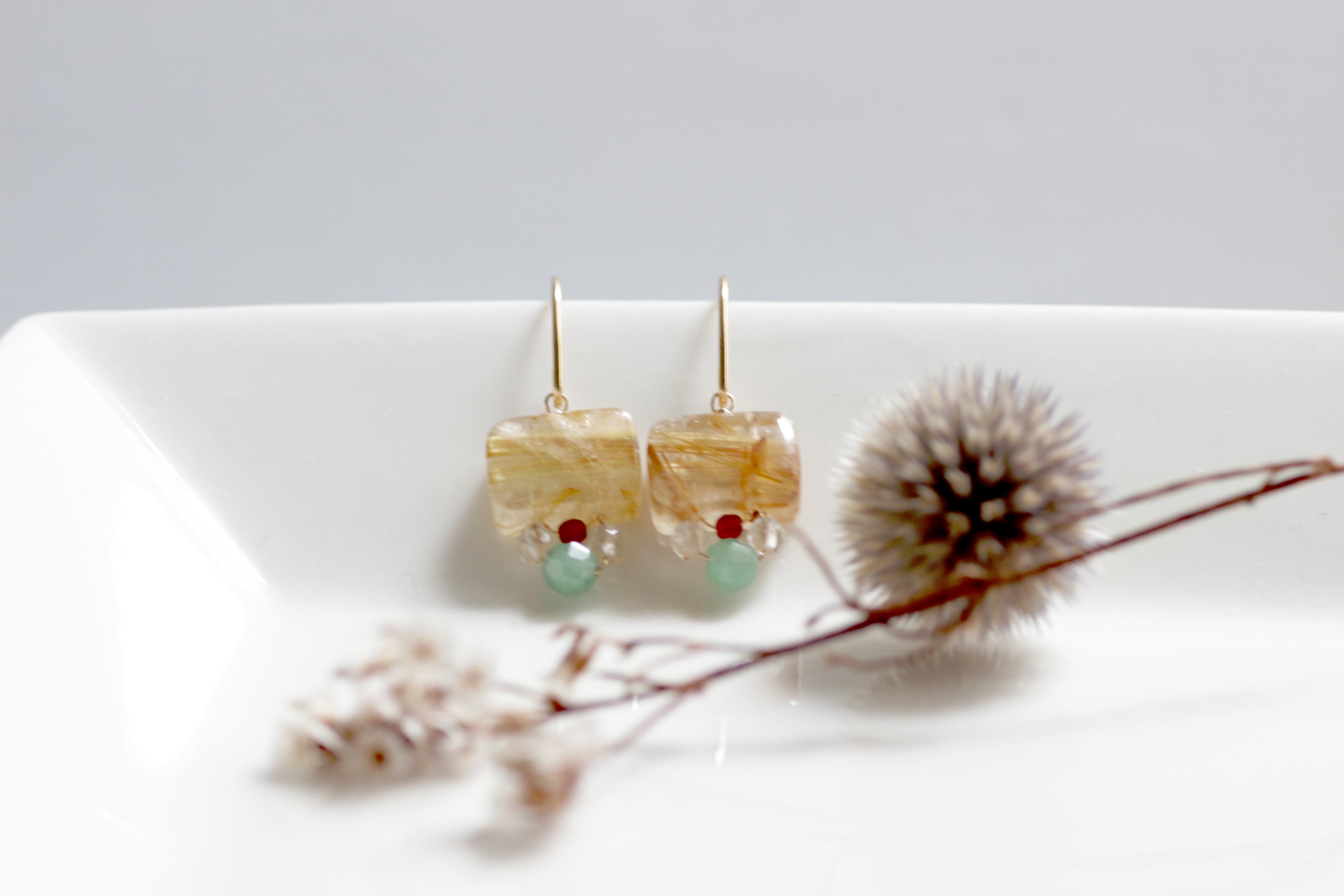 ミルキーグリーンのアベンチュリンや小さな天然石を添えた、デザインピアスです。