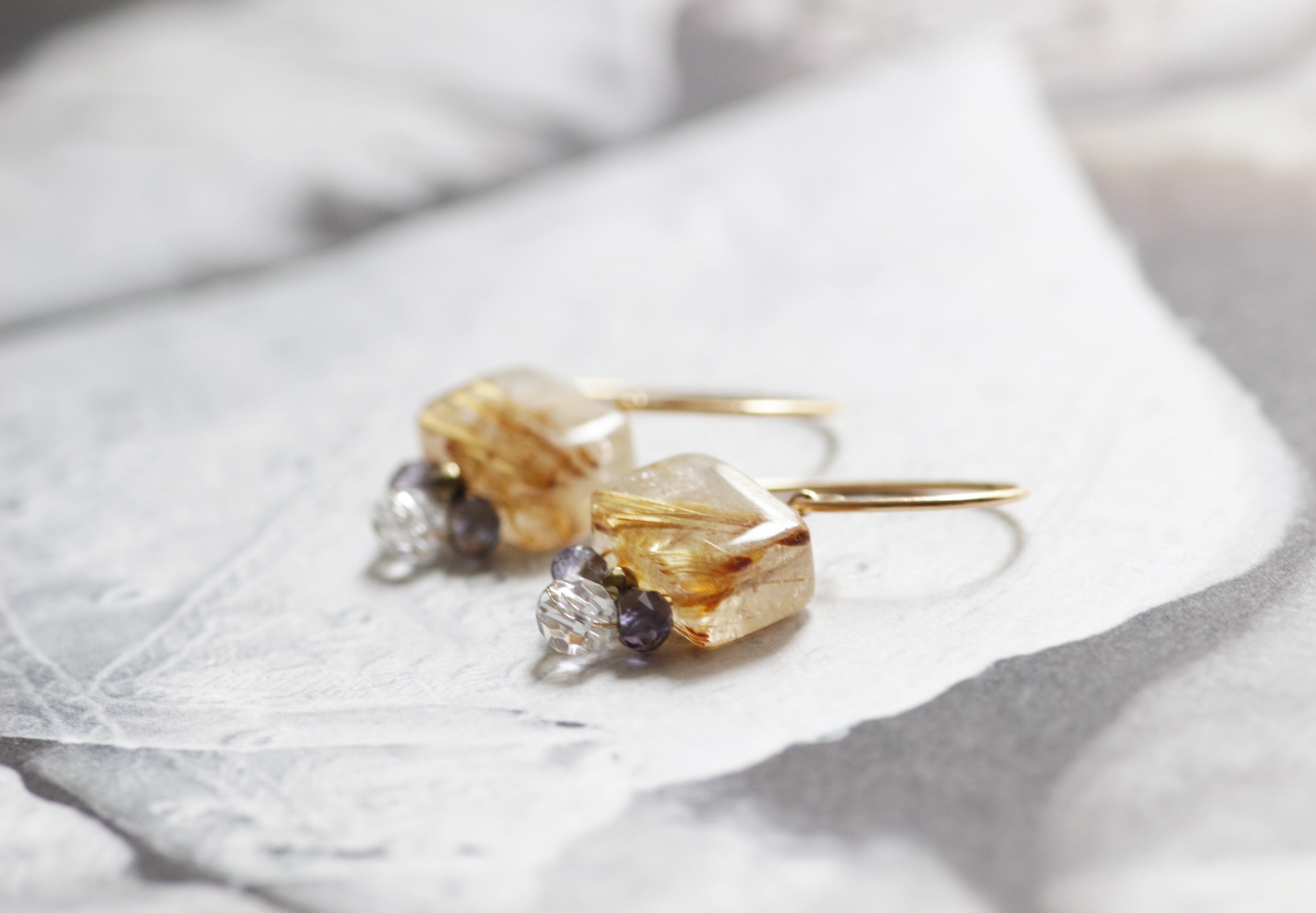 透明感あるクリアな水晶や小さな天然石を添えた、デザインピアスです。