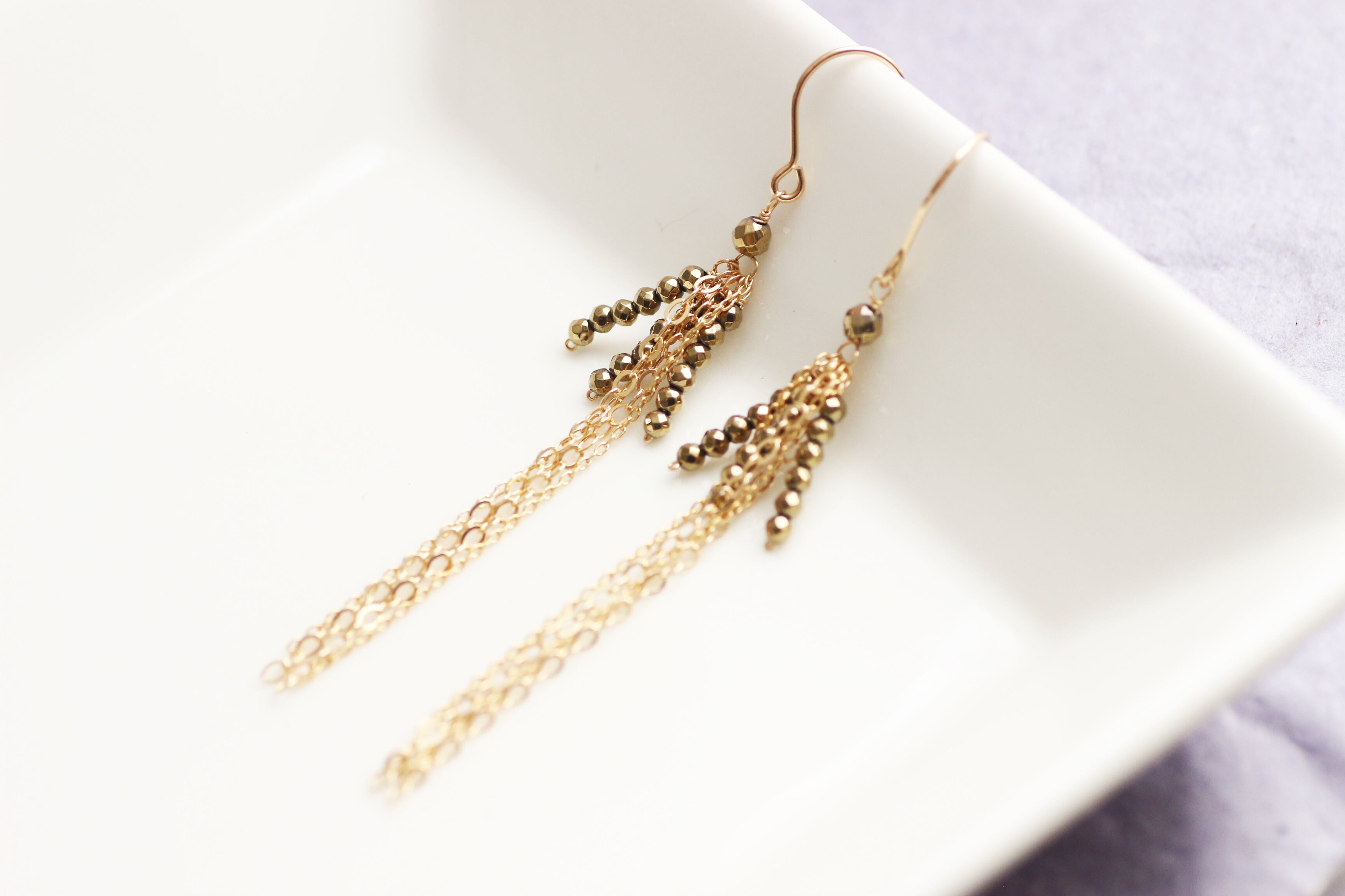 極小のヘマタイトがチェーンとともに揺れ、タッセル風に仕上げたセミロングピアスです。