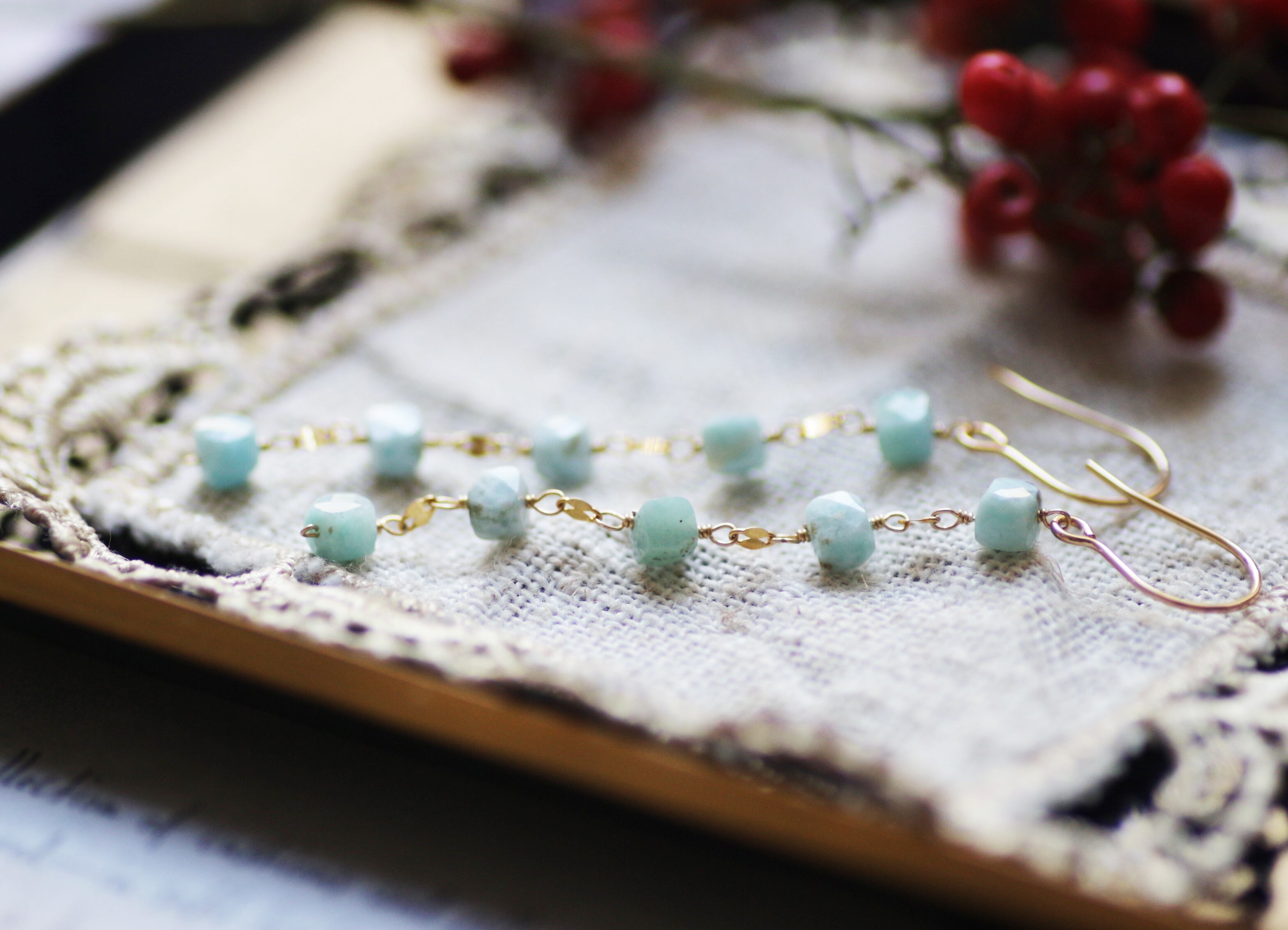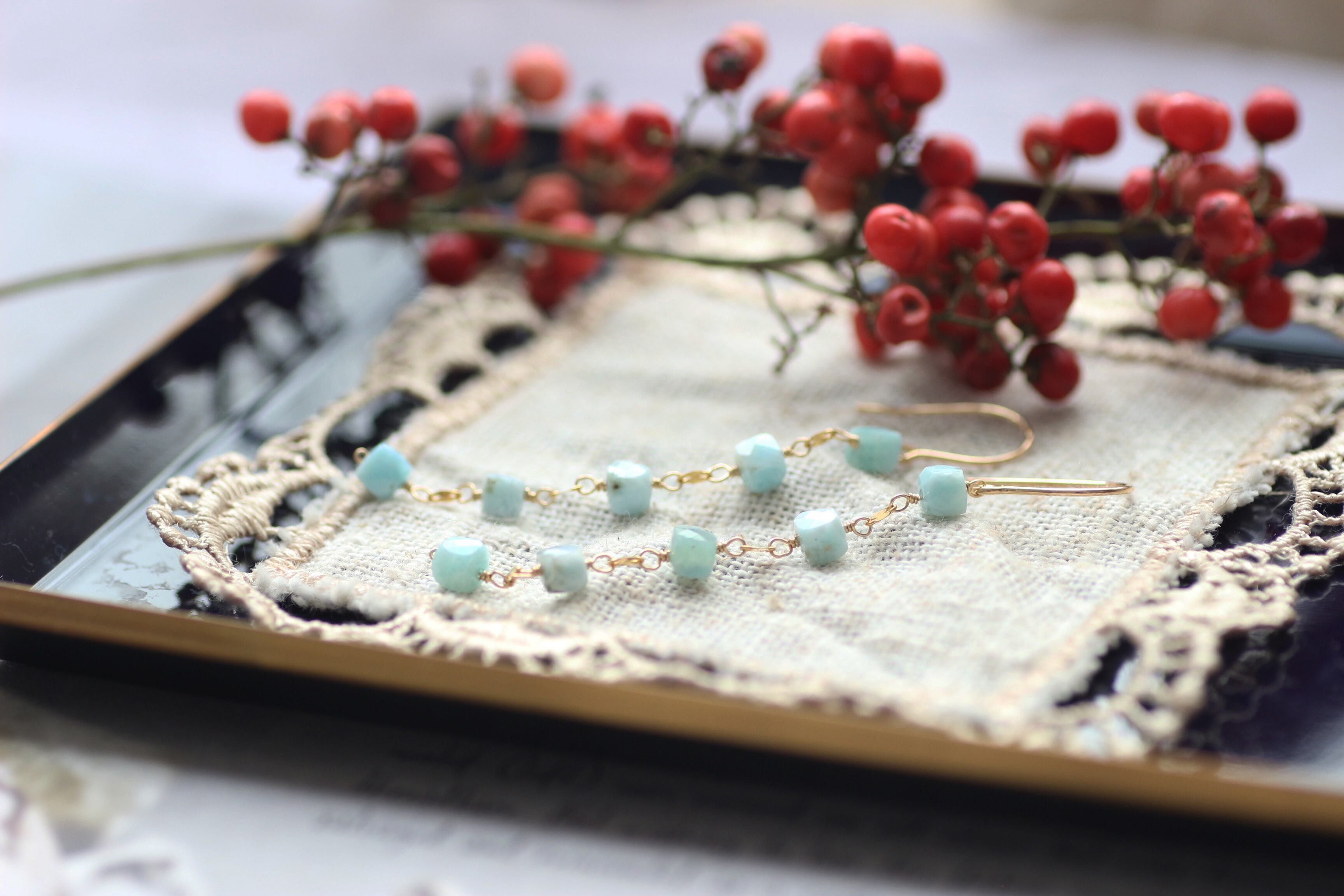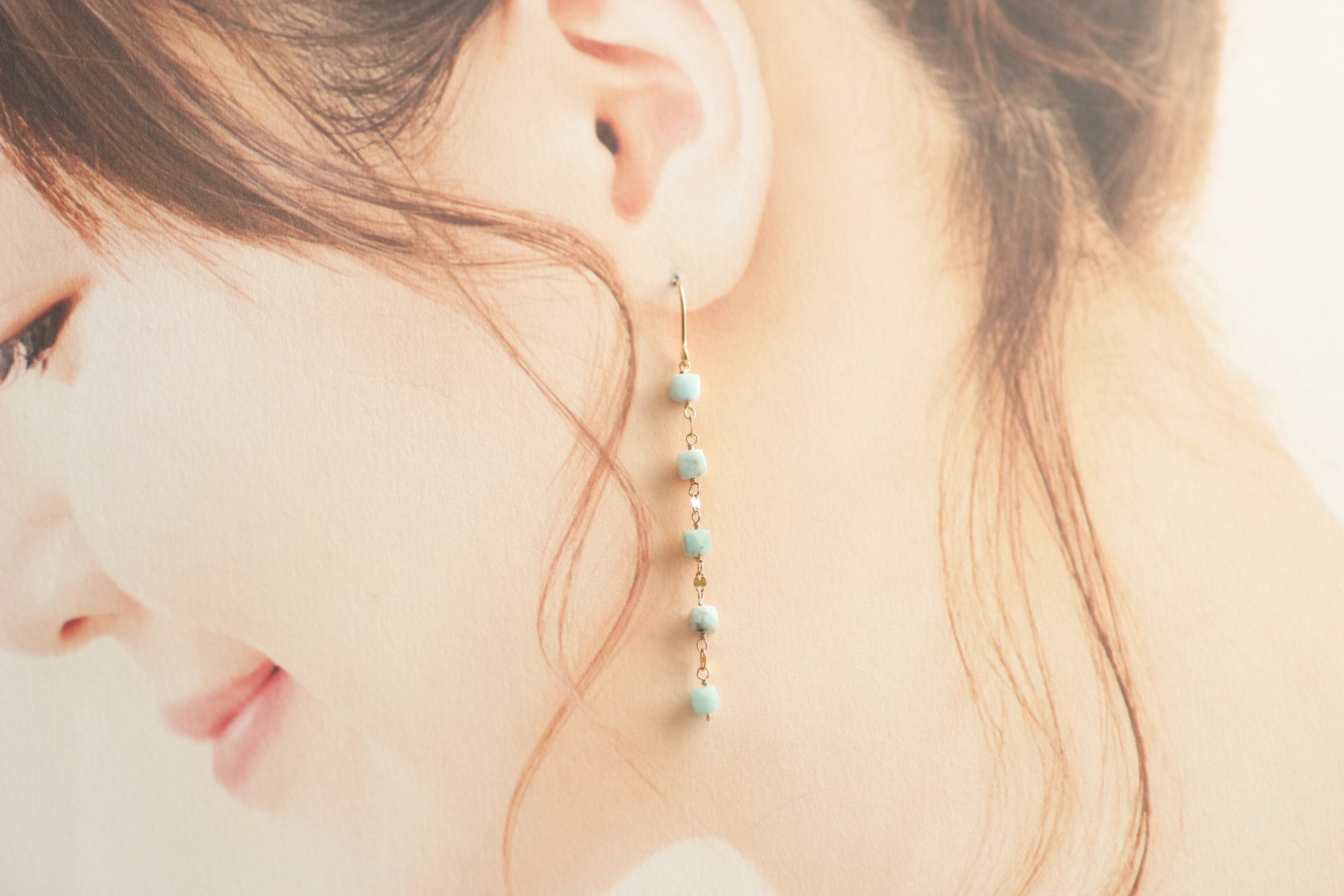 ミルキーブルーの小さなキューブカットのロードナイトを繋げたロングピアスです。