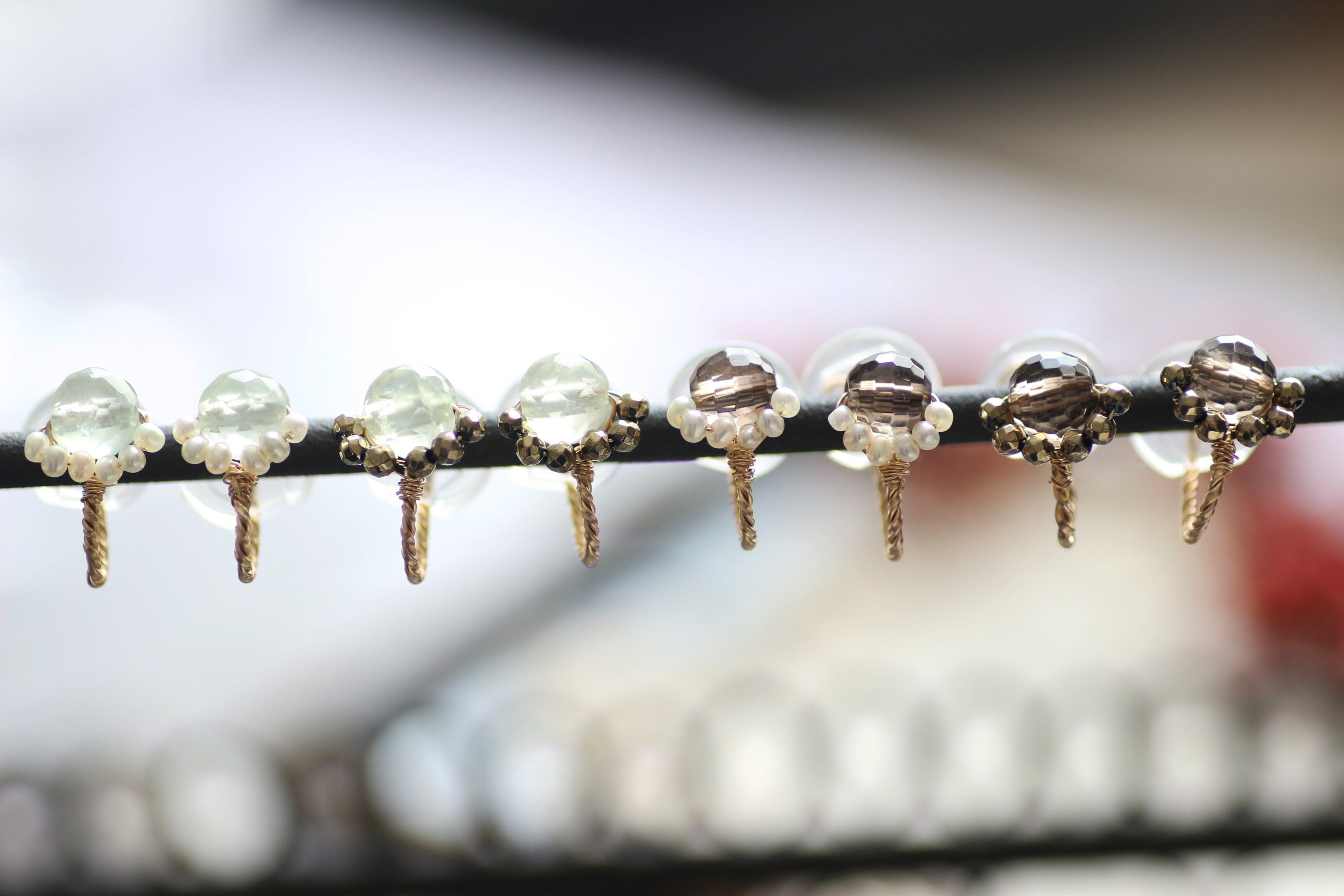 カットが施されたまん丸に小さな淡水パールを添えて、女性らしく耳元を飾ります。