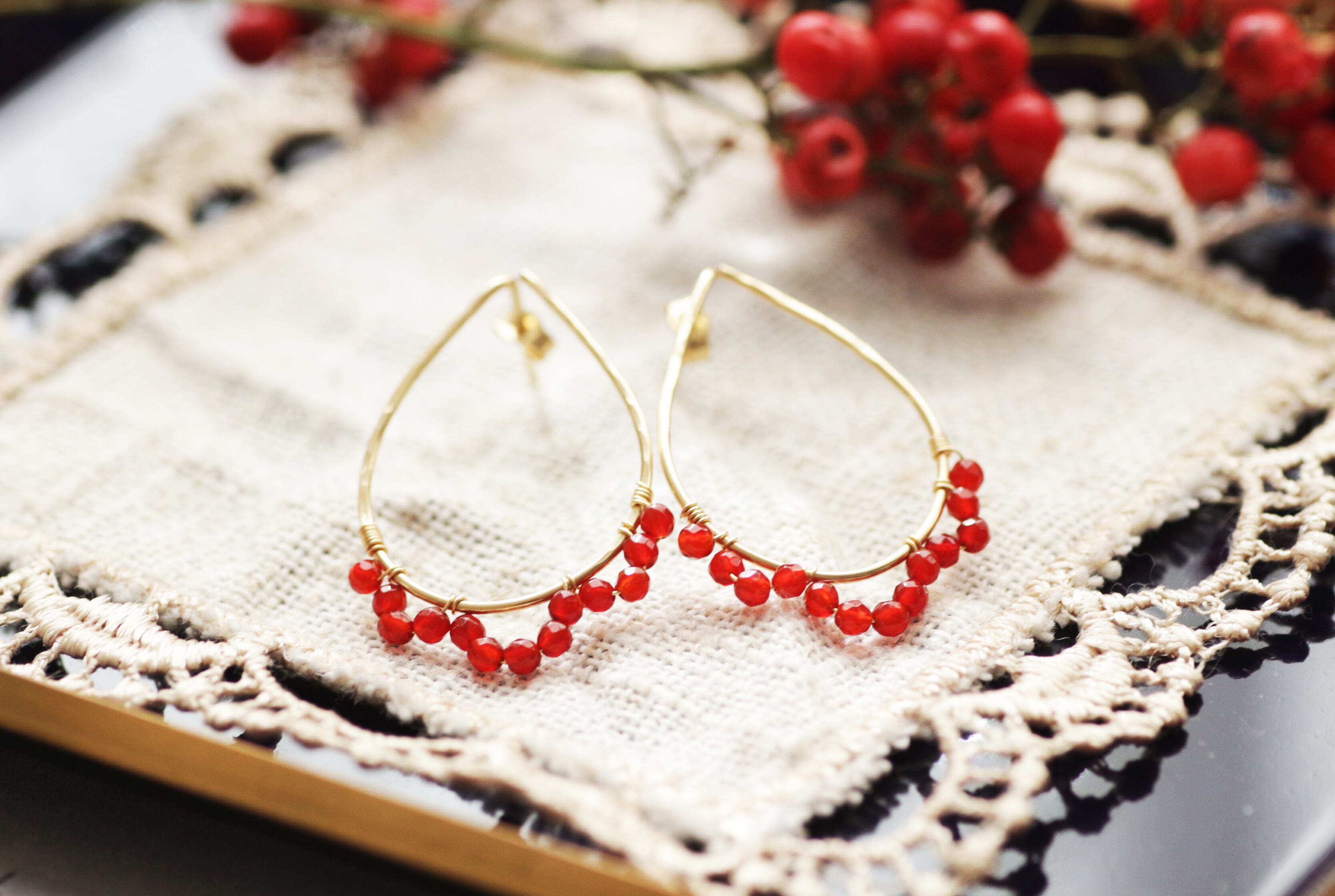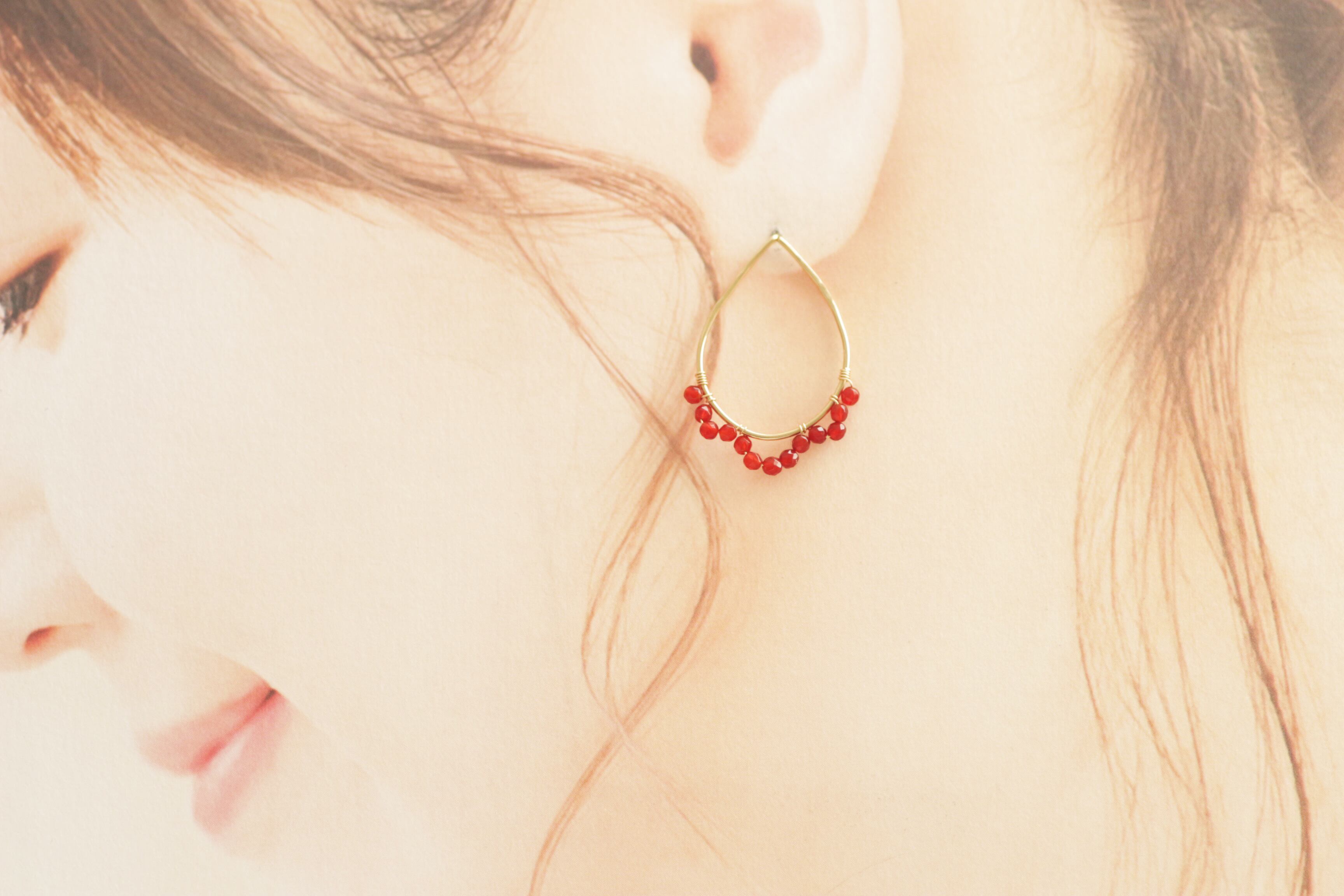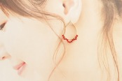 大きめ(約3cm)のドロップモチーフを、小さな赤いシードで飾ったピアスです。