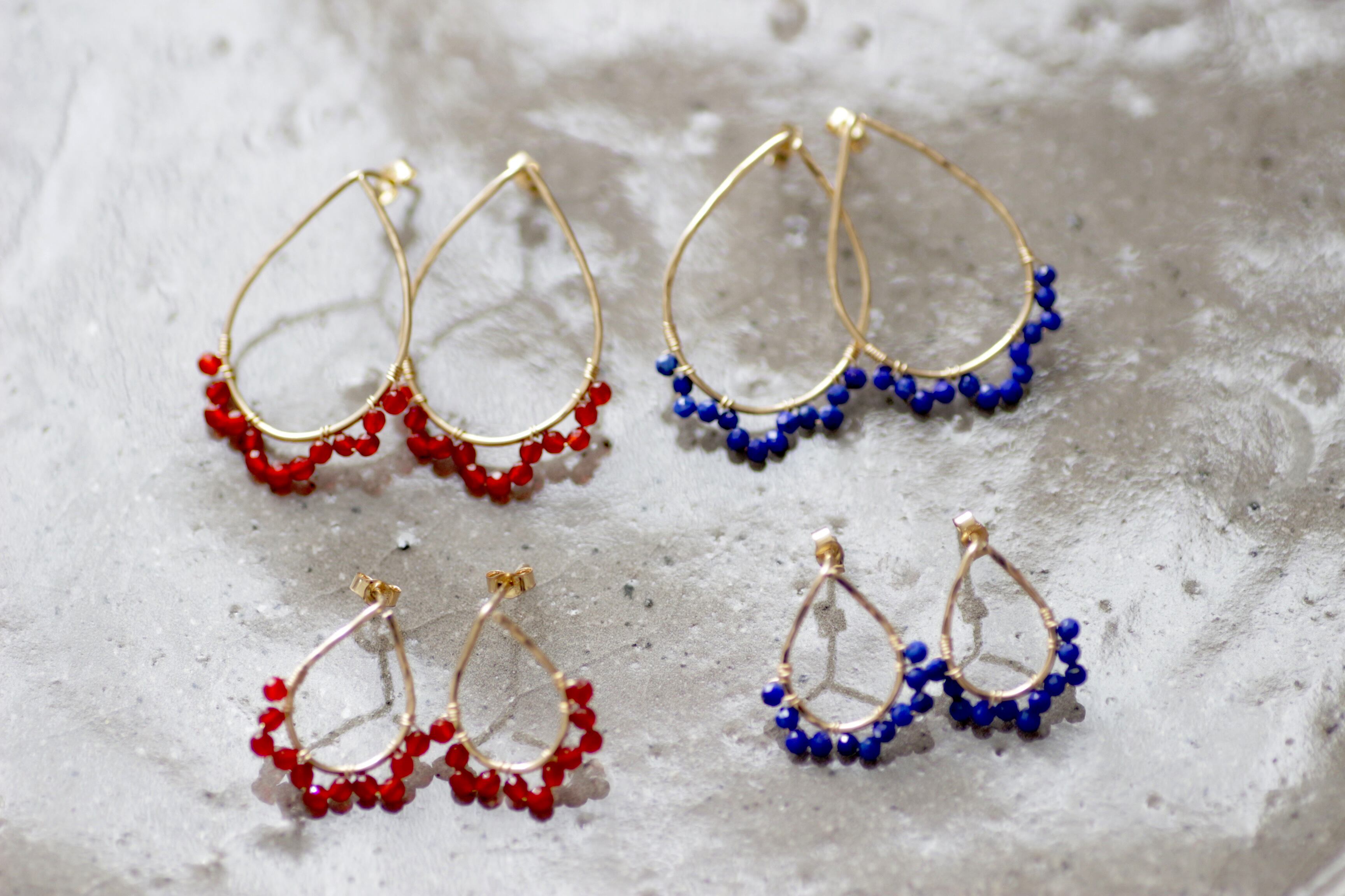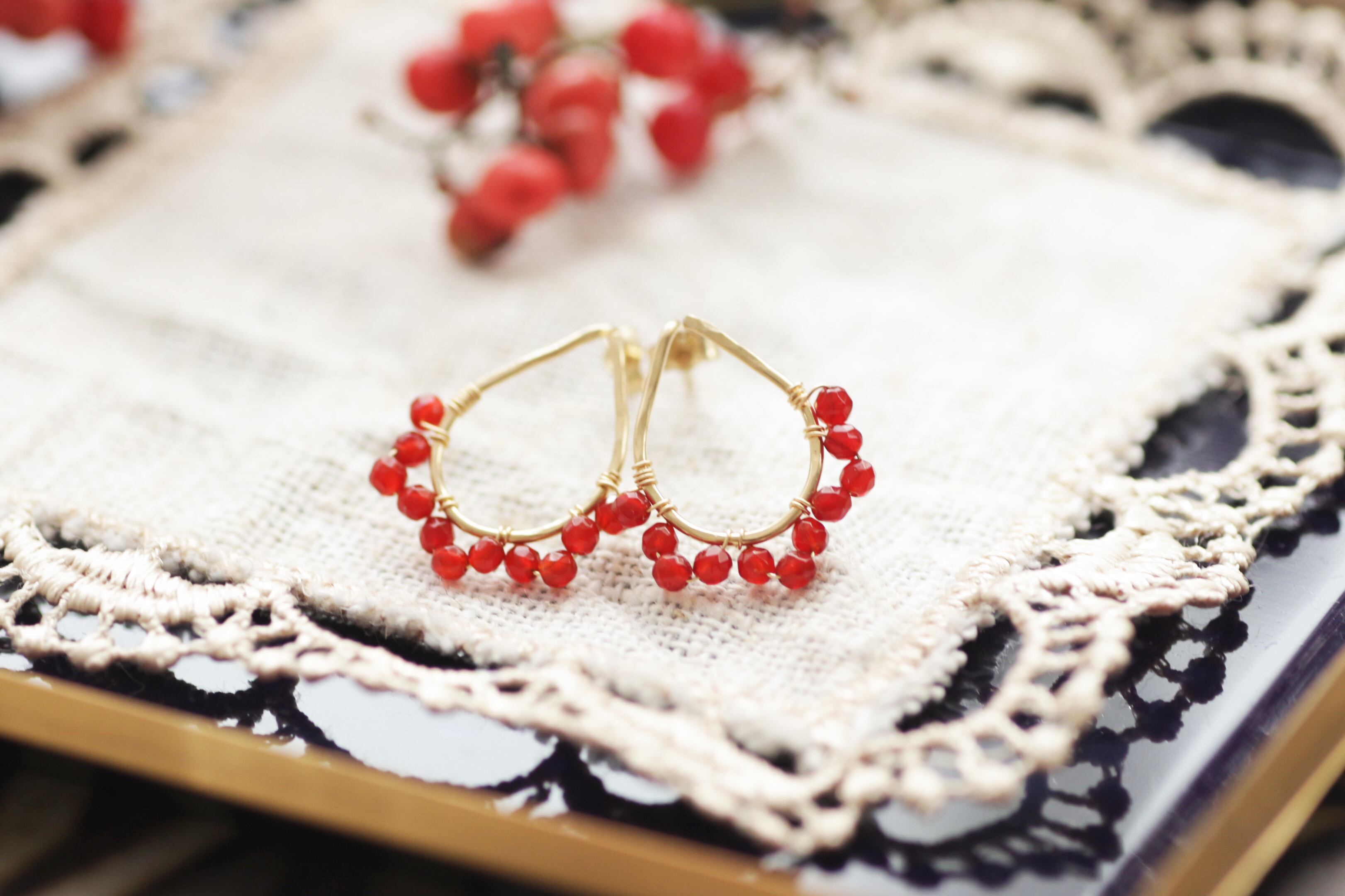 小さめ(約1.8cm)のドロップモチーフを、小さな赤いシードで飾ったピアスです。