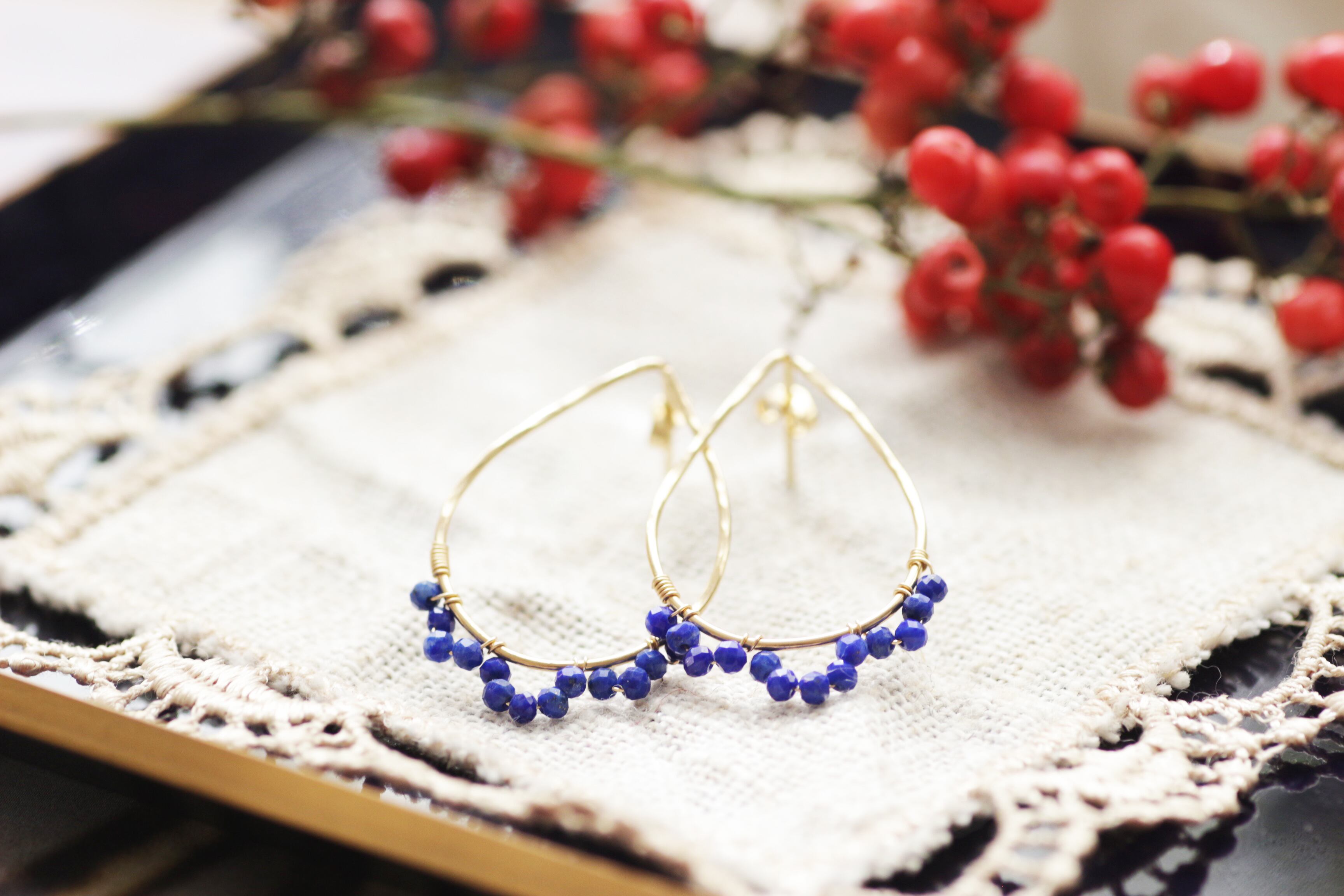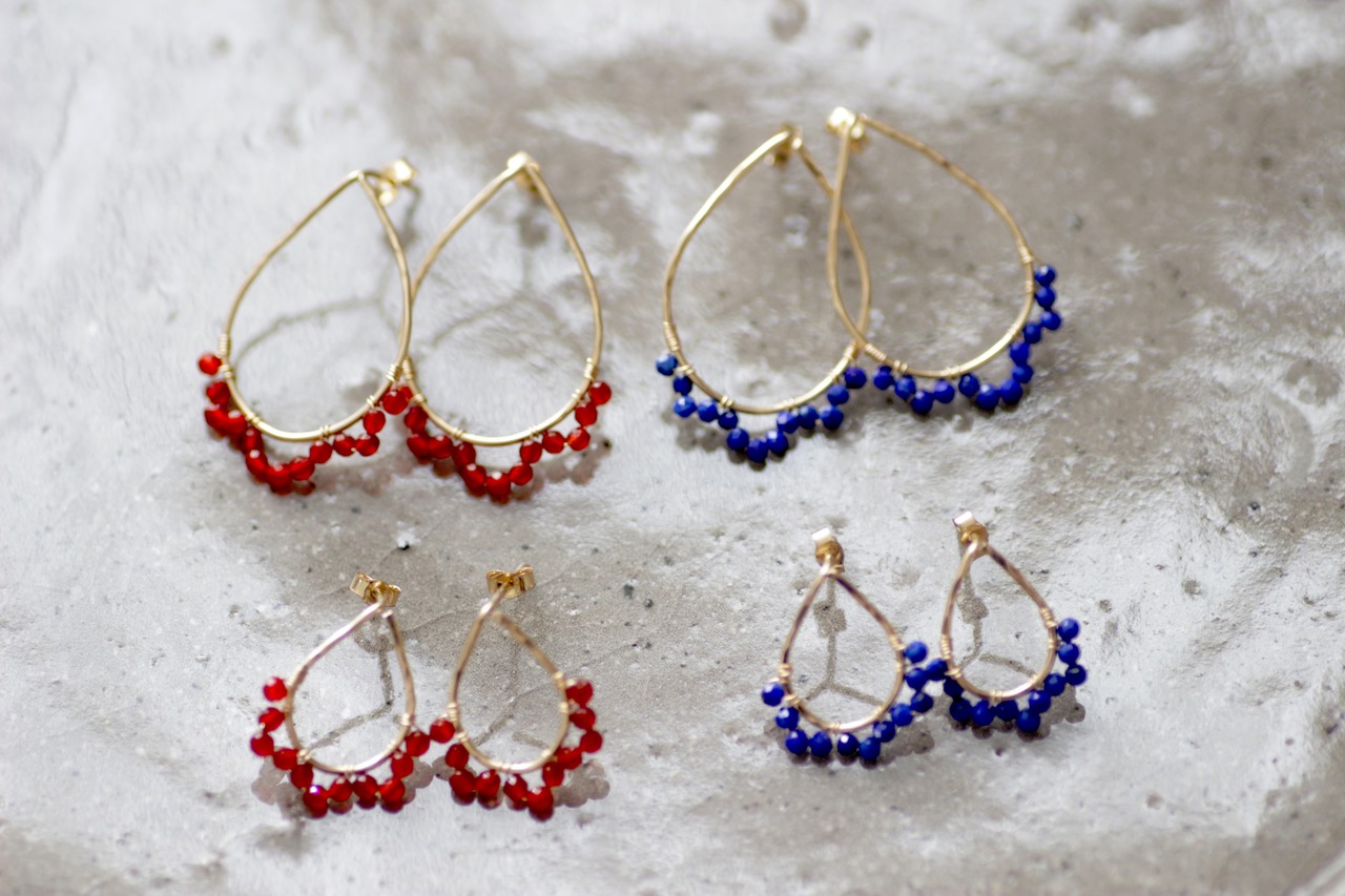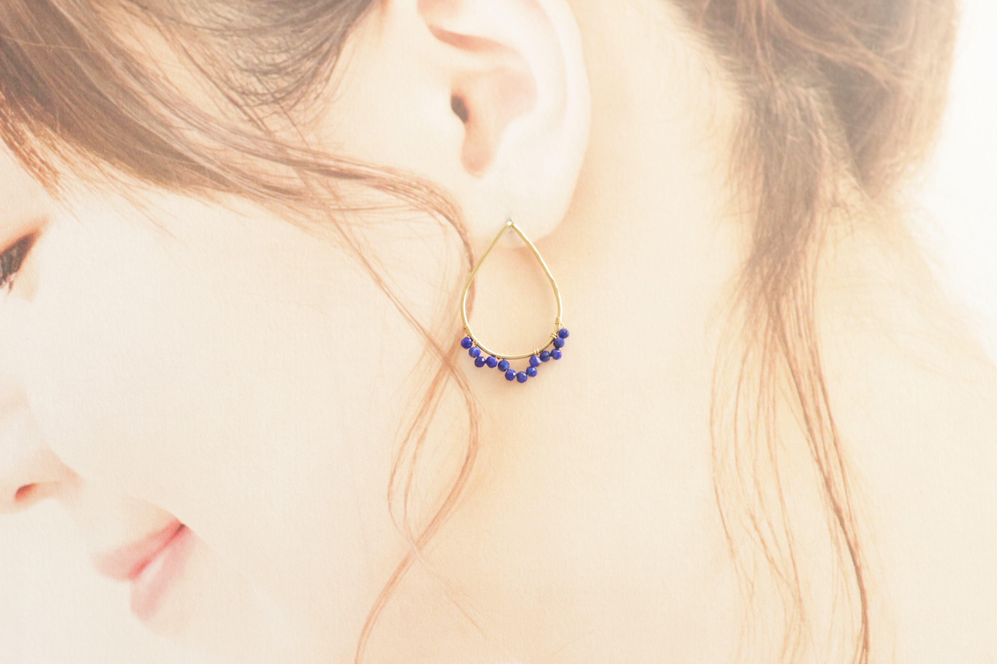 大きめ(約3cm)のドロップモチーフを、小さな青いシードで飾ったピアスです。