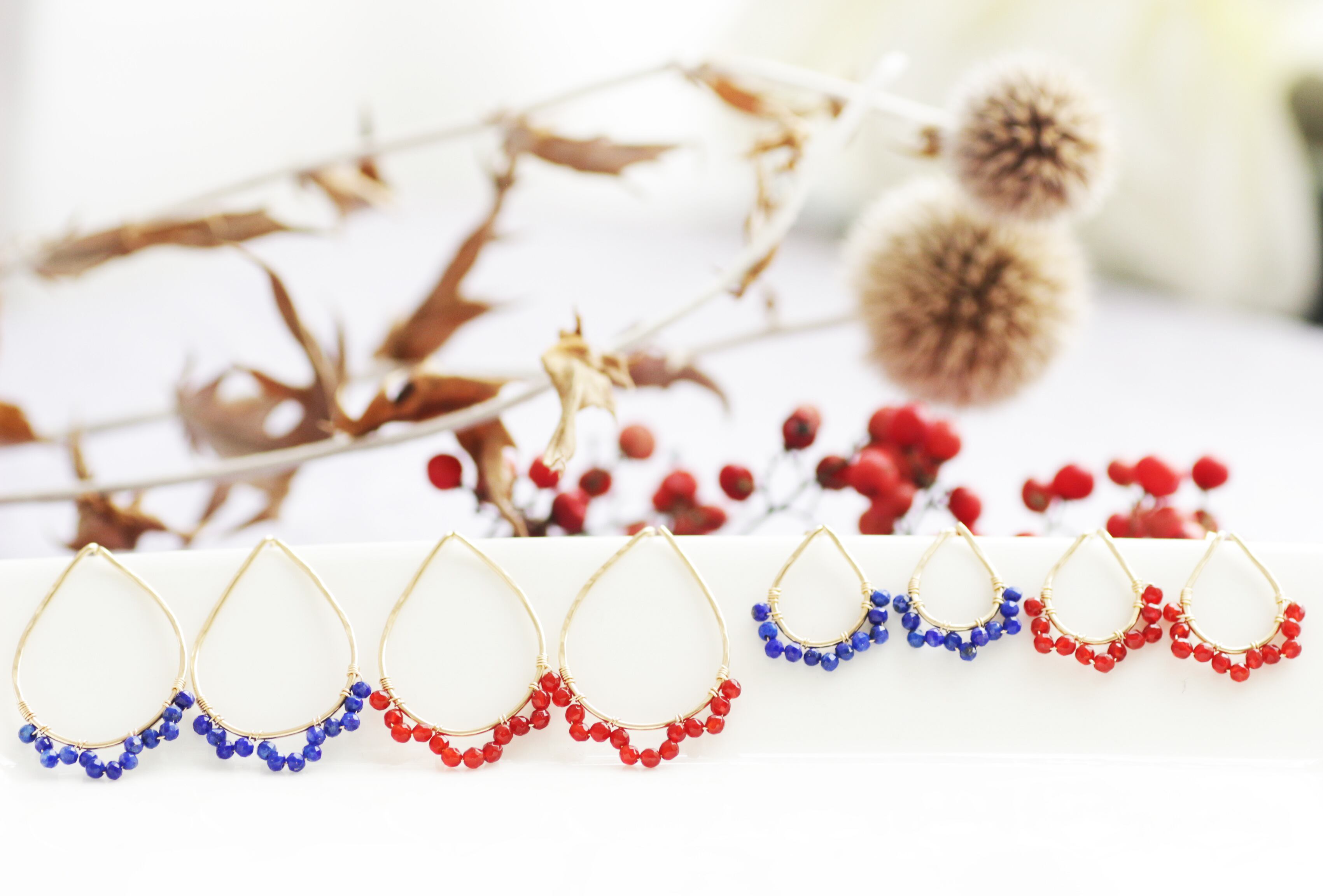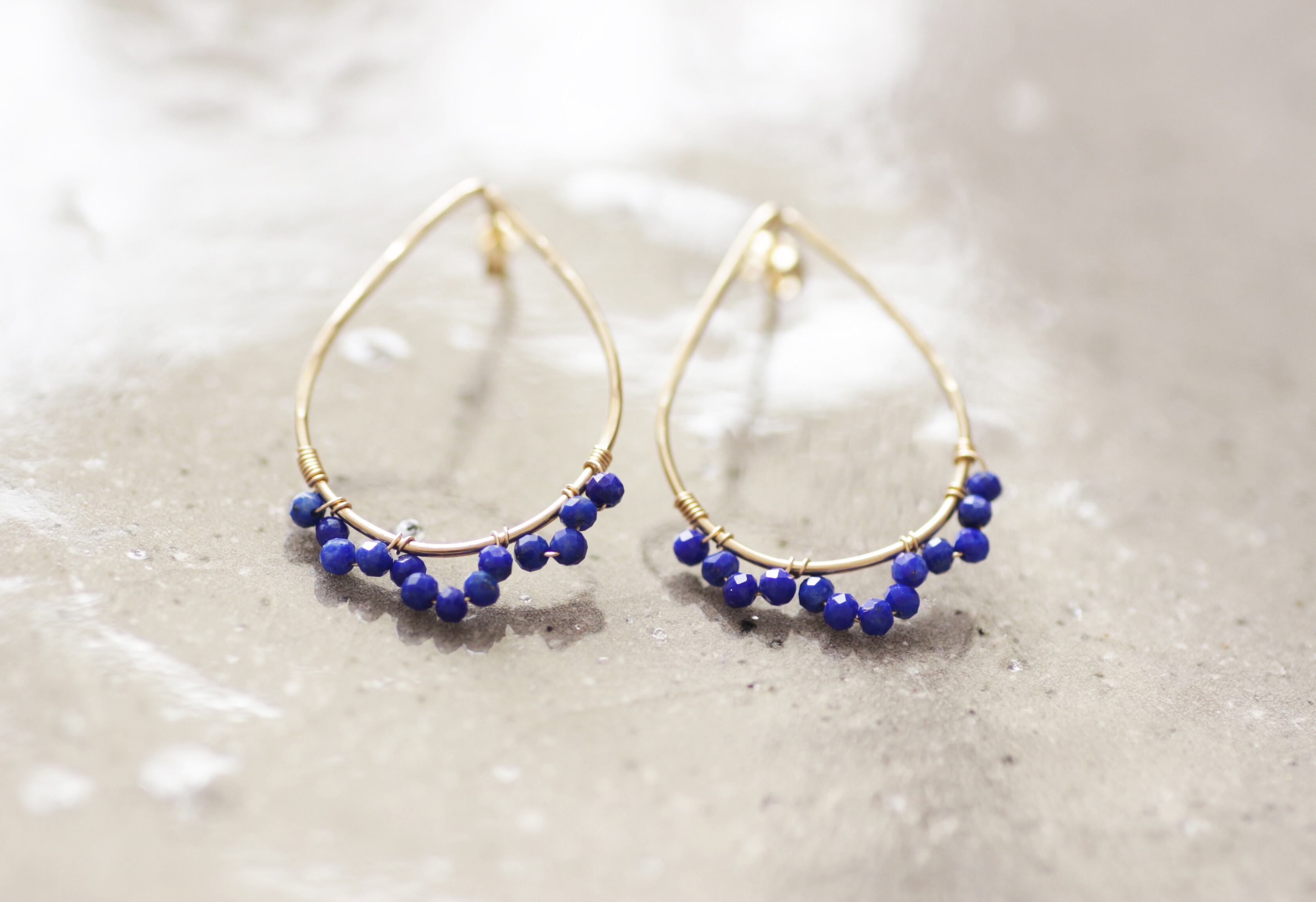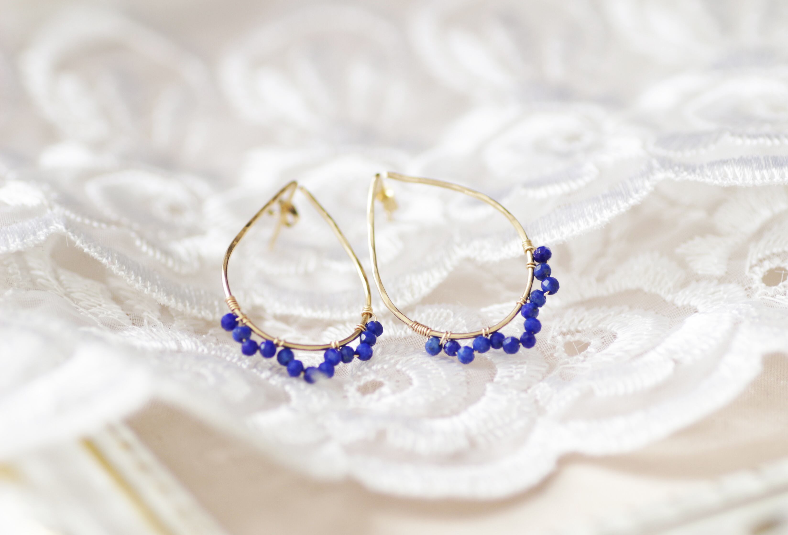 大きめ(約3cm)のドロップモチーフを、小さな青いシードで飾ったピアスです。