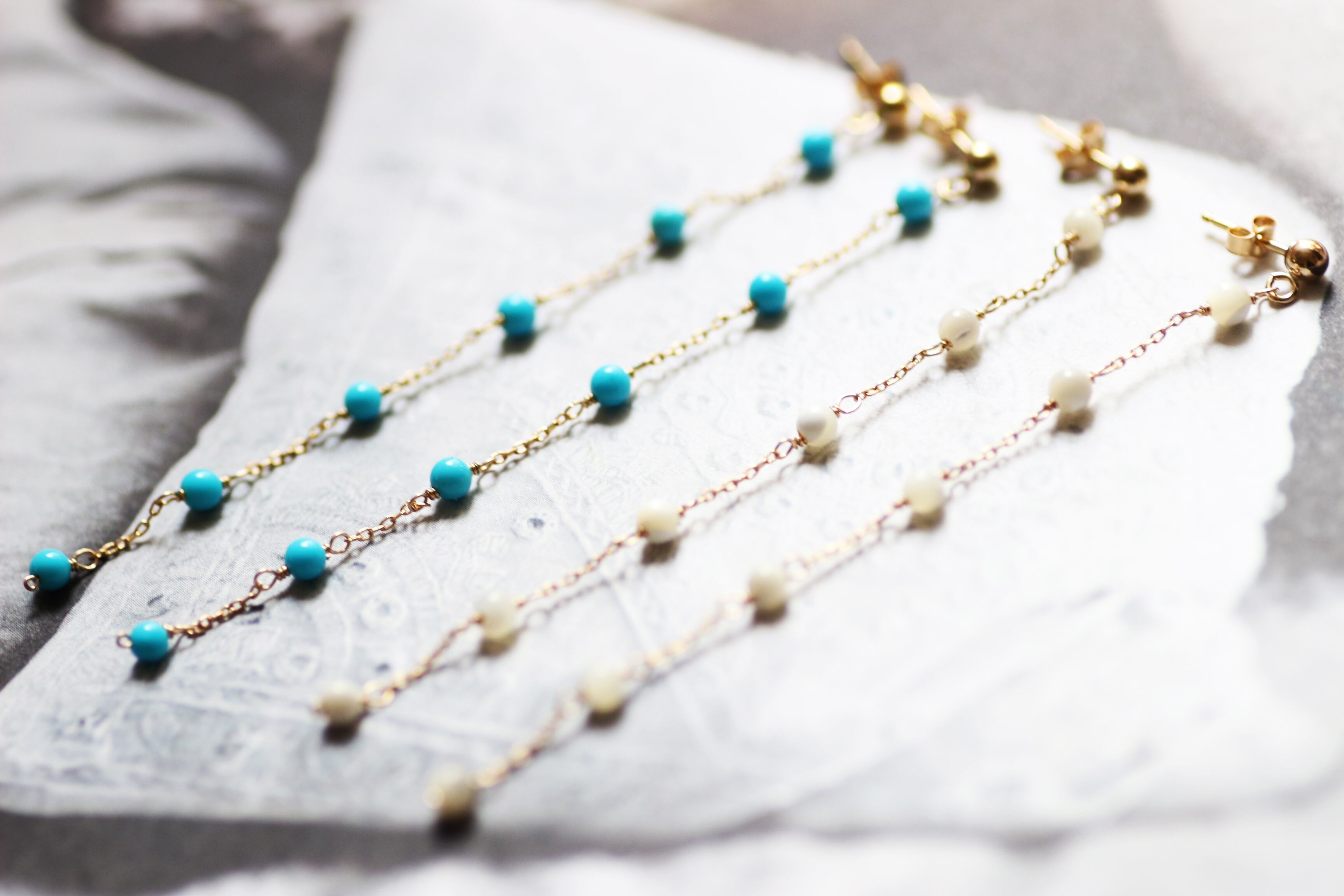 つるんと丸いMOP(マザーオブパール)を華奢なチェーンで繋げた、