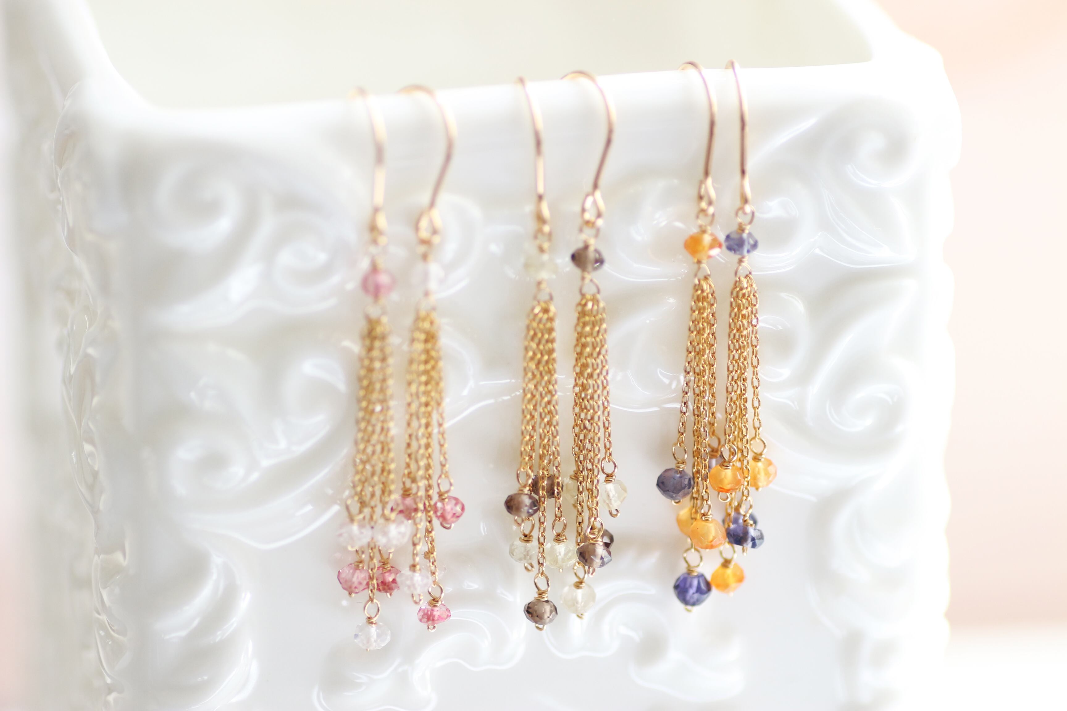 小粒の天然石がチェーンの先であられの様に、キラキラ揺れる動きのあるピアスです。