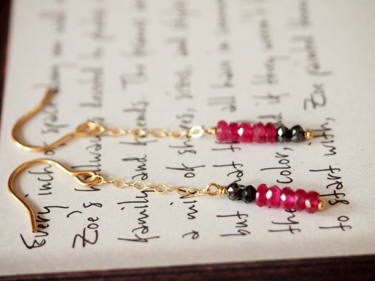 ルビーとブラックダイヤモンドがチェーンの先で揺れるピアスです。