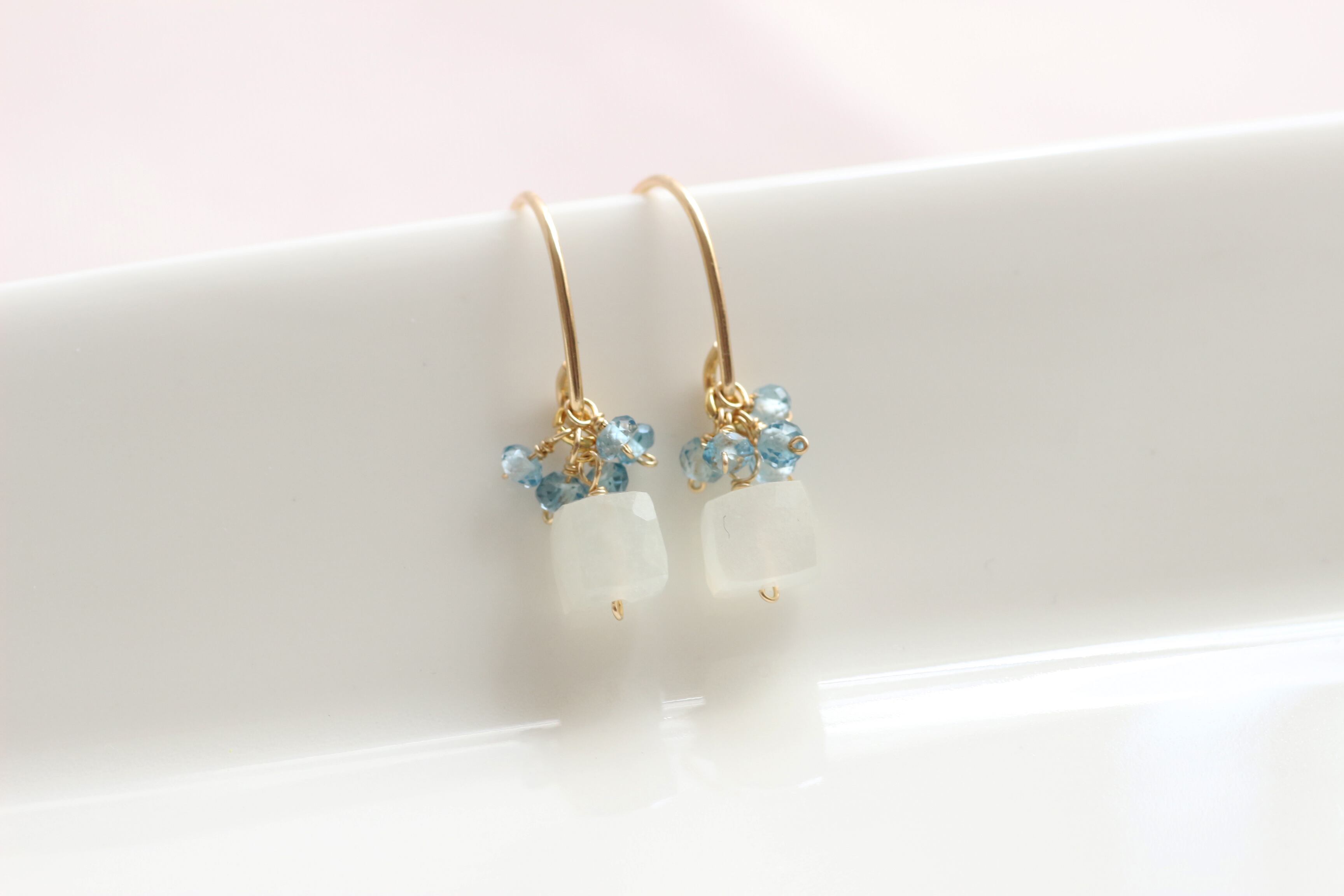 キューブ型のムーンストーンに小粒のブルートパーズ添えた華奢なピアスです。