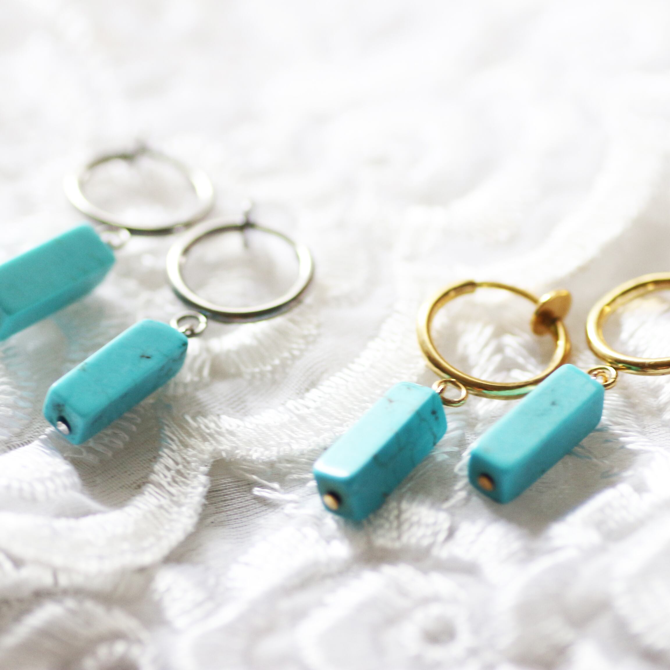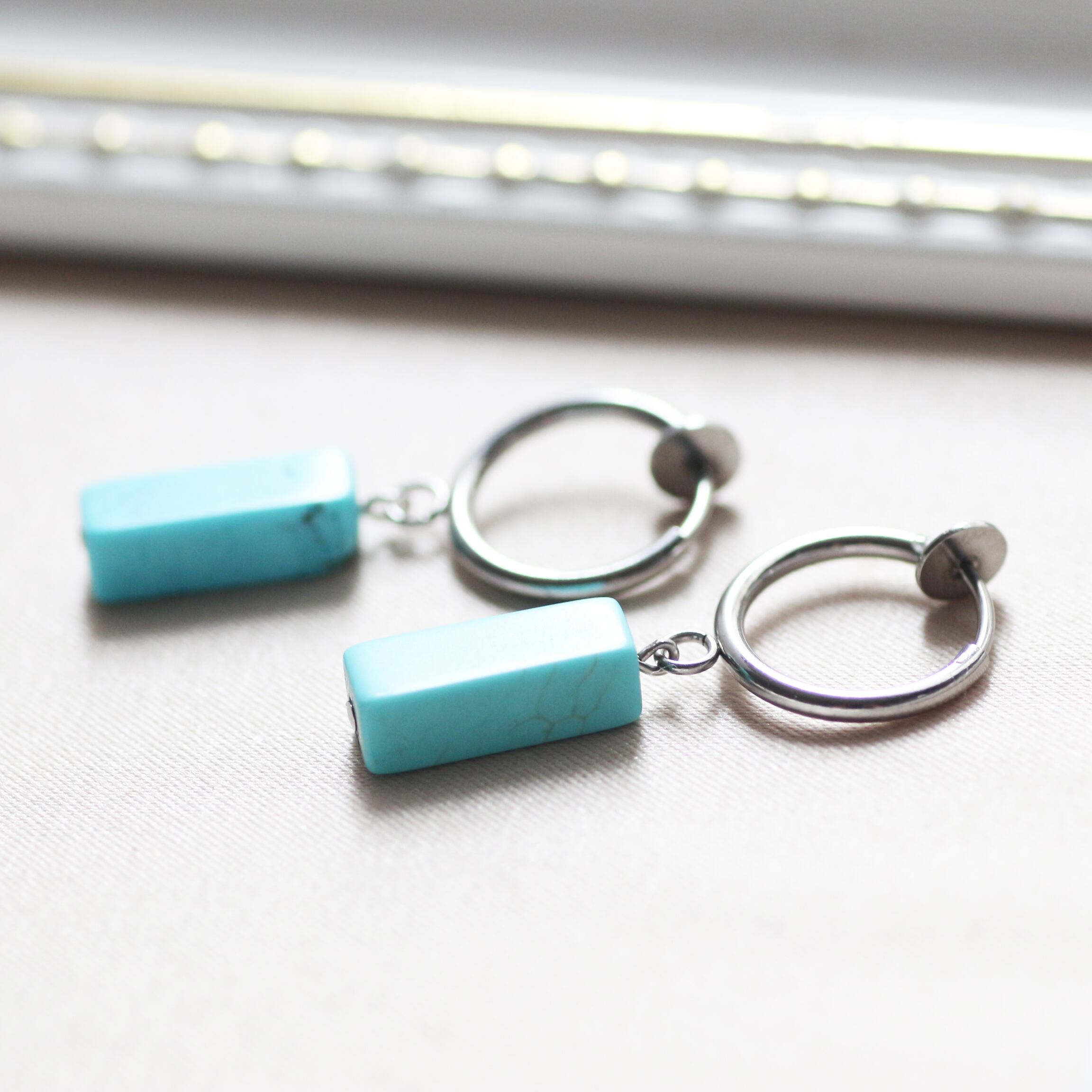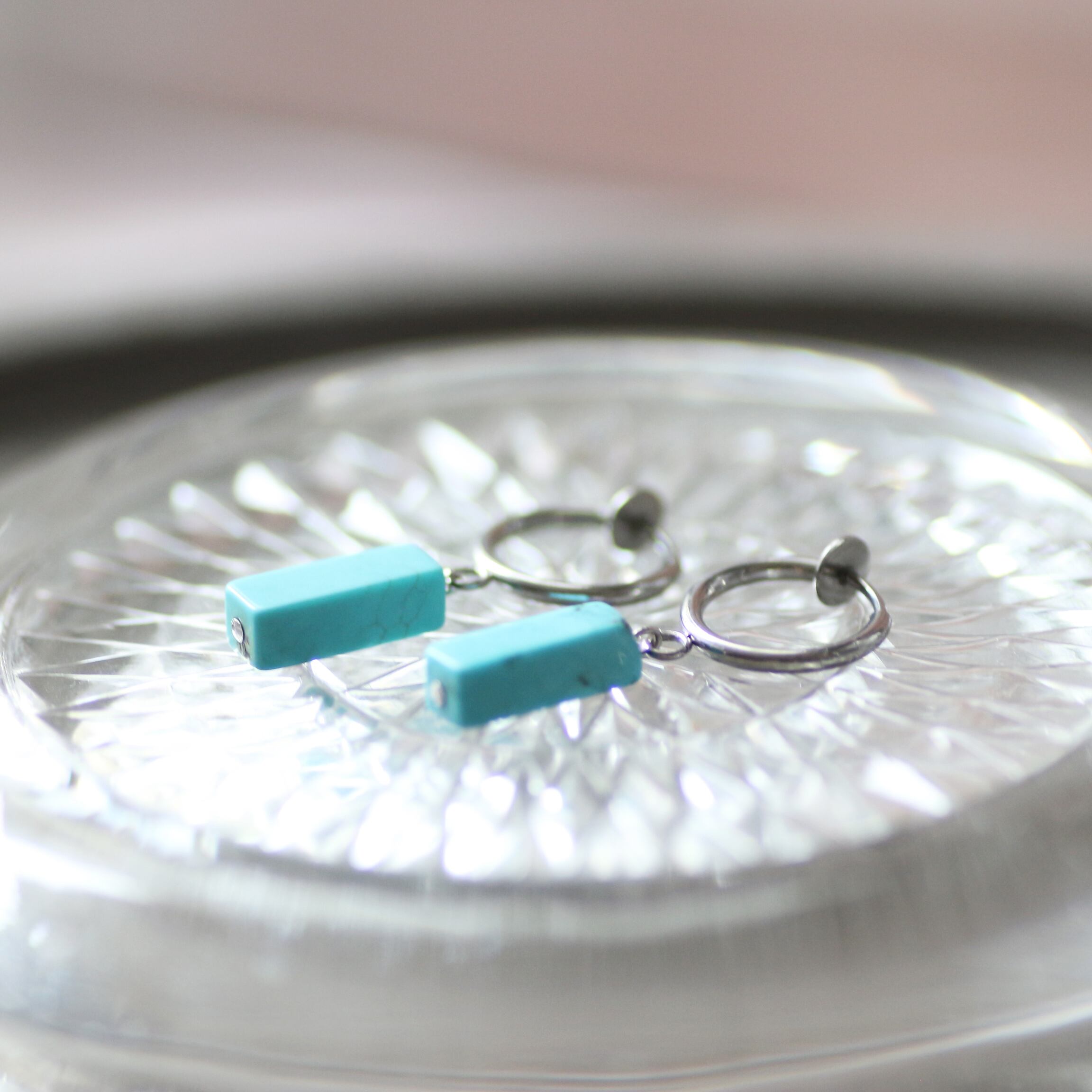 SVカラー ステンレス フープ フープイヤリング イヤリング 天然石 ジュエリー アクセサリー カラーストーン ハンドメイド ギフト 夏色 ターコイズブルー マグネサイト キューブ 長方形 シンプル 一粒 スタイリッシュ クール 夏ギフト プレゼント デイリー