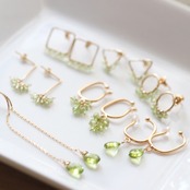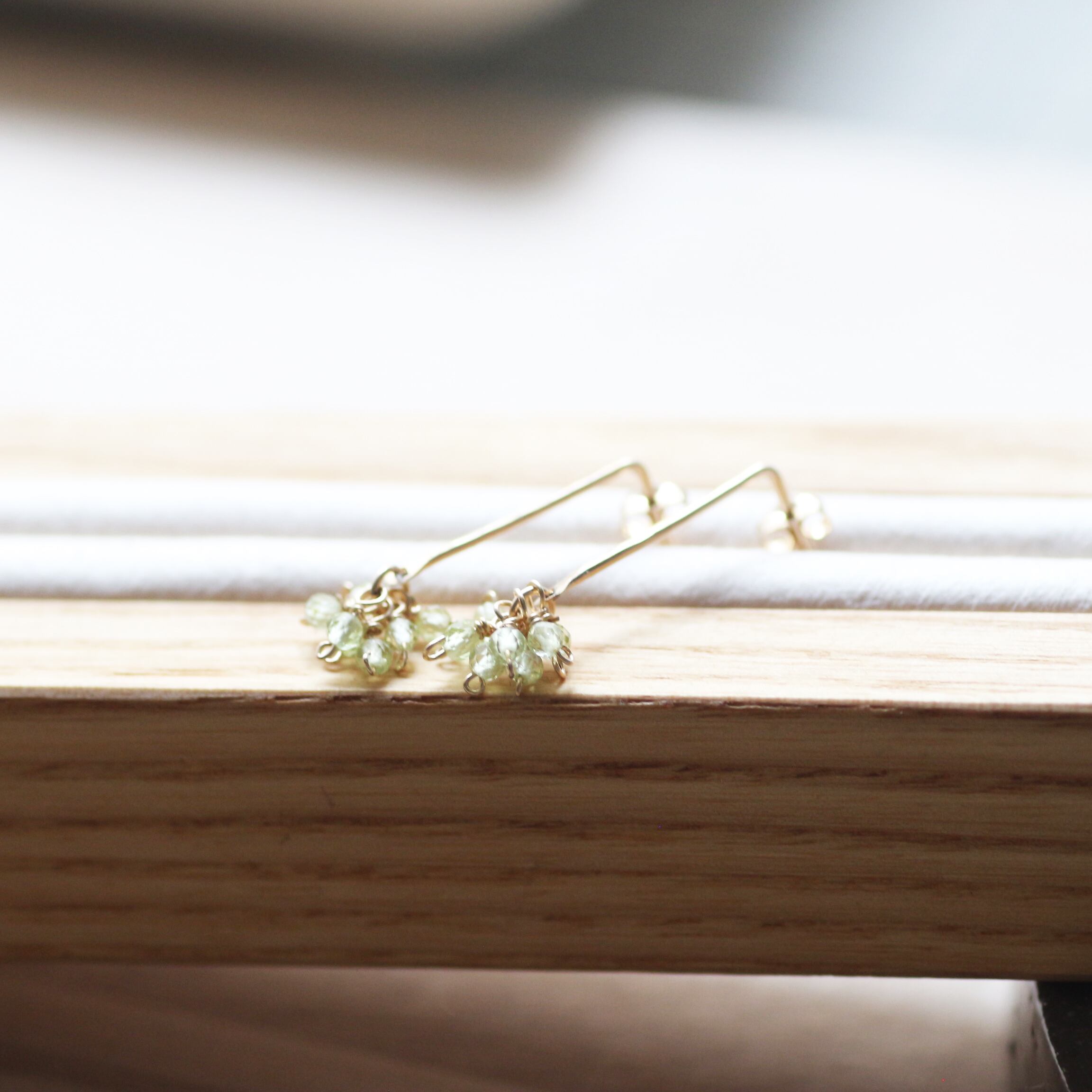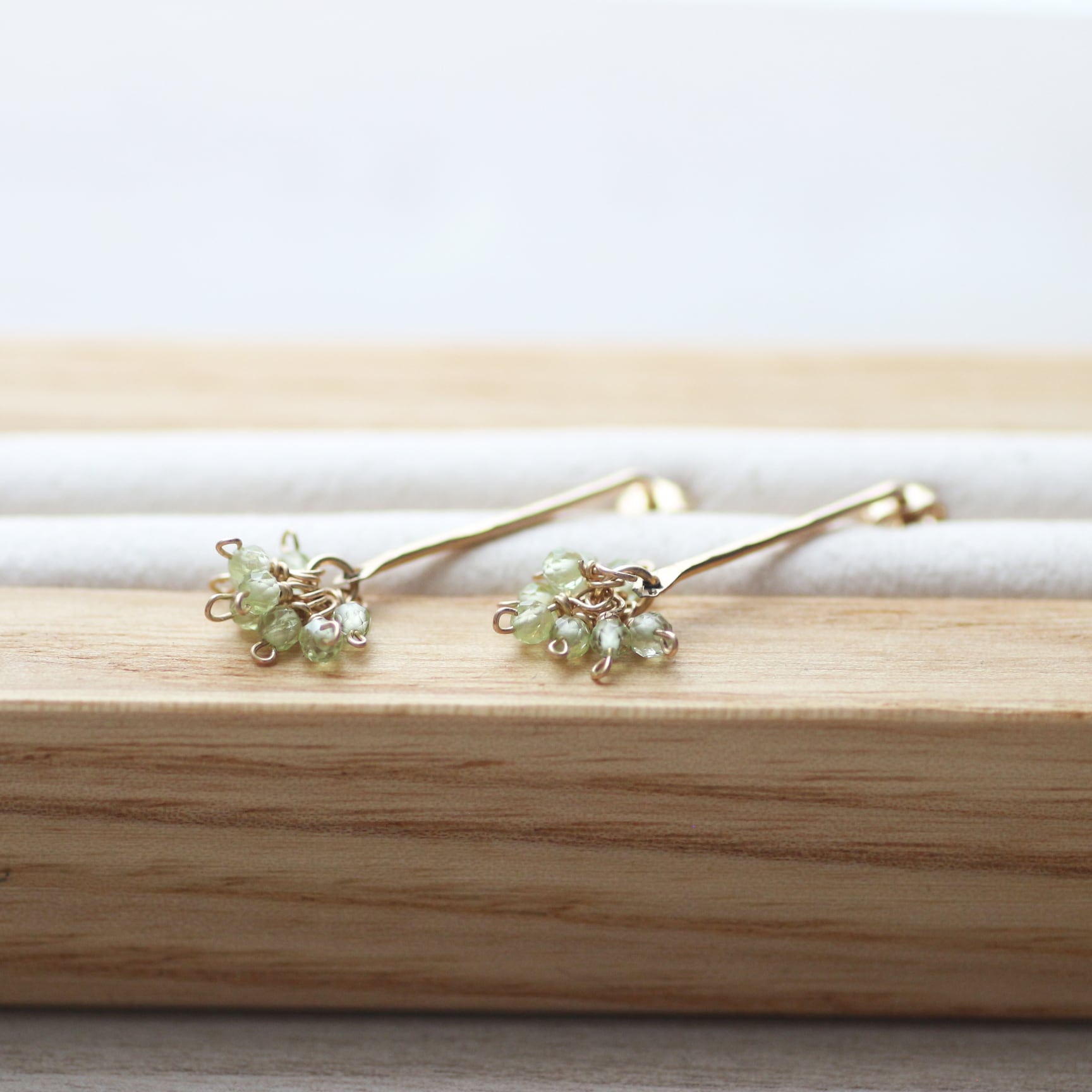 極小ペリドットをぎゅっと集めた、シンプルだけどちょこっとアクセントにもなってくれそうなピアスです。