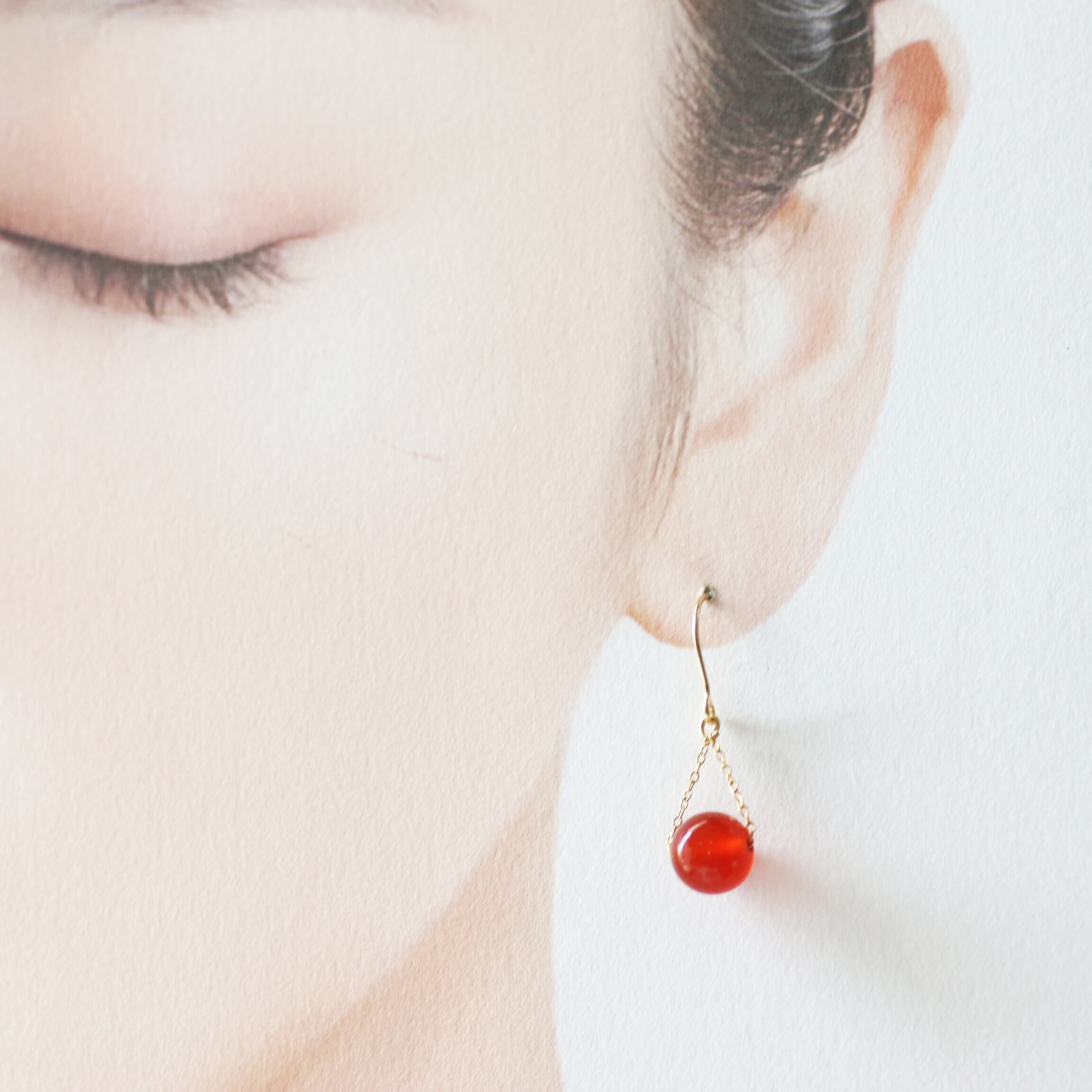 つるんとまん丸な落ち着いた赤茶色、レッドアゲートのシンプルな一粒の揺れるピアス。