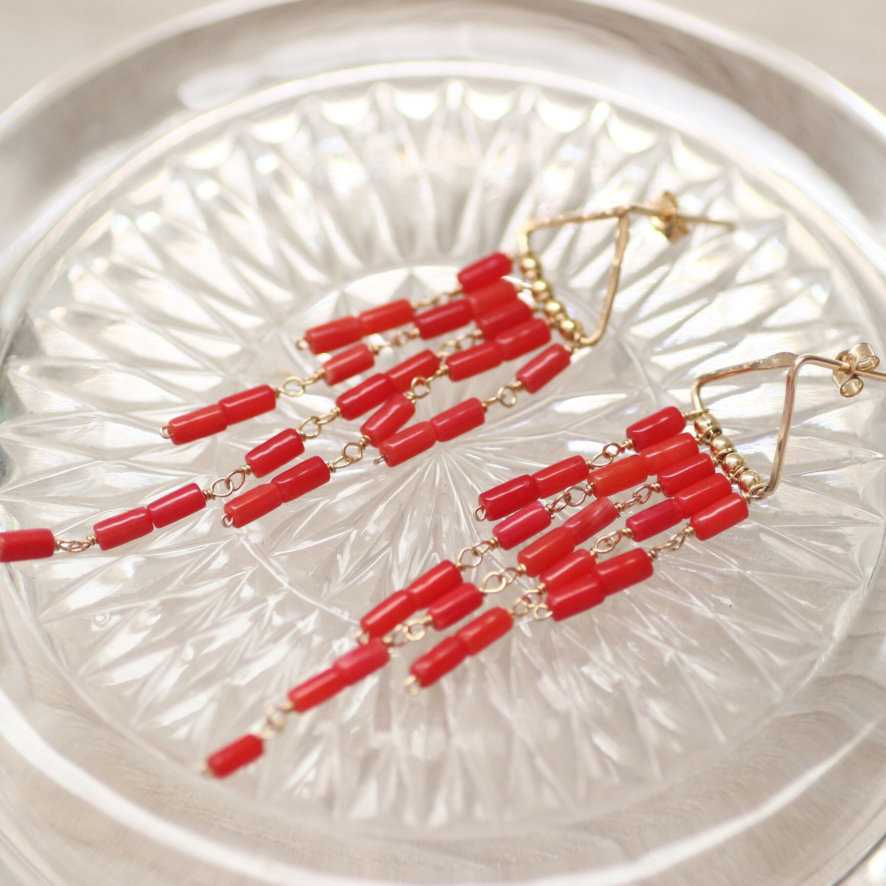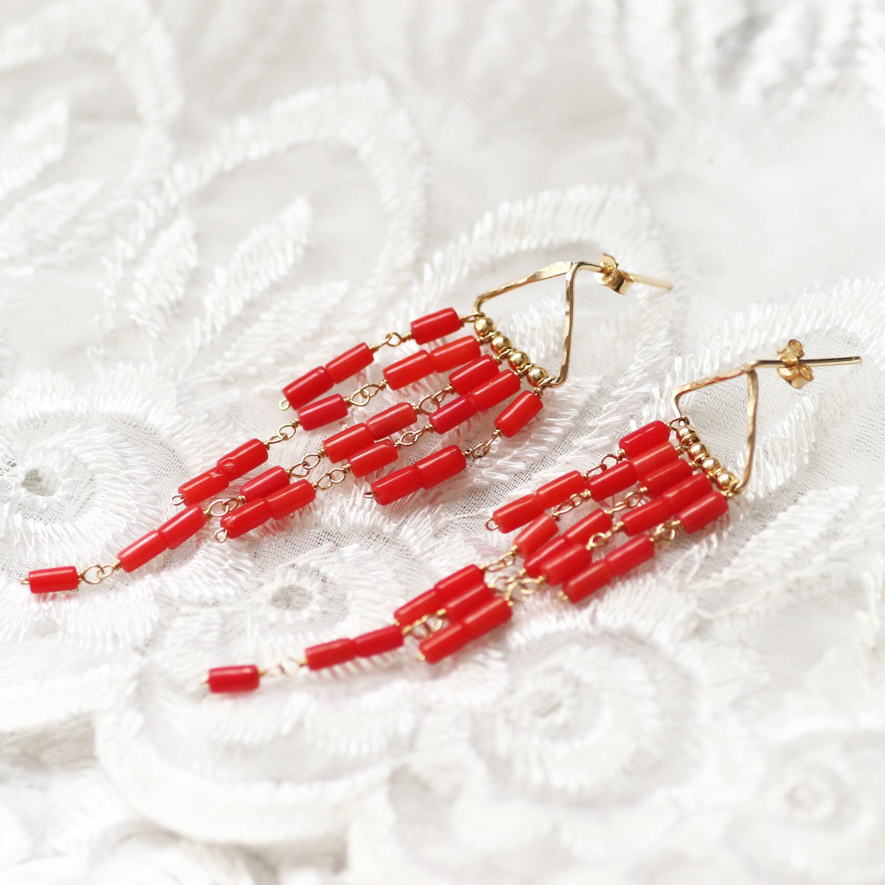 繊細なスティック状の赤珊瑚が耳元でひらひらと揺れ、シンプルな装いのアクセントとしてお楽しみいただけれればと思います。