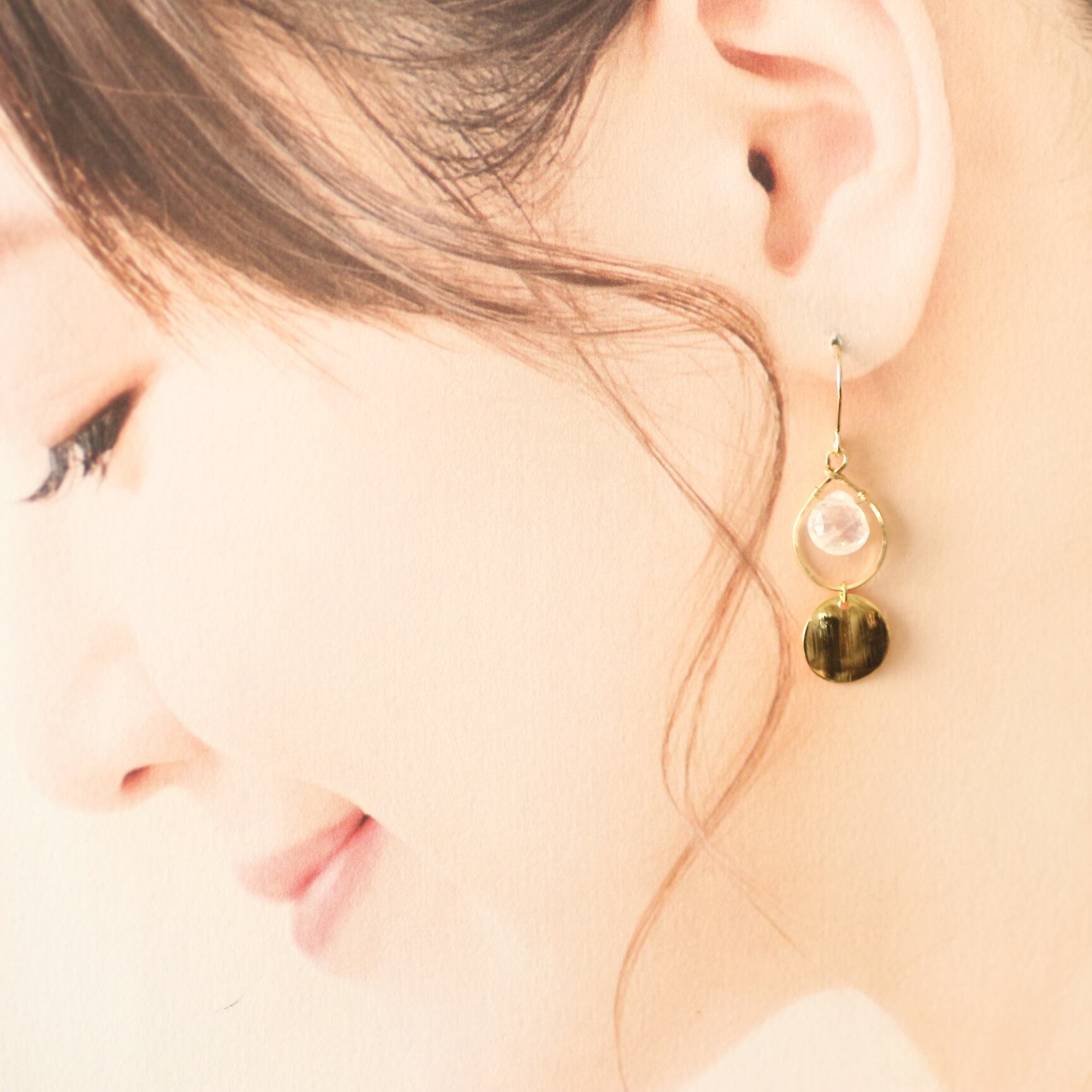 フルムーン、満月に見立てたK14gfの丸いプレートを添え、揺れるたびにシラーやプレートが光を拾って女性らしい上品な輝きを放ちます。