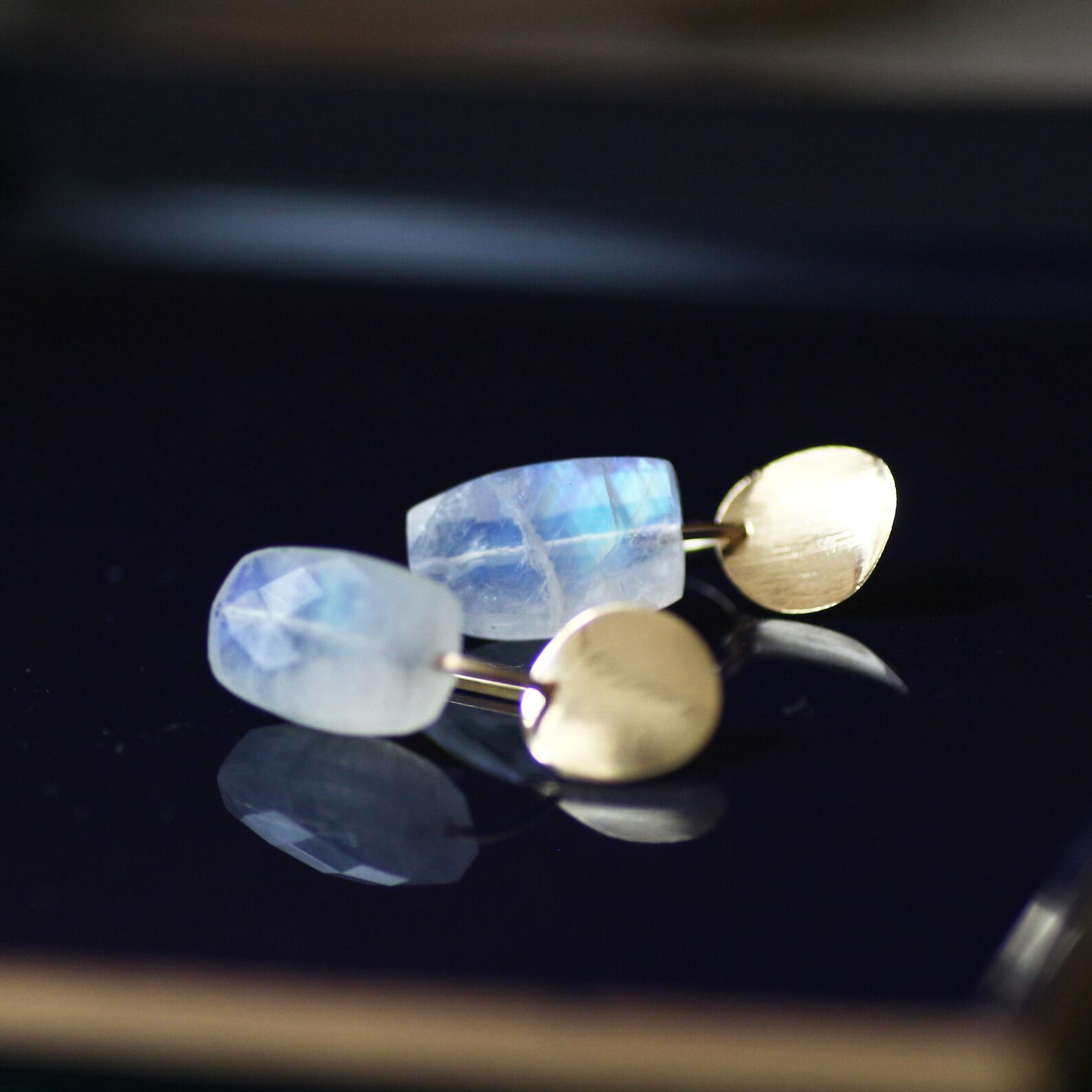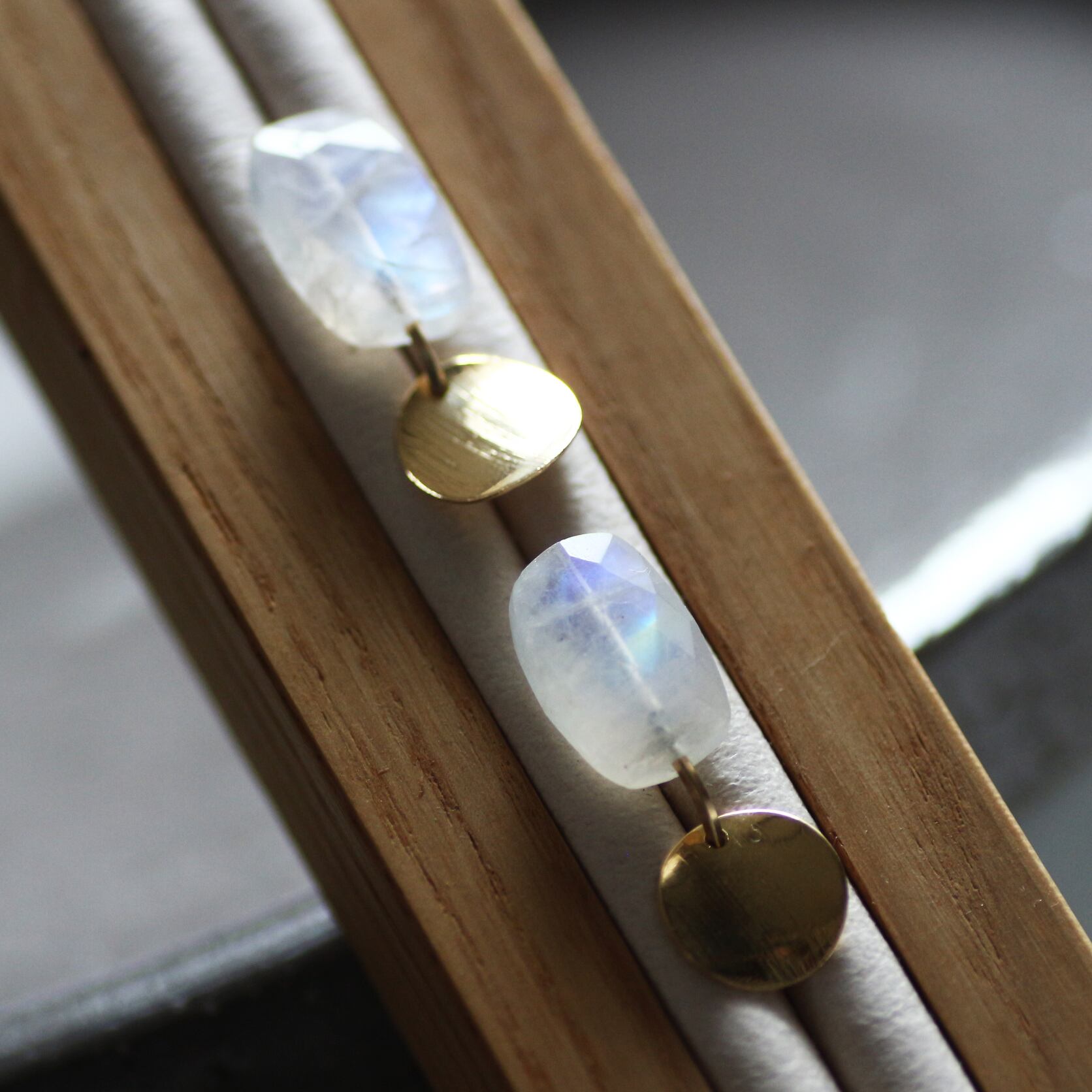 取り外し可能なフルムーン、満月に見立てたK14gfの丸いプレートを添え、揺れるたびにシラーやプレートが光を拾って女性らしい上品な輝きを放ちます。