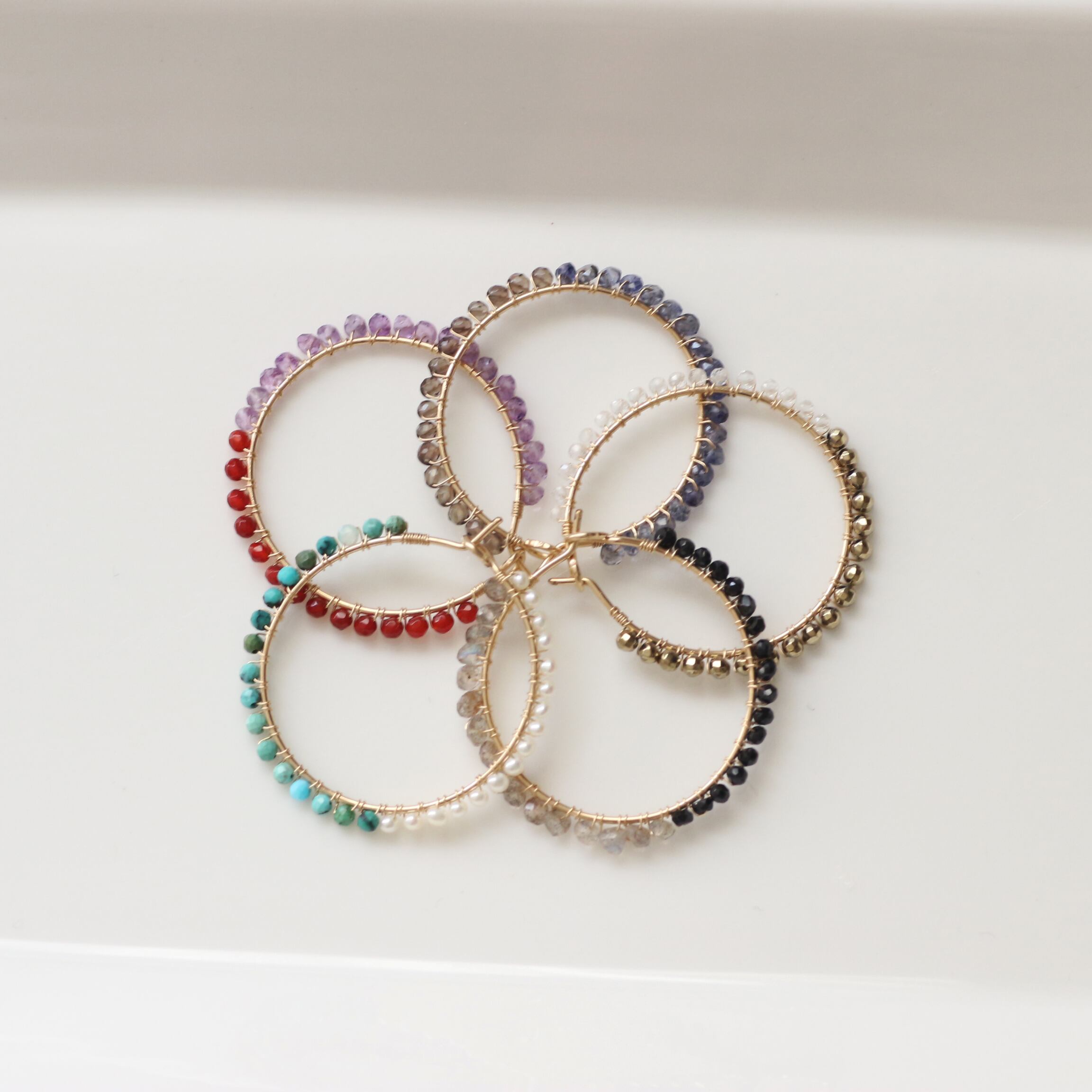 少し大きめ(約内径2.6cm)のフープに極小の天然石をギュッと巻きつけた大人の色合いピアスです。