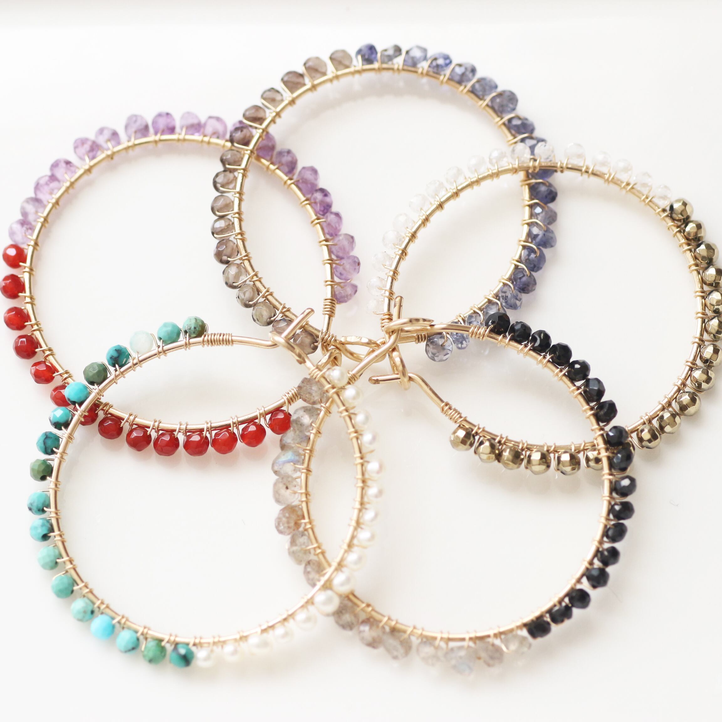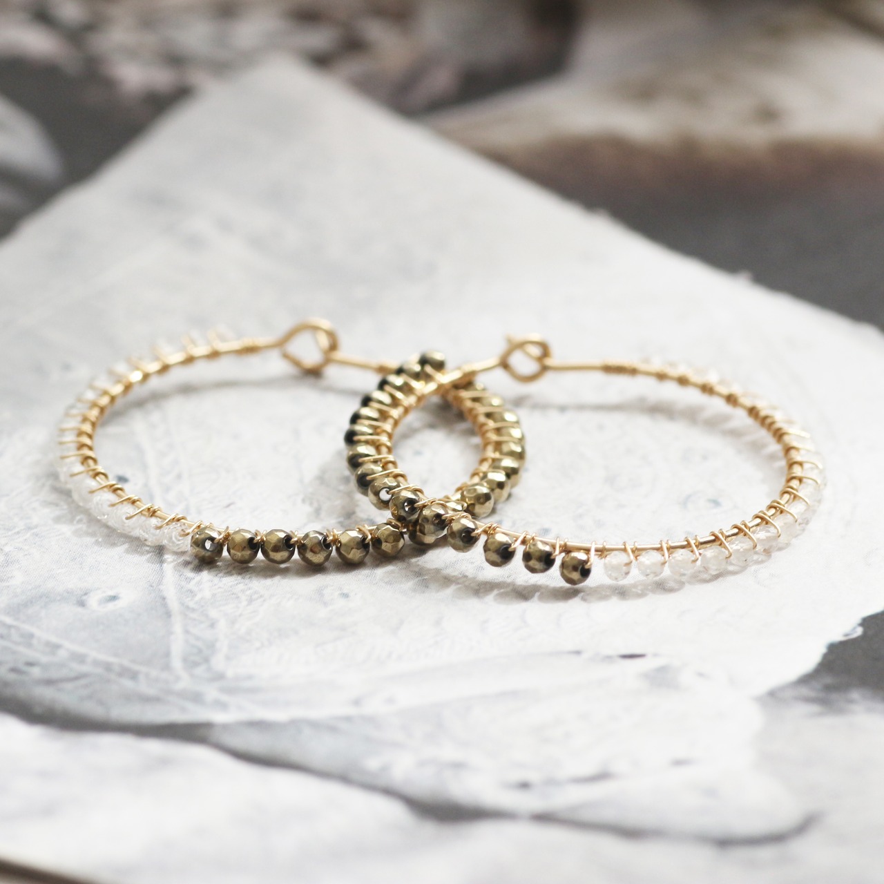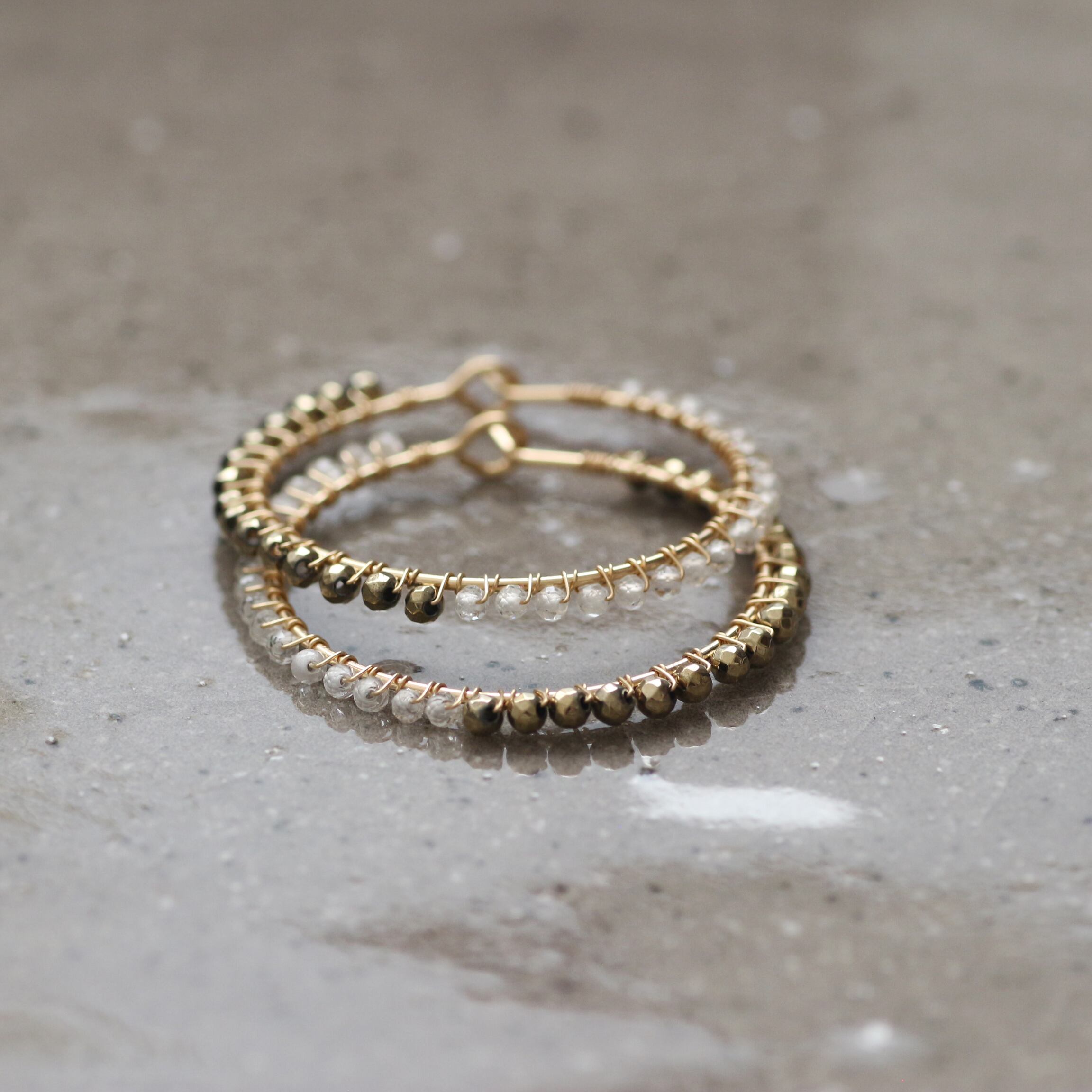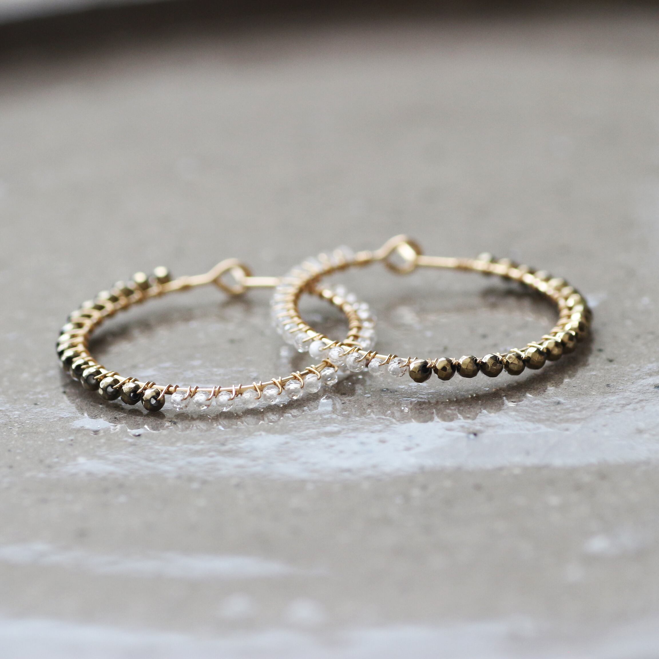 少し大きめ(約内径2.6cm)のフープに極小の天然石をギュッと巻きつけた大人の色合いピアスです。
