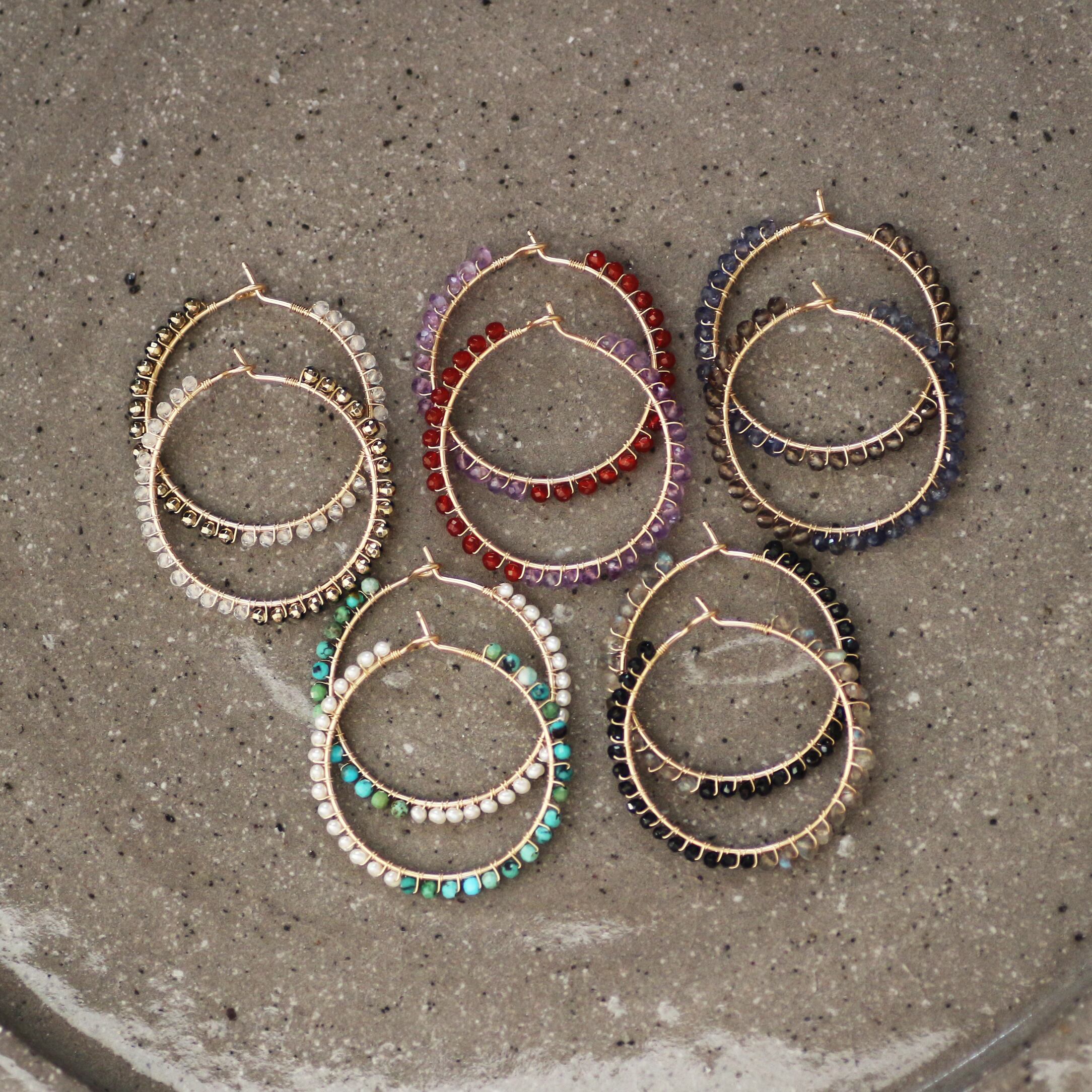 少し大きめ(約内径2.6cm)のフープに極小の天然石をギュッと巻きつけた大人の色合いピアスです。