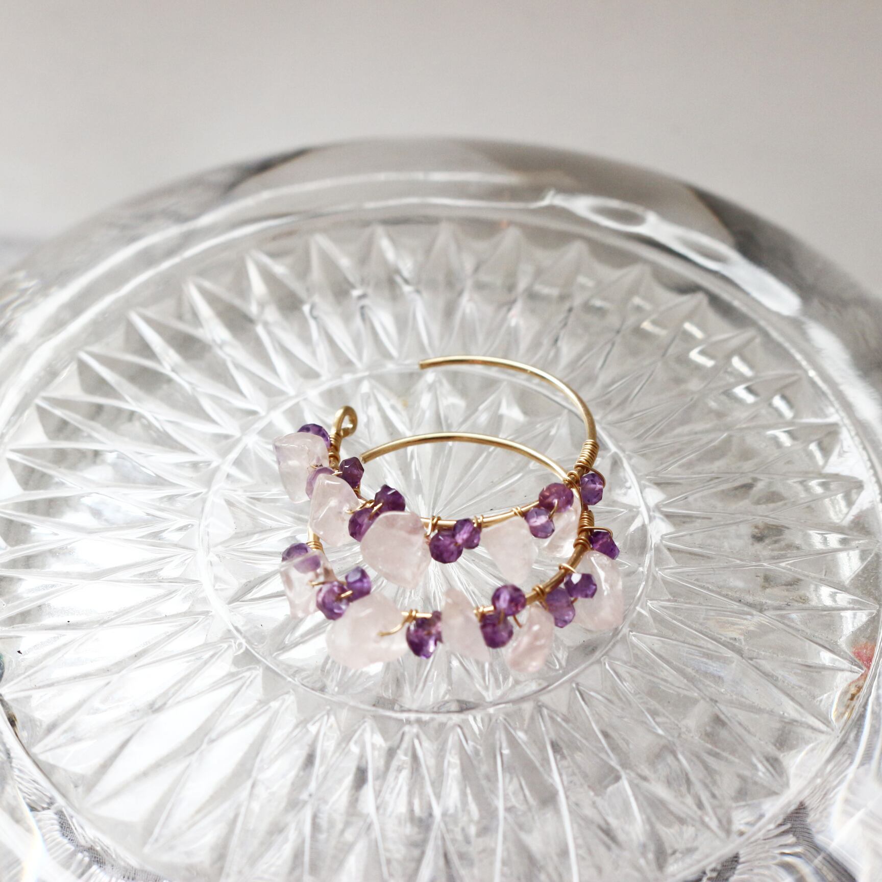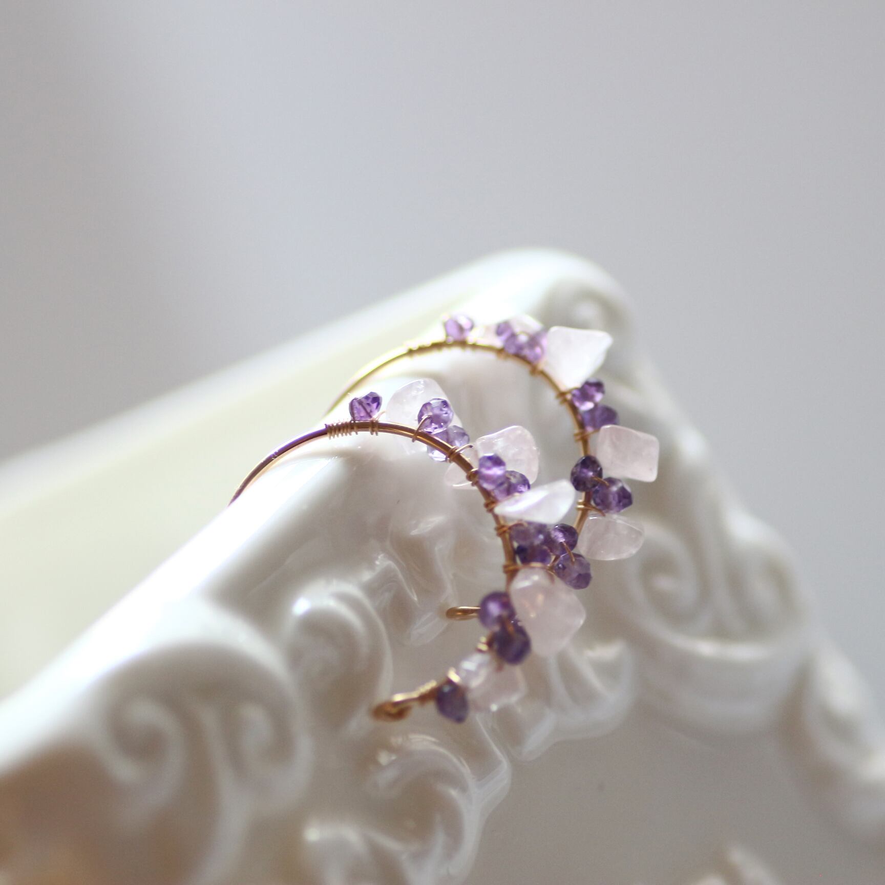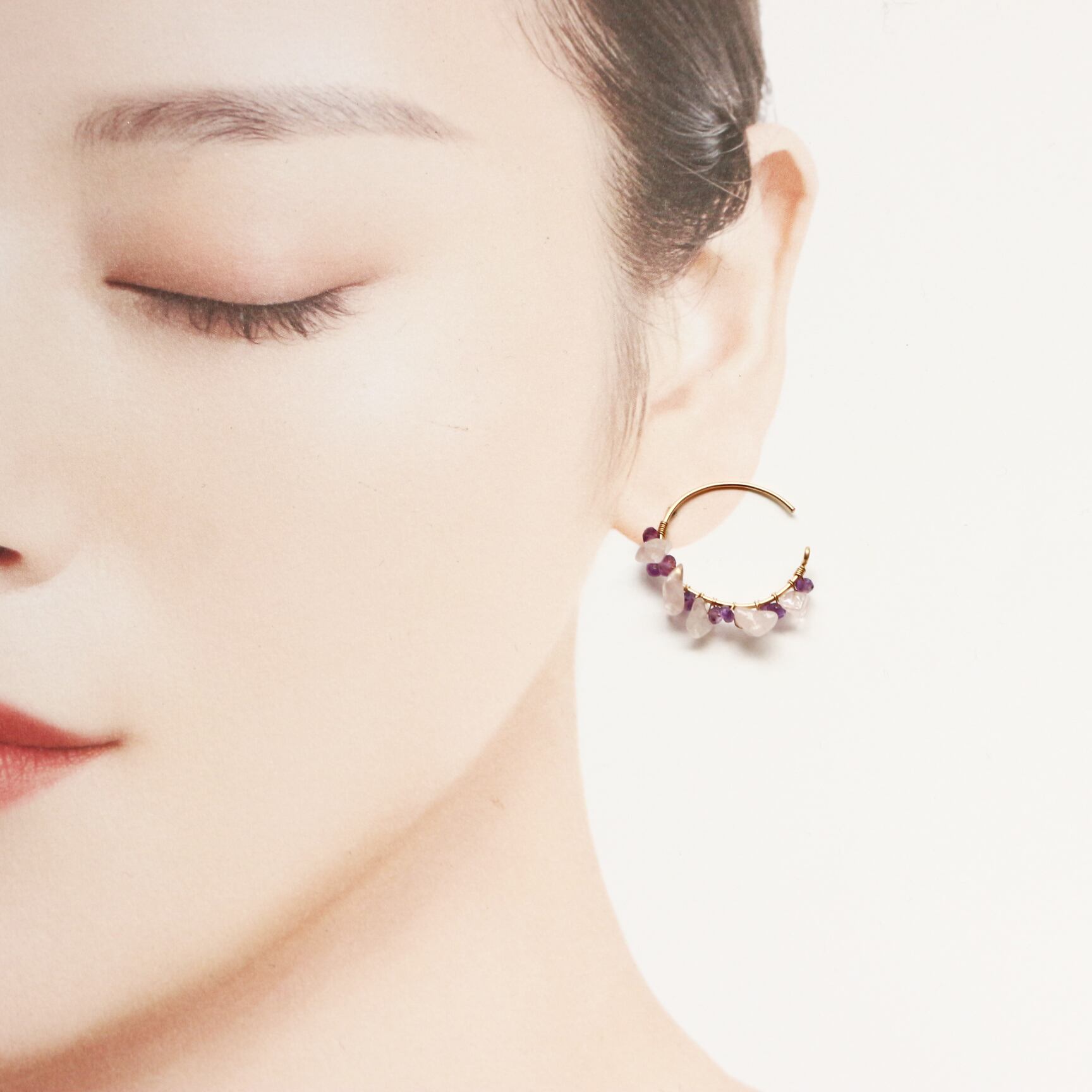 その中でも今回は、女性らしい控えめなピンク色のローズクォーツをメインに、アクセントとしてアメシストの高貴な色味をプラスし、カトレアをイメージしたフープピアスに仕立てました。