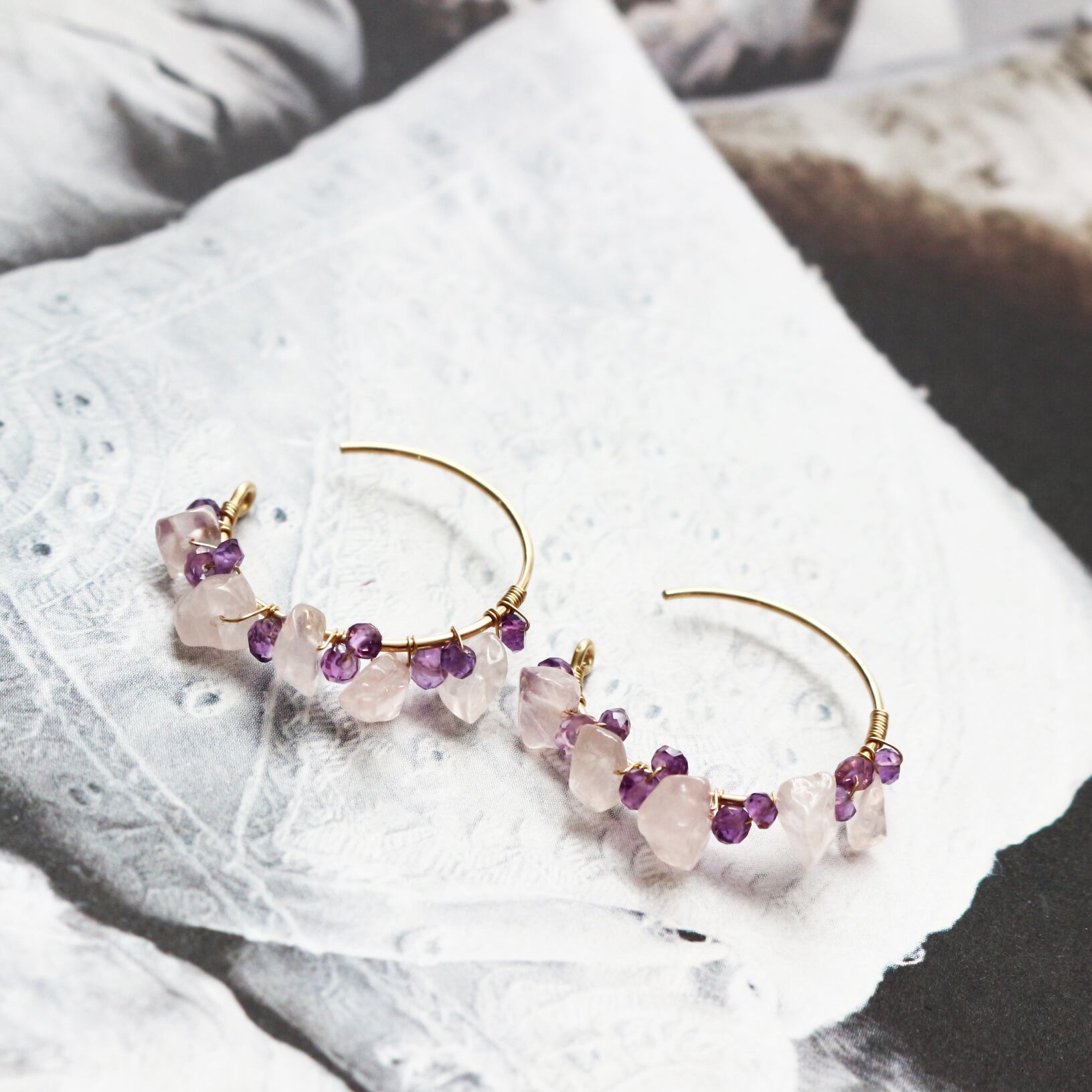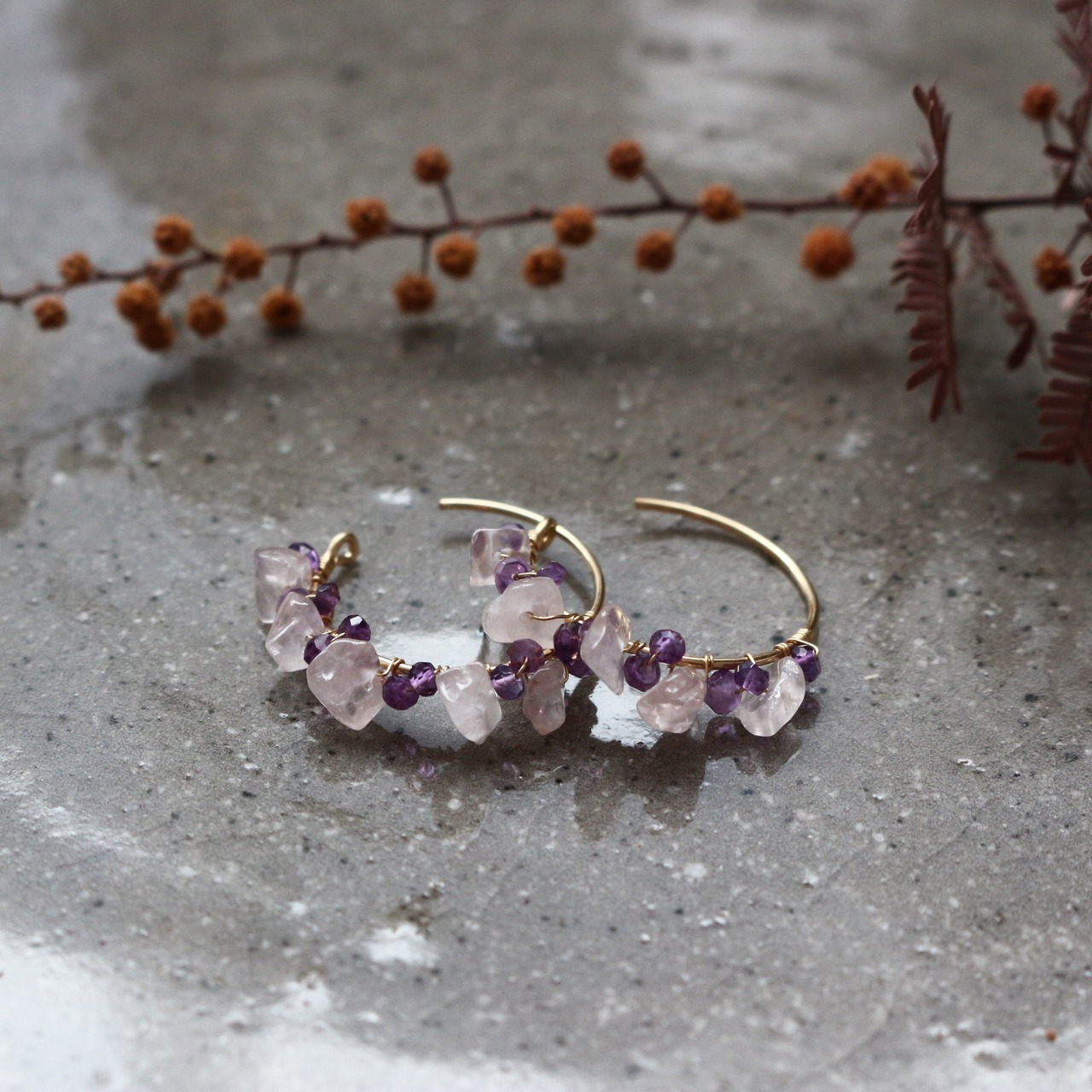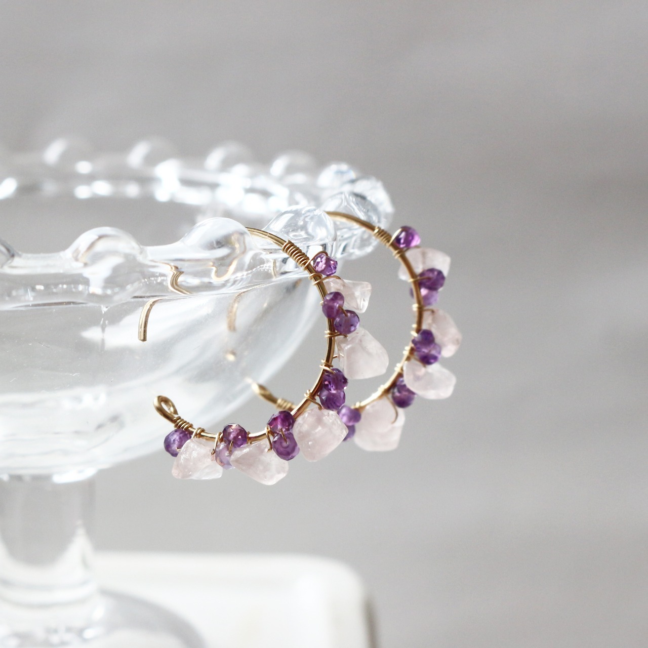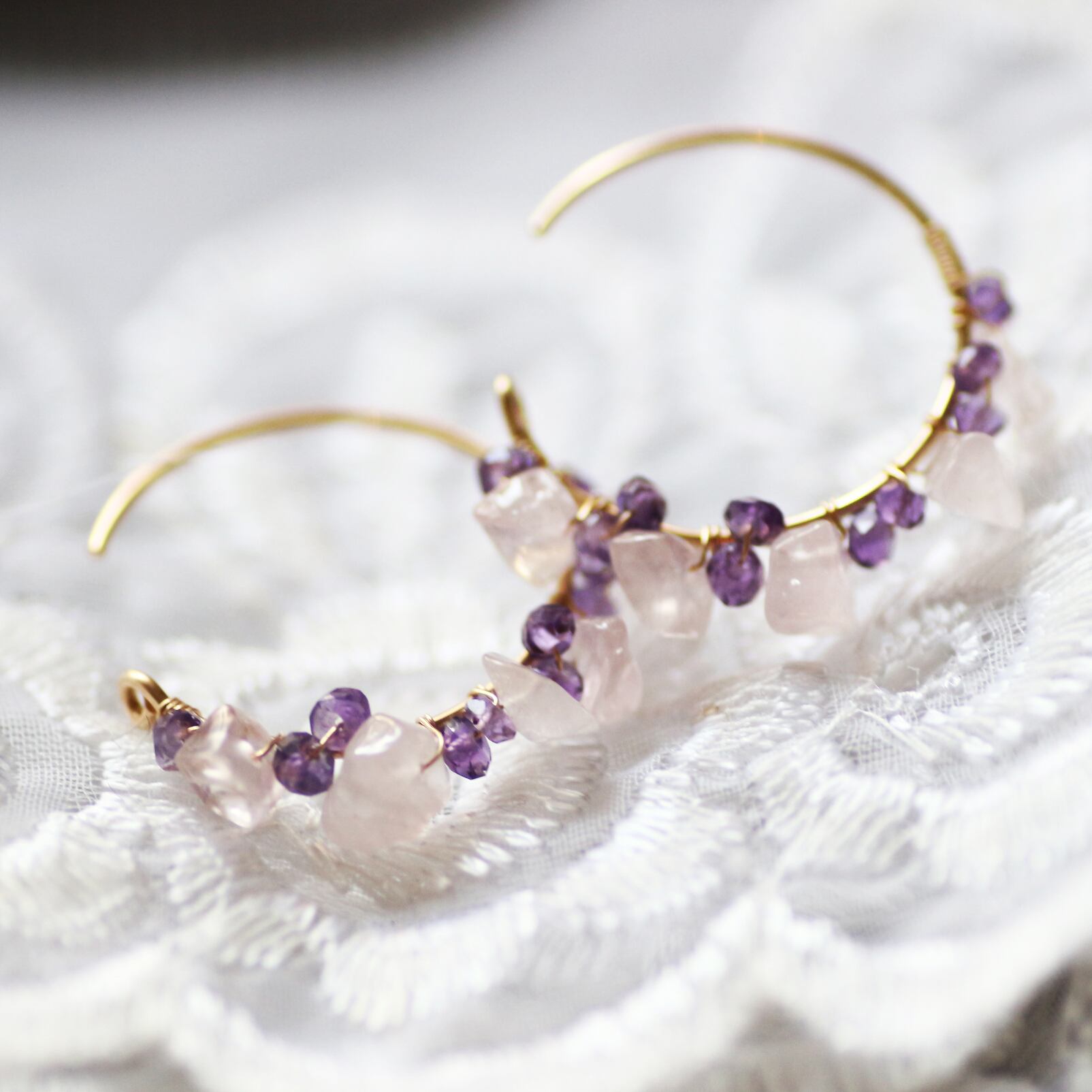 その中でも今回は、女性らしい控えめなピンク色のローズクォーツをメインに、アクセントとしてアメシストの高貴な色味をプラスし、カトレアをイメージしたフープピアスに仕立てました。