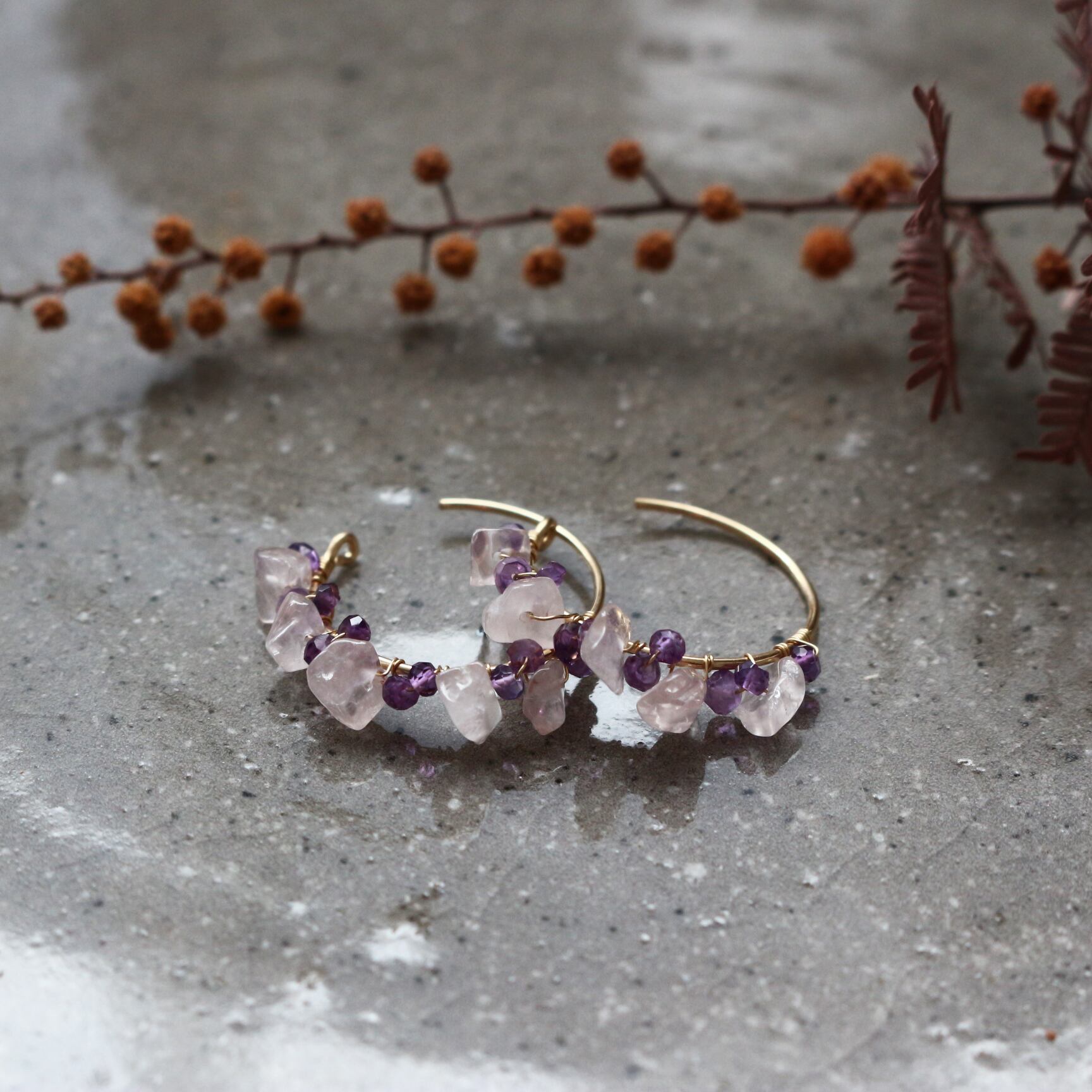 ーーーーーーーーーーーーーーーーーーーーーーーーーーーーーーーーーーーーーーーーーーーーーーーーーーーーーーーーーーーーーーーーーーーーーーーーーーーーK14gf ゴールドフィルド 天然石 ジュエリー アクセサリー カラーストーン ハンドメイド ギフト 冬の花 カトレア 上品 ローズクォーツ アメシスト ピンク 淡いピンク 紫色 パープル 花 フープピアス ピアス エレガント 冬ギフト プレゼント ご褒美 デイリー 大人可愛い