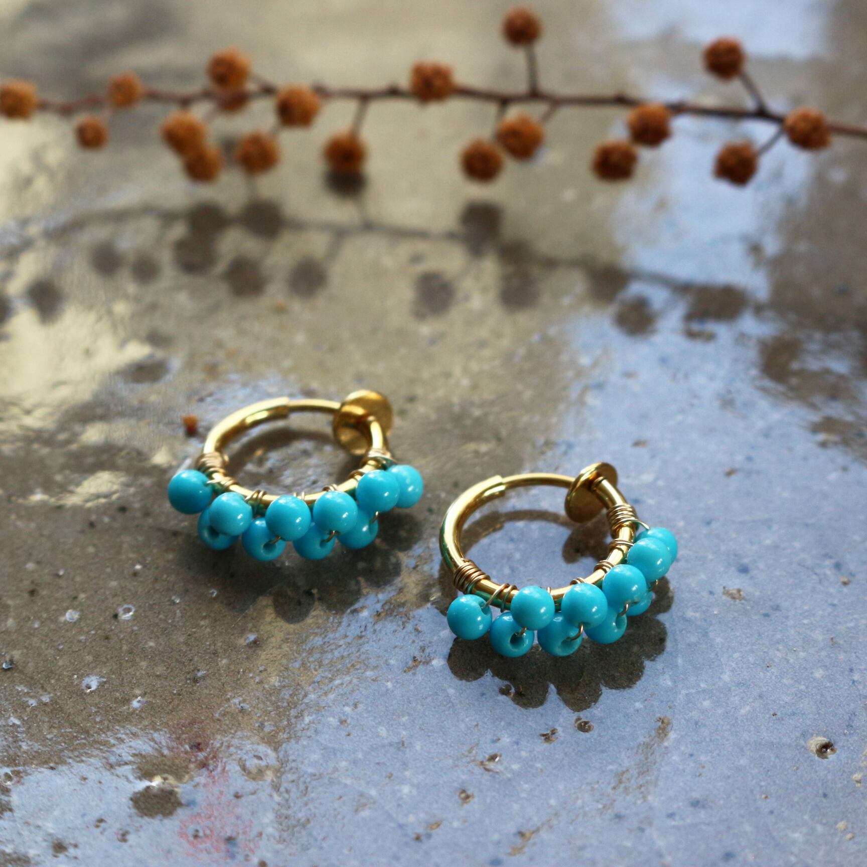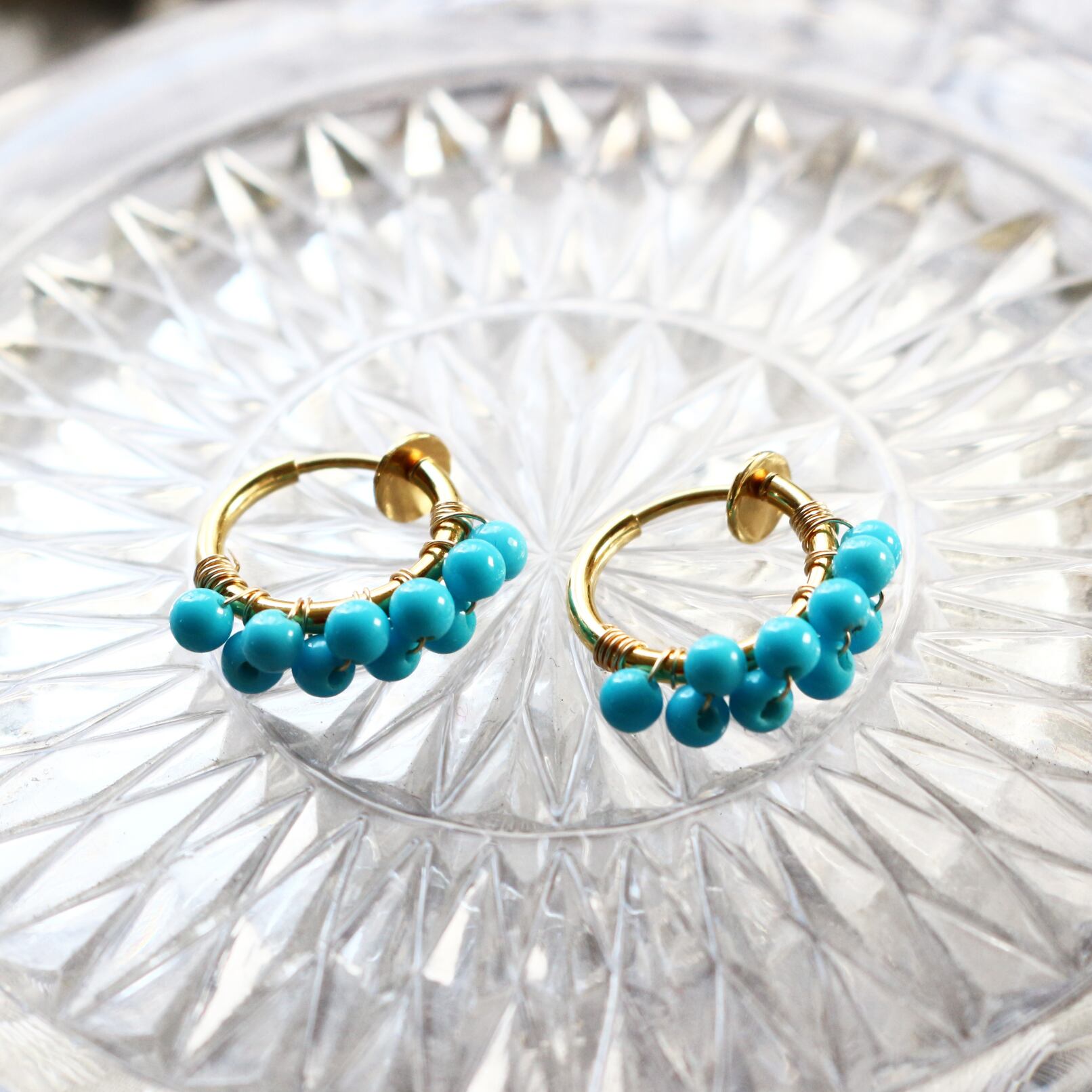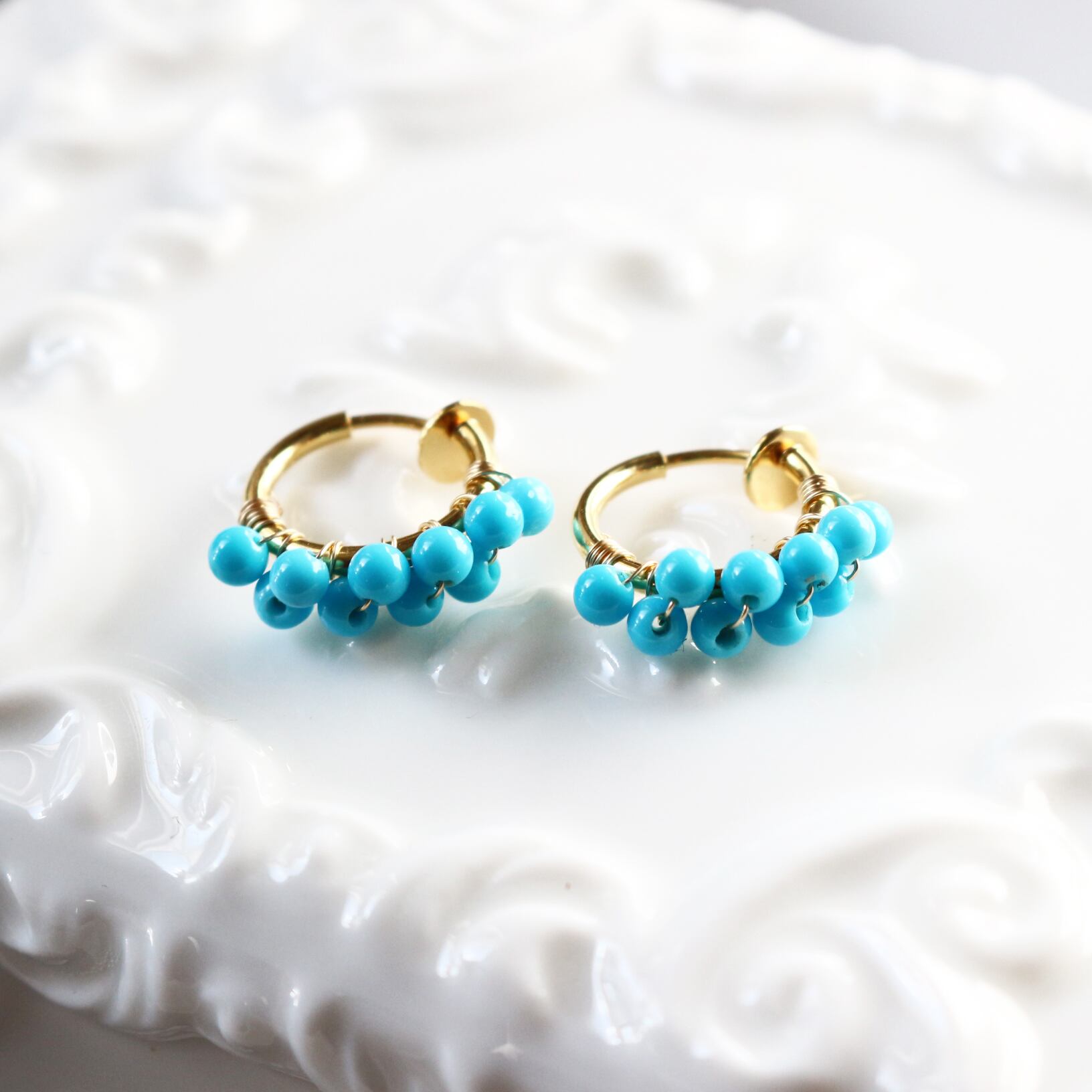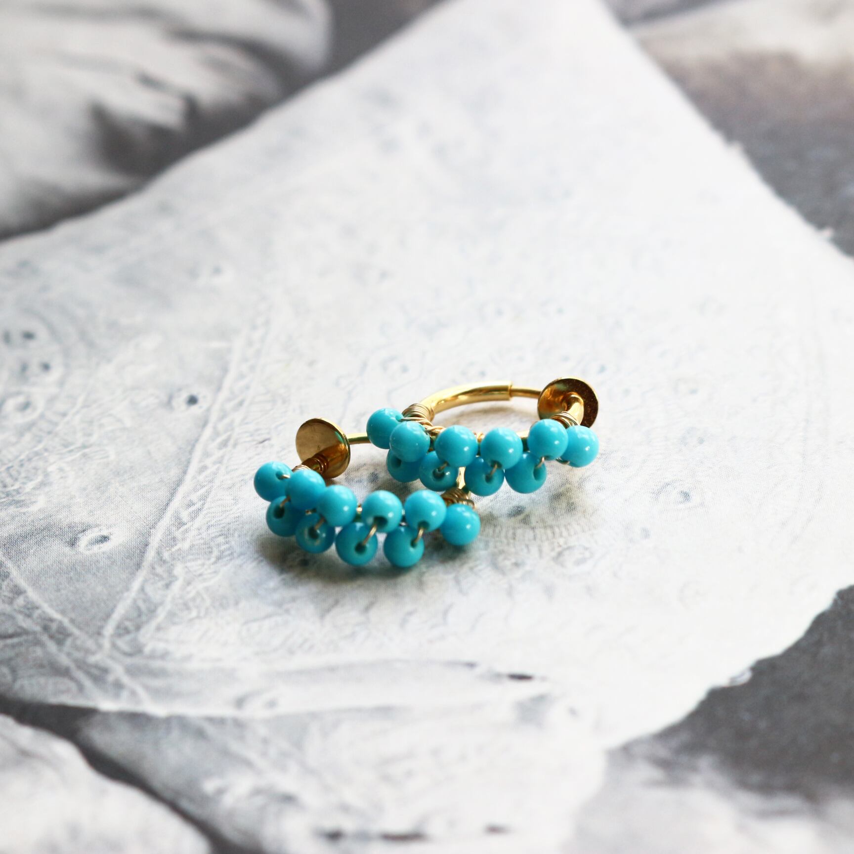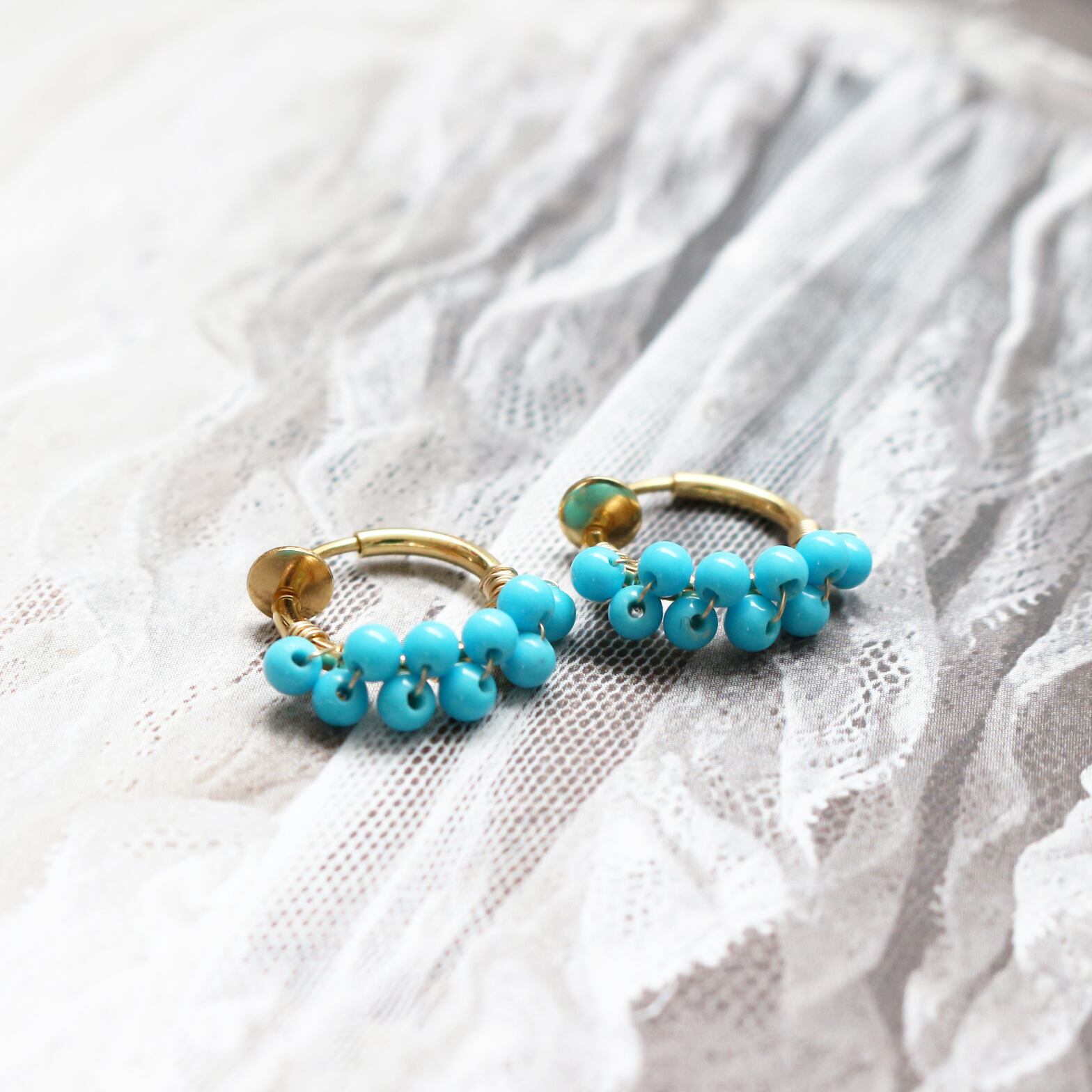 小さな丸まるなターコイズをギュッと集めたフープイヤリングです。